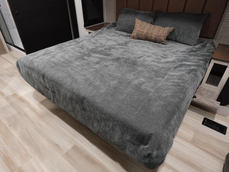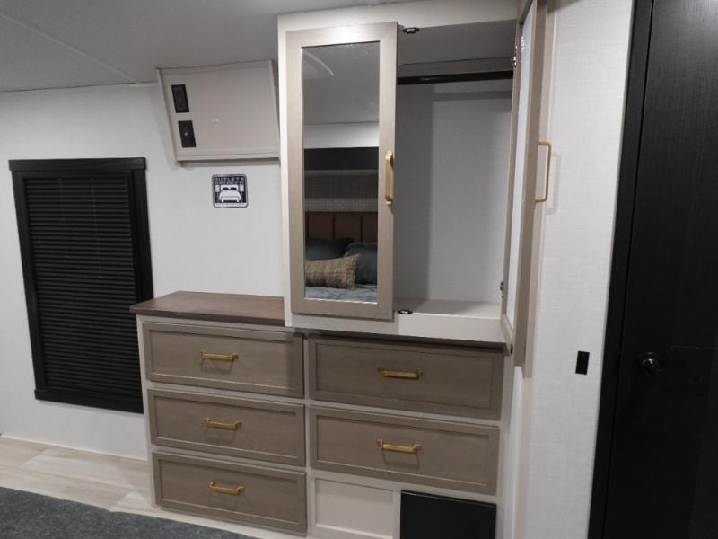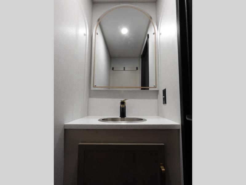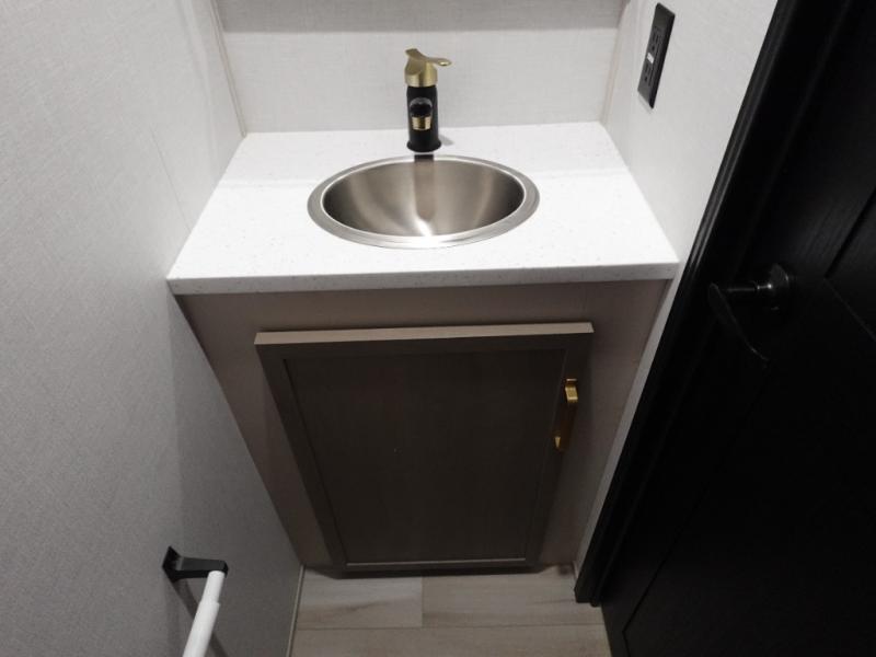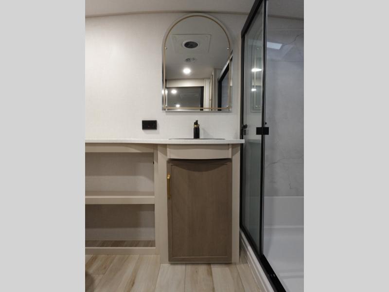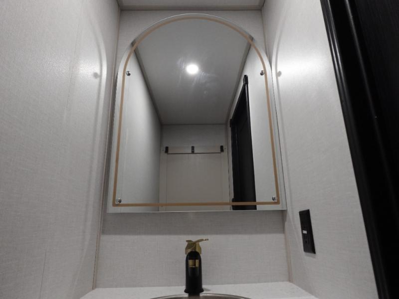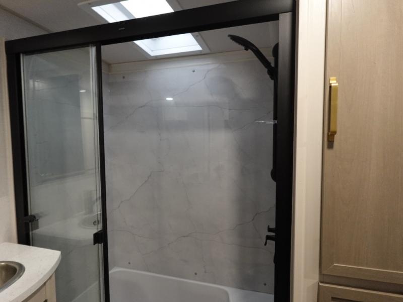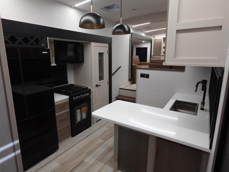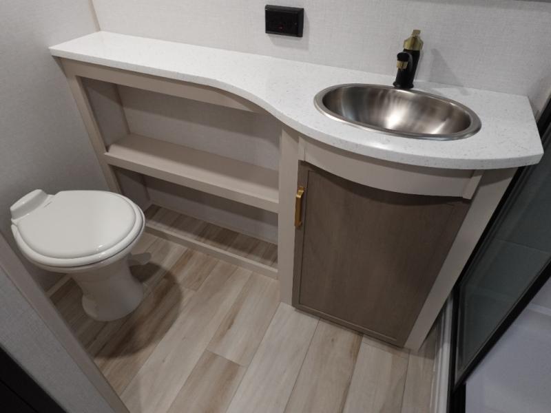 Each Wildwood Heritage Glen Elite Series fifth wheel by Forest River is constructed with vacuum bonded "Aluma Frame" sidewalls and floor, block foam insulation, and an AccessiBelly underbelly with 12V tank heaters on all holding tanks to help extend your camping season. There is an exterior docking station with hot and cold water, along with power stabilizer jacks and landing gear, and Maxxis radial tires with black accented rims. There is also an in-line water filtration system, an RV Airflow system, and an extra large pass-through storage with Slam Latch baggage doors for hassle-free packing. You will love the high-end solid surface countertops inside, along with gold-accented faucets with stainless steel sinks in all bathrooms, and summer wind colored horizontal plank linoleum flooring that is both stylish and easy to keep clean!