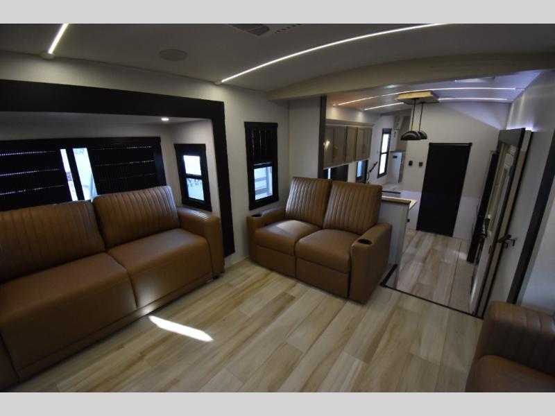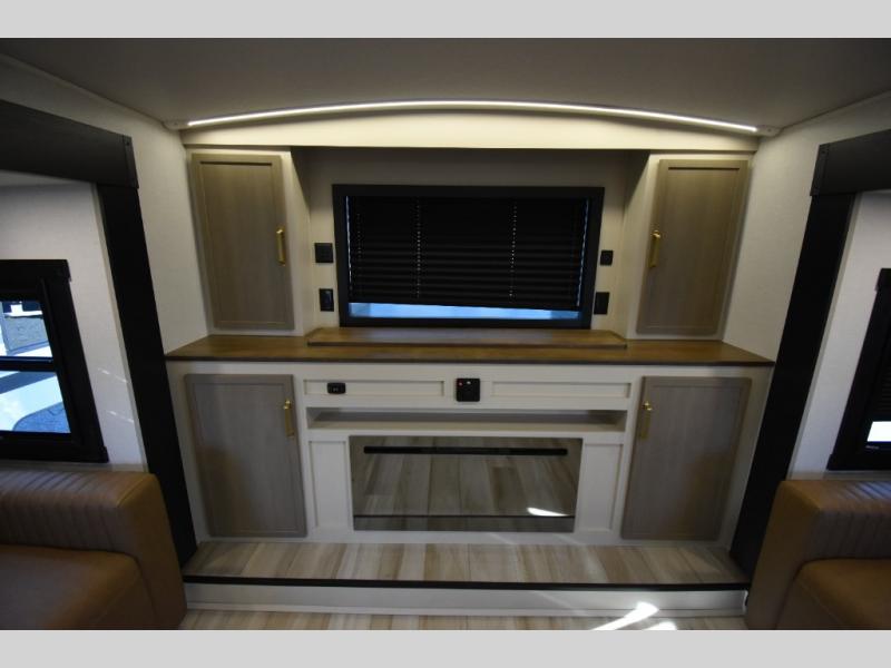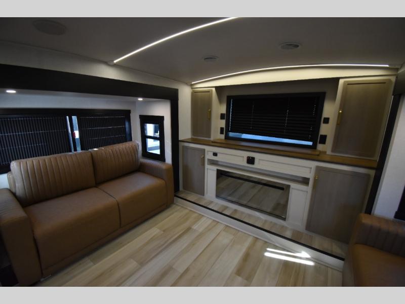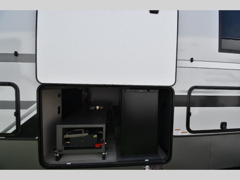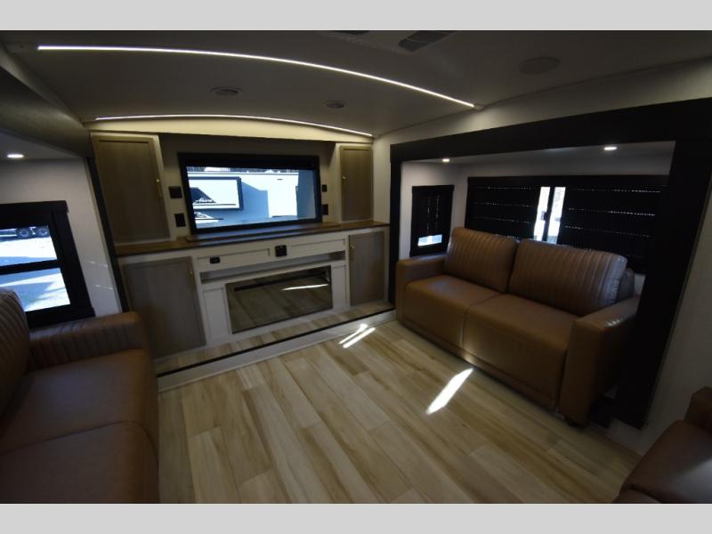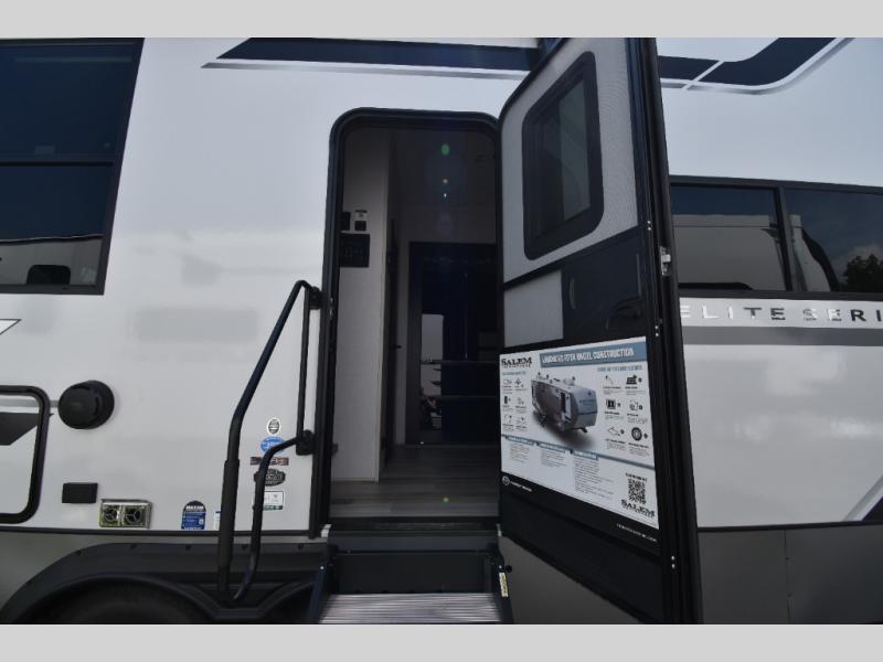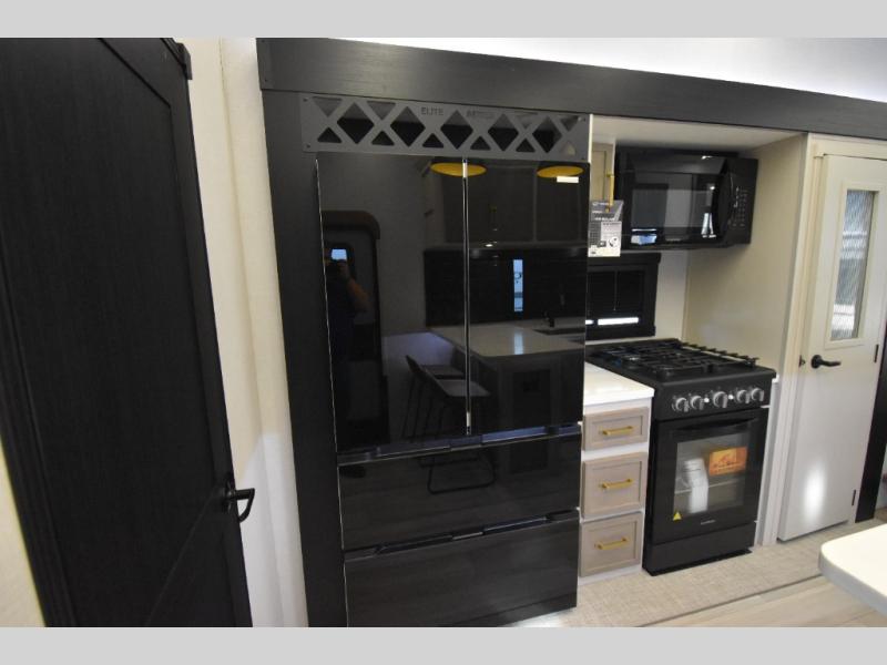 Invite the grandkids or your neighbor friends for your next camping trip in this Wildwood Heritage Glen Elite fifth wheel that features a front entertainment center and living area. Your guests will love the two tri-fold sofas within dual opposing slides to make the room their own. You'll also enjoy theatre seats and a fireplace for an even more at-home feel. The large pantry in the kitchen is very handy as well as the breakfast bar with swivel bar stools. This unit also includes a full and half bath for your convenience, and a king bed with Versa-Tilt on an Elite extra-wide bed slide in the private bedroom. There is abundant storage with multiple pass-through compartments included, so you don't have to leave any of your larger gear behind. Outdoors, you can also enjoy the 20' awning, the strut-assisted steps when entering and exiting, and the Elite outdoor bar and entertainment center which includes a 32" TV, a griddle, and a refrigerator.