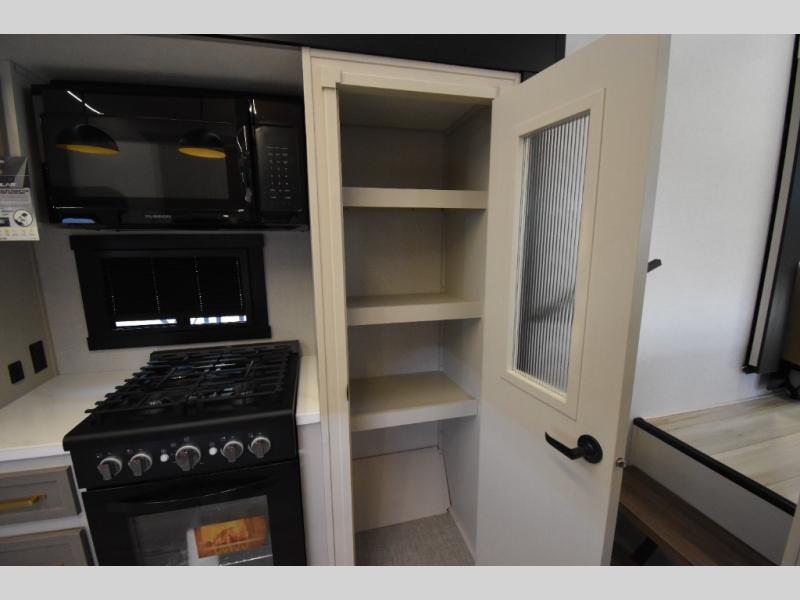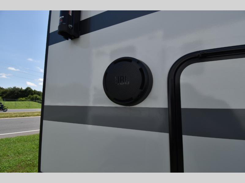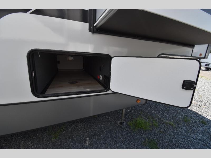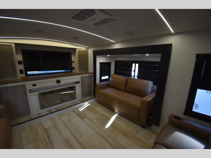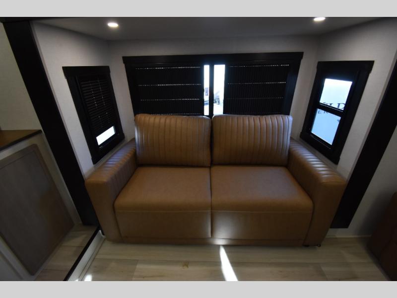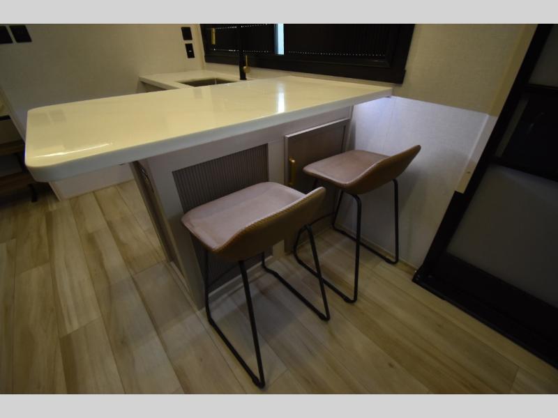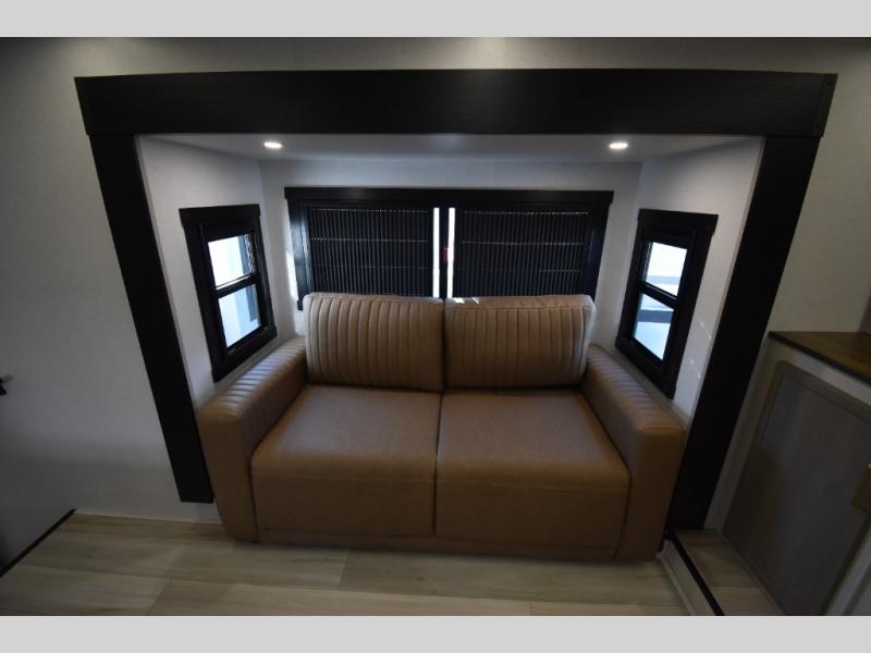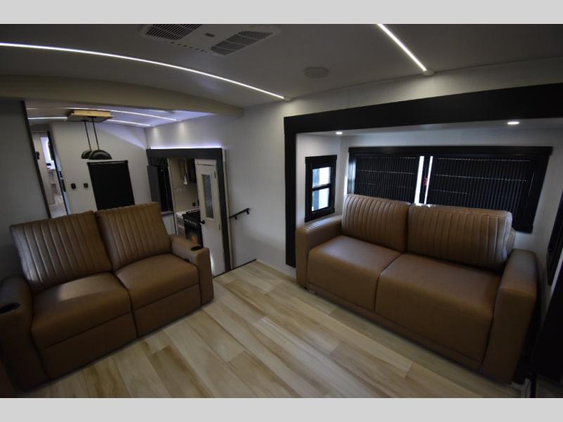 Invite the grandkids or your neighbor friends for your next camping trip in this Wildwood Heritage Glen Elite fifth wheel that features a front entertainment center and living area. Your guests will love the two tri-fold sofas within dual opposing slides to make the room their own. You'll also enjoy theatre seats and a fireplace for an even more at-home feel. The large pantry in the kitchen is very handy as well as the breakfast bar with swivel bar stools. This unit also includes a full and half bath for your convenience, and a king bed with Versa-Tilt on an Elite extra-wide bed slide in the private bedroom. There is abundant storage with multiple pass-through compartments included, so you don't have to leave any of your larger gear behind. Outdoors, you can also enjoy the 20' awning, the strut-assisted steps when entering and exiting, and the Elite outdoor bar and entertainment center which includes a 32" TV, a griddle, and a refrigerator.