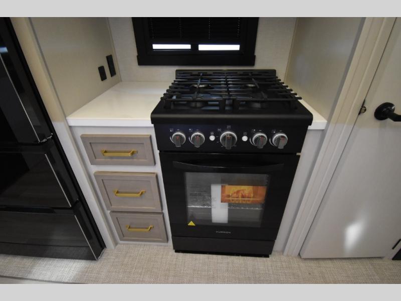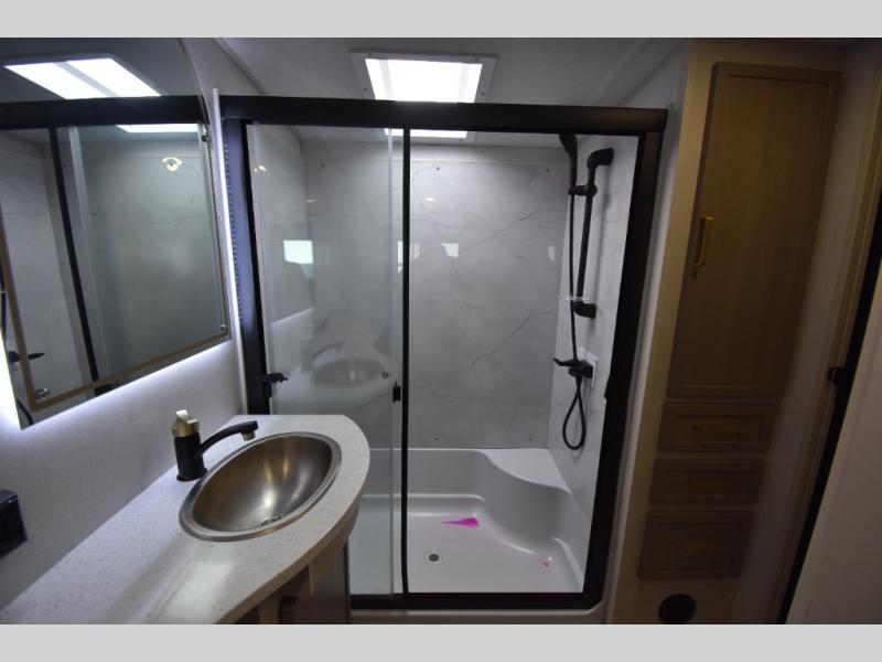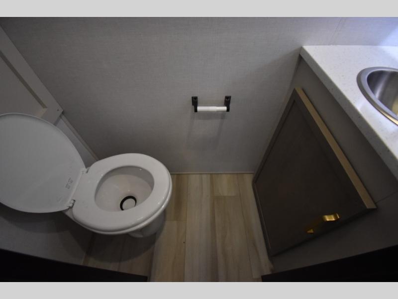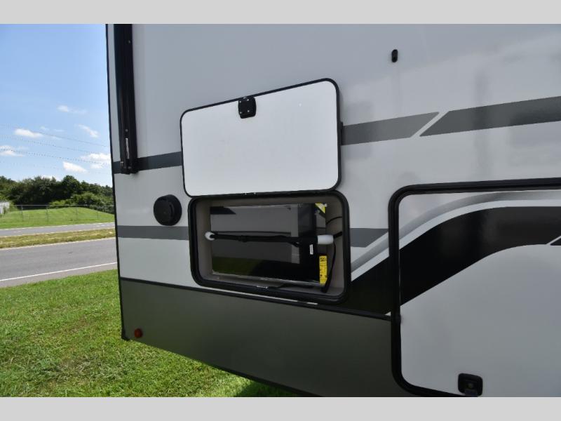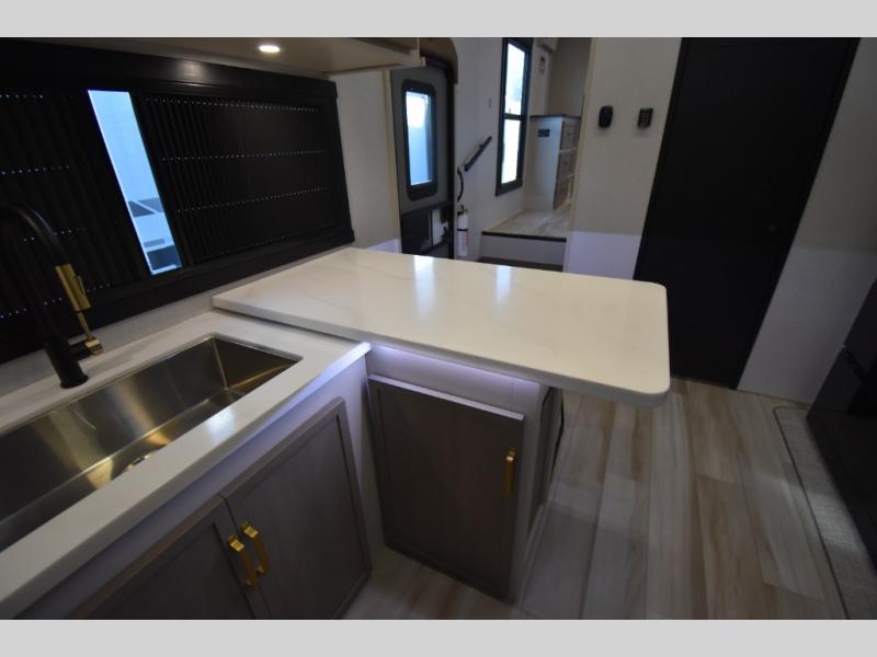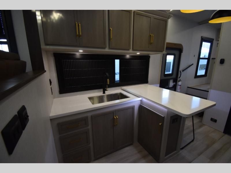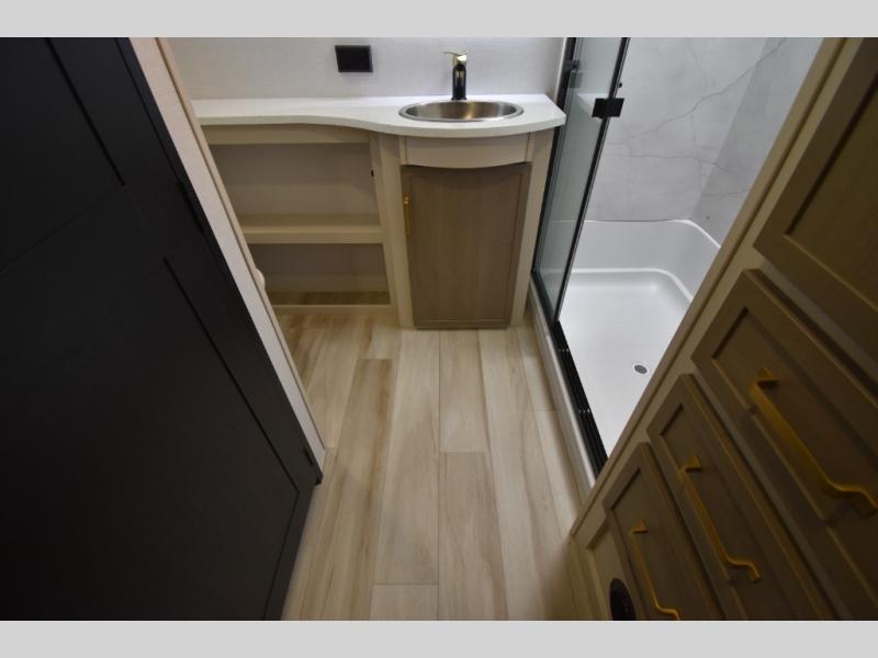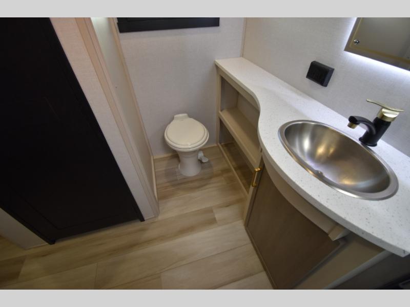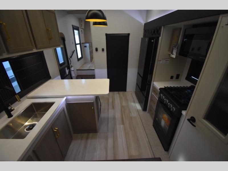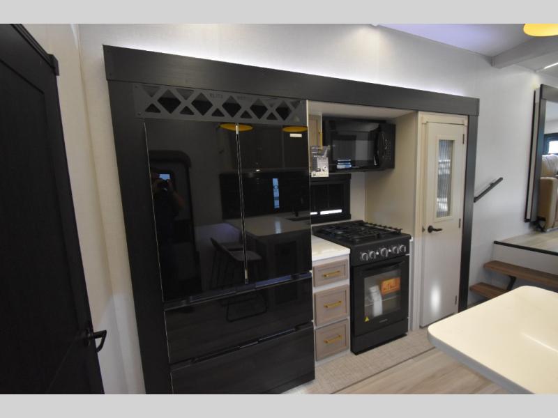 Each Wildwood Heritage Glen Elite Series fifth wheel by Forest River is constructed with vacuum bonded "Aluma Frame" sidewalls and floor, block foam insulation, and an AccessiBelly underbelly with 12V tank heaters on all holding tanks to help extend your camping season. There is an exterior docking station with hot and cold water, along with power stabilizer jacks and landing gear, and Maxxis radial tires with black accented rims. There is also an in-line water filtration system, an RV Airflow system, and an extra large pass-through storage with Slam Latch baggage doors for hassle-free packing. You will love the high-end solid surface countertops inside, along with gold-accented faucets with stainless steel sinks in all bathrooms, and summer wind colored horizontal plank linoleum flooring that is both stylish and easy to keep clean!