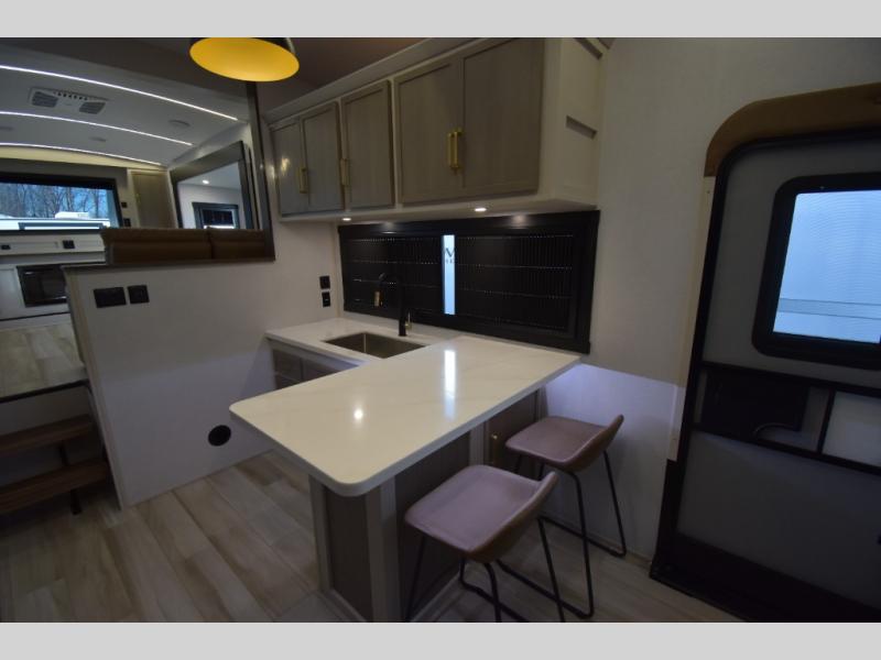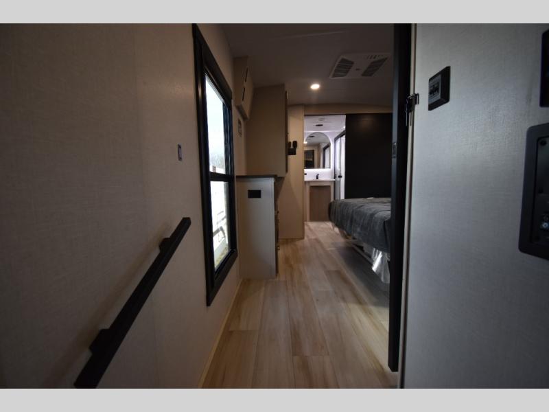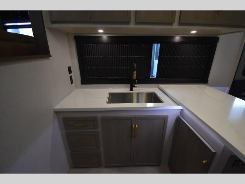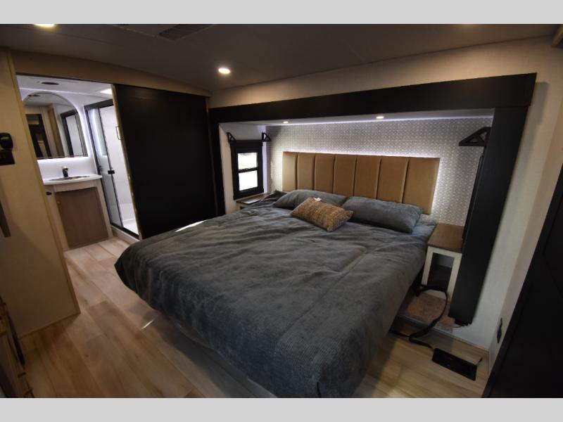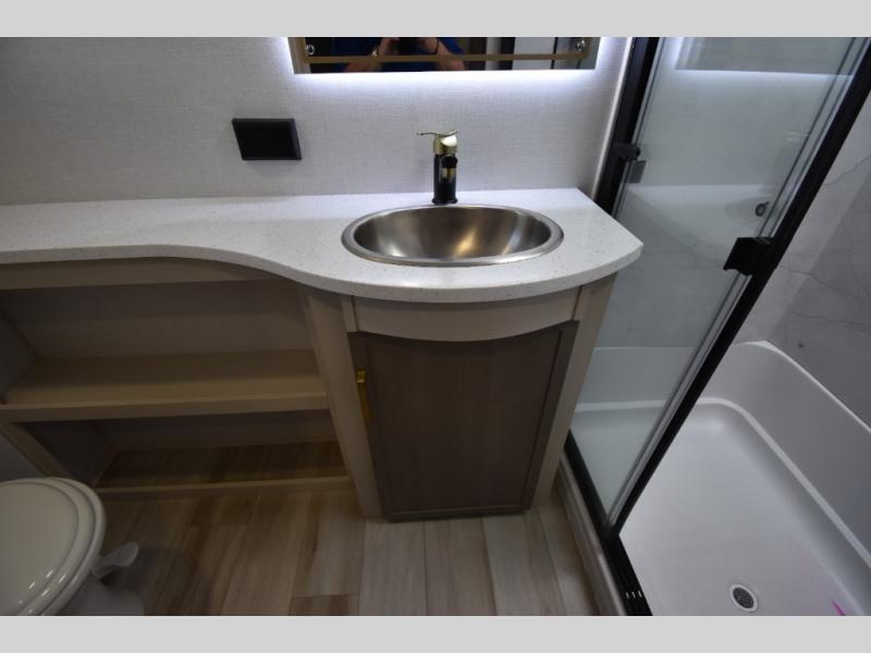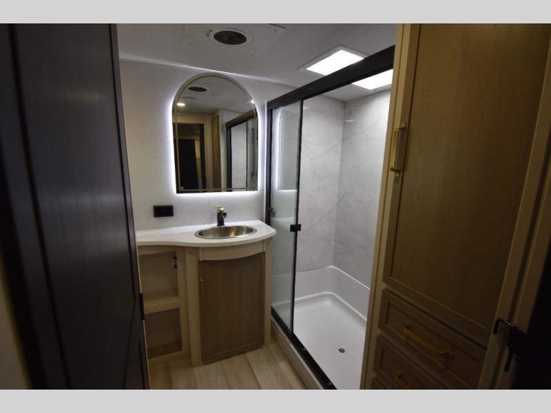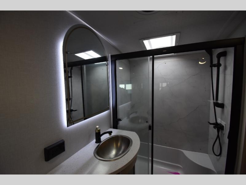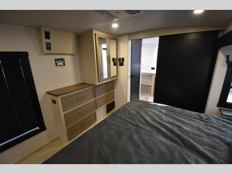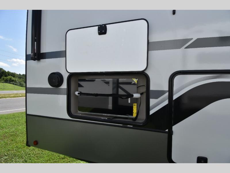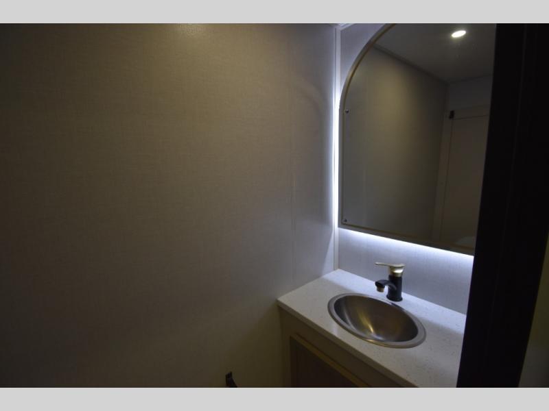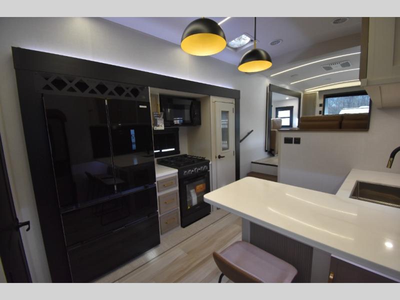 Each Wildwood Heritage Glen Elite Series fifth wheel by Forest River is constructed with vacuum bonded "Aluma Frame" sidewalls and floor, block foam insulation, and an AccessiBelly underbelly with 12V tank heaters on all holding tanks to help extend your camping season. There is an exterior docking station with hot and cold water, along with power stabilizer jacks and landing gear, and Maxxis radial tires with black accented rims. There is also an in-line water filtration system, an RV Airflow system, and an extra large pass-through storage with Slam Latch baggage doors for hassle-free packing. You will love the high-end solid surface countertops inside, along with gold-accented faucets with stainless steel sinks in all bathrooms, and summer wind colored horizontal plank linoleum flooring that is both stylish and easy to keep clean!