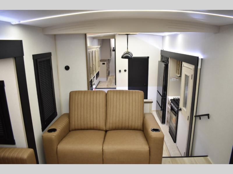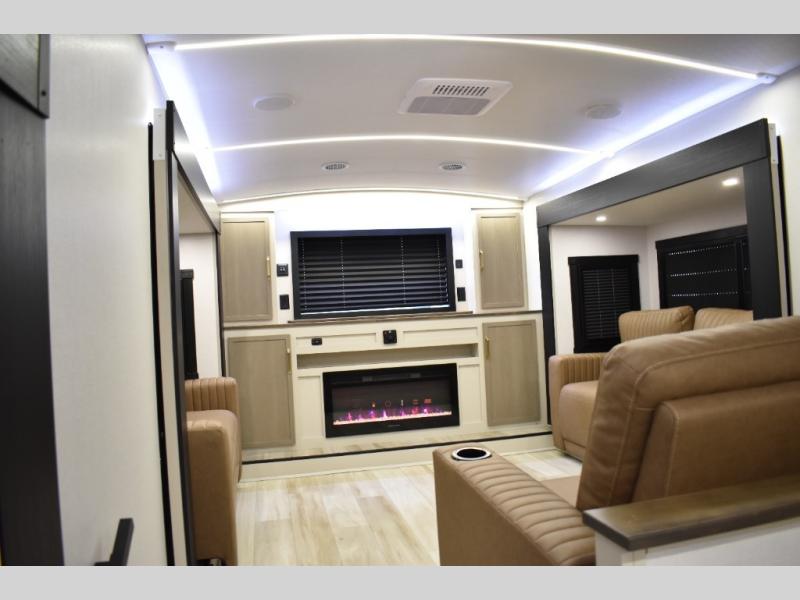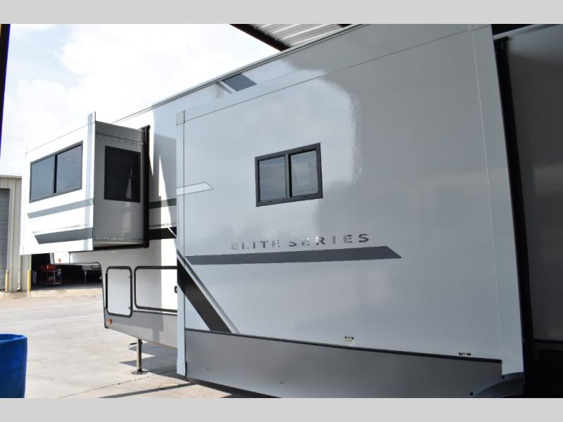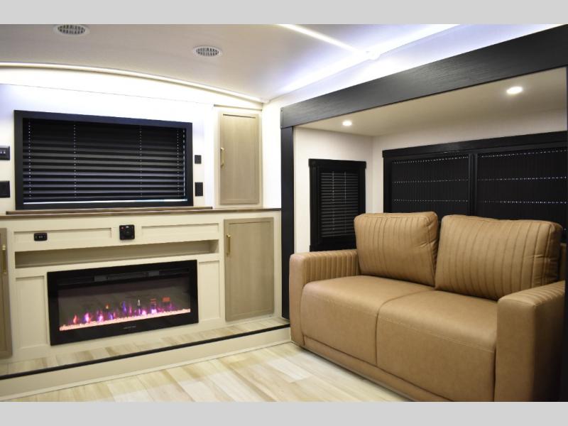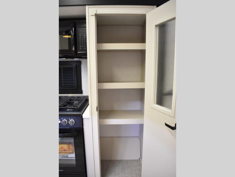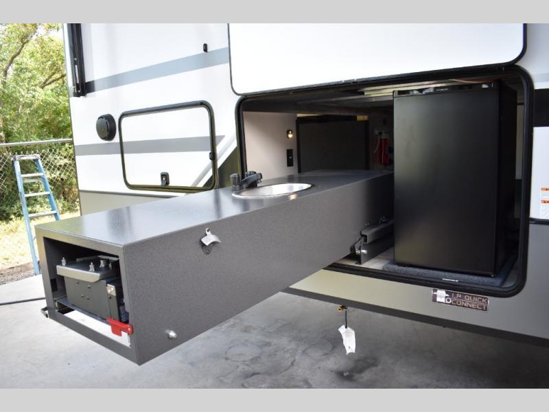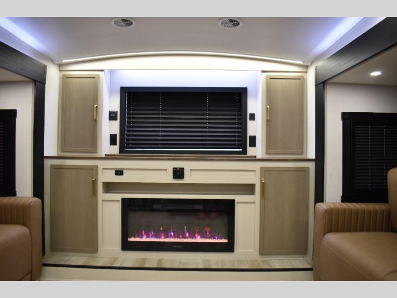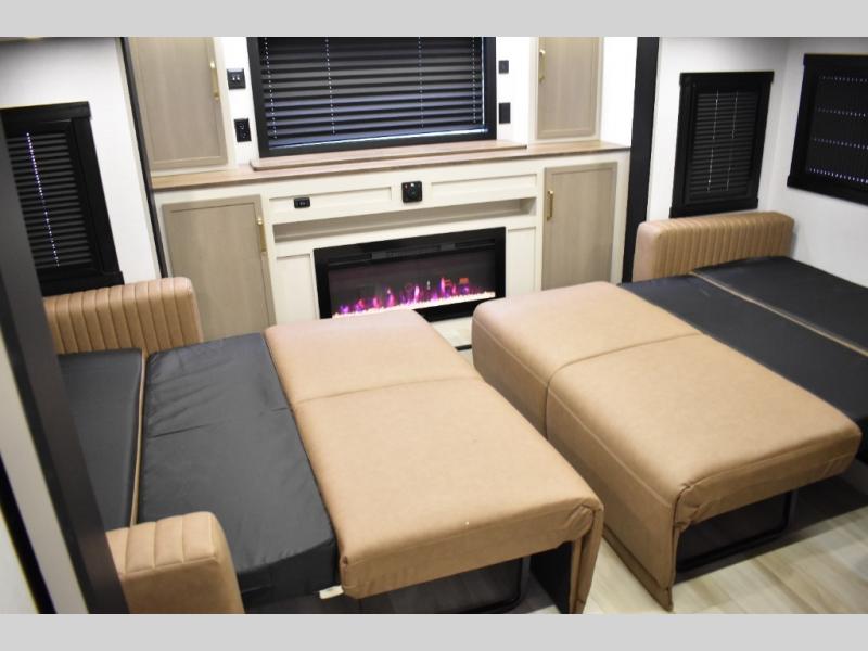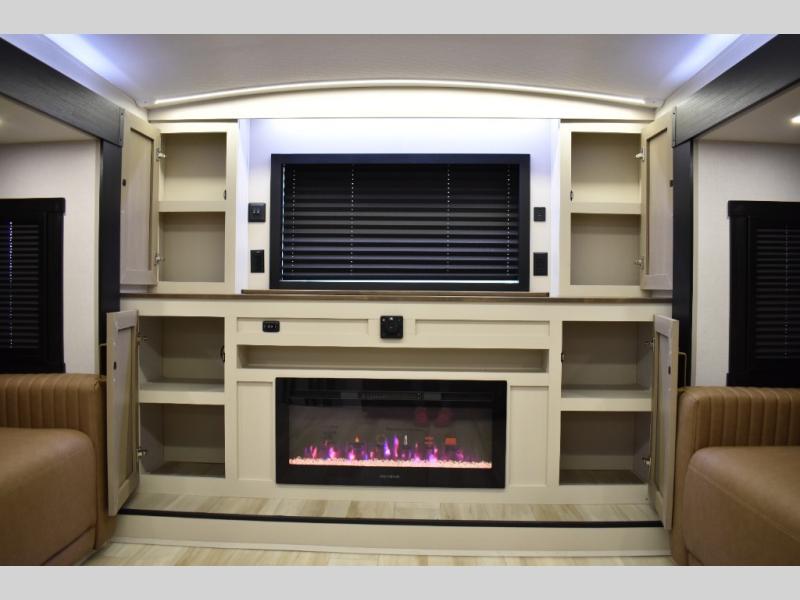 Invite the grandkids or your neighbor friends for your next camping trip in this Wildwood Heritage Glen Elite fifth wheel that features a front entertainment center and living area. Your guests will love the two tri-fold sofas within dual opposing slides to make the room their own. You'll also enjoy theatre seats and a fireplace for an even more at-home feel. The large pantry in the kitchen is very handy as well as the breakfast bar with swivel bar stools. This unit also includes a full and half bath for your convenience, and a king bed with Versa-Tilt on an Elite extra-wide bed slide in the private bedroom. There is abundant storage with multiple pass-through compartments included, so you don't have to leave any of your larger gear behind. Outdoors, you can also enjoy the 20' awning, the strut-assisted steps when entering and exiting, and the Elite outdoor bar and entertainment center which includes a 32" TV, a griddle, and a refrigerator.