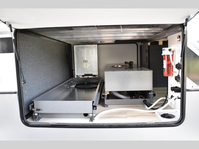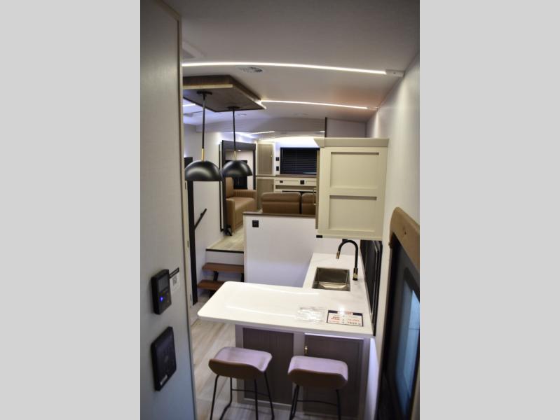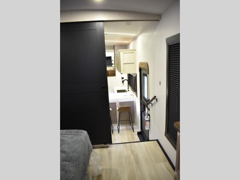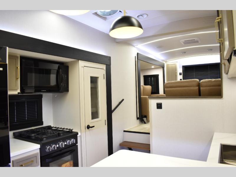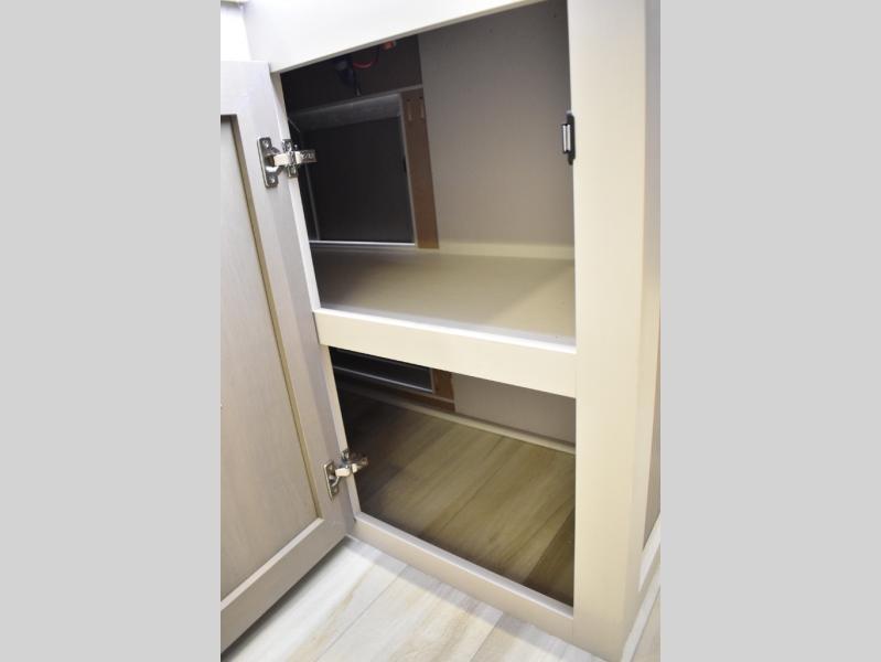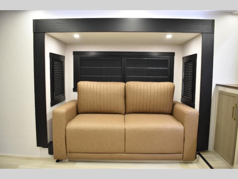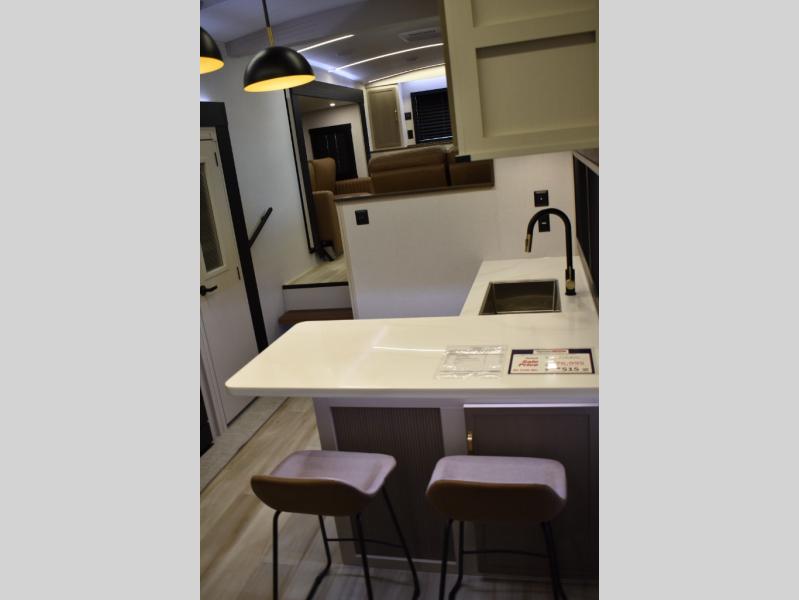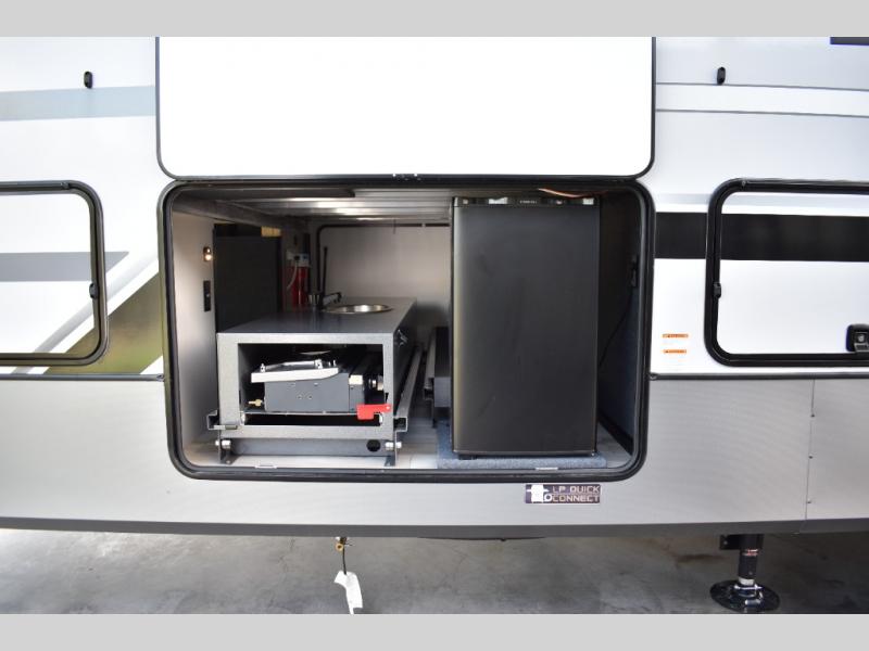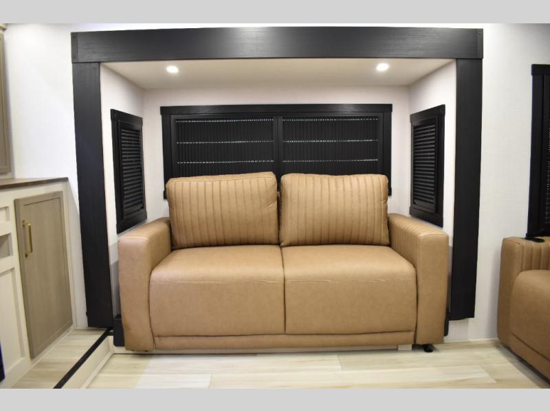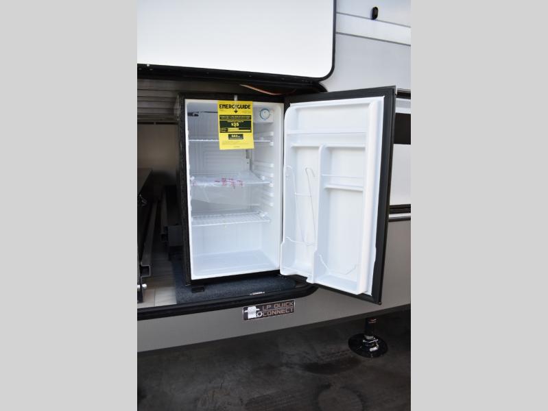 Invite the grandkids or your neighbor friends for your next camping trip in this Wildwood Heritage Glen Elite fifth wheel that features a front entertainment center and living area. Your guests will love the two tri-fold sofas within dual opposing slides to make the room their own. You'll also enjoy theatre seats and a fireplace for an even more at-home feel. The large pantry in the kitchen is very handy as well as the breakfast bar with swivel bar stools. This unit also includes a full and half bath for your convenience, and a king bed with Versa-Tilt on an Elite extra-wide bed slide in the private bedroom. There is abundant storage with multiple pass-through compartments included, so you don't have to leave any of your larger gear behind. Outdoors, you can also enjoy the 20' awning, the strut-assisted steps when entering and exiting, and the Elite outdoor bar and entertainment center which includes a 32" TV, a griddle, and a refrigerator.