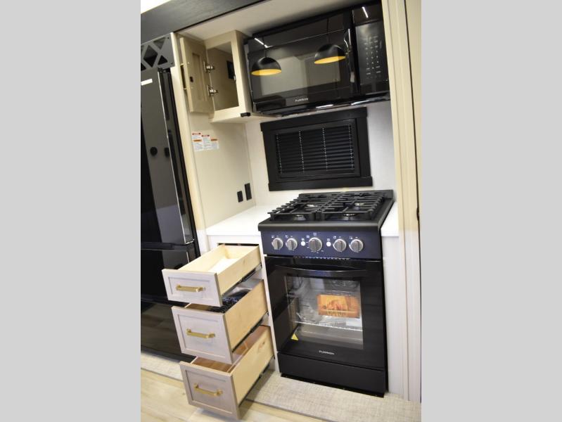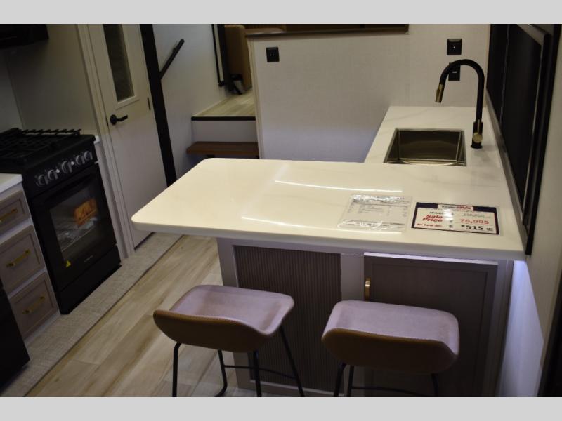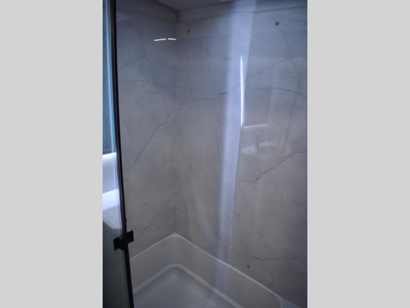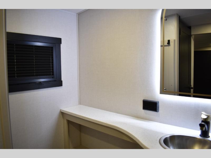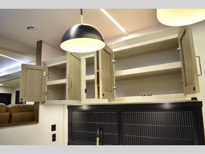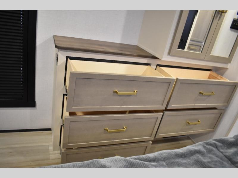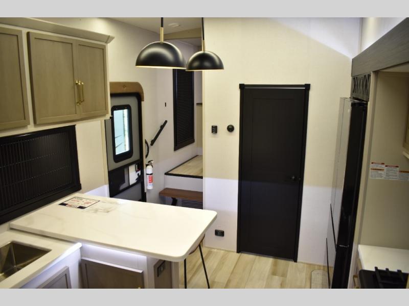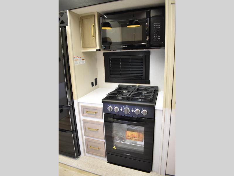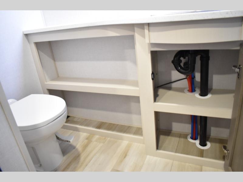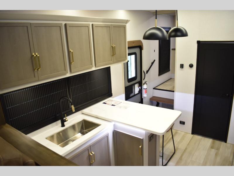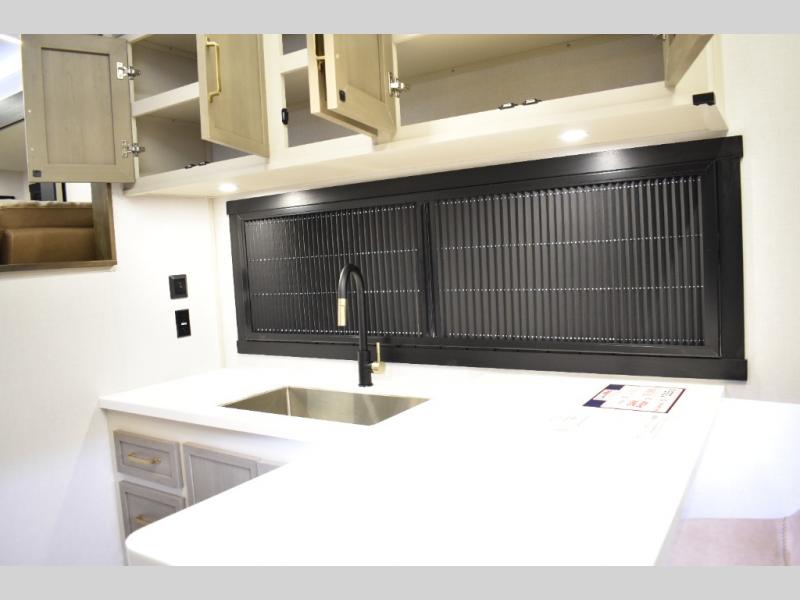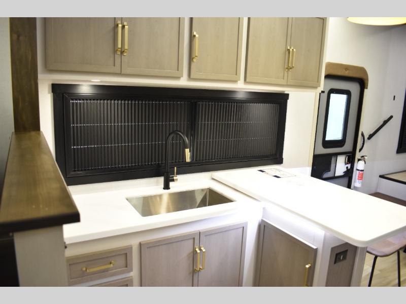 Each Wildwood Heritage Glen Elite Series fifth wheel by Forest River is constructed with vacuum bonded "Aluma Frame" sidewalls and floor, block foam insulation, and an AccessiBelly underbelly with 12V tank heaters on all holding tanks to help extend your camping season. There is an exterior docking station with hot and cold water, along with power stabilizer jacks and landing gear, and Maxxis radial tires with black accented rims. There is also an in-line water filtration system, an RV Airflow system, and an extra large pass-through storage with Slam Latch baggage doors for hassle-free packing. You will love the high-end solid surface countertops inside, along with gold-accented faucets with stainless steel sinks in all bathrooms, and summer wind colored horizontal plank linoleum flooring that is both stylish and easy to keep clean!