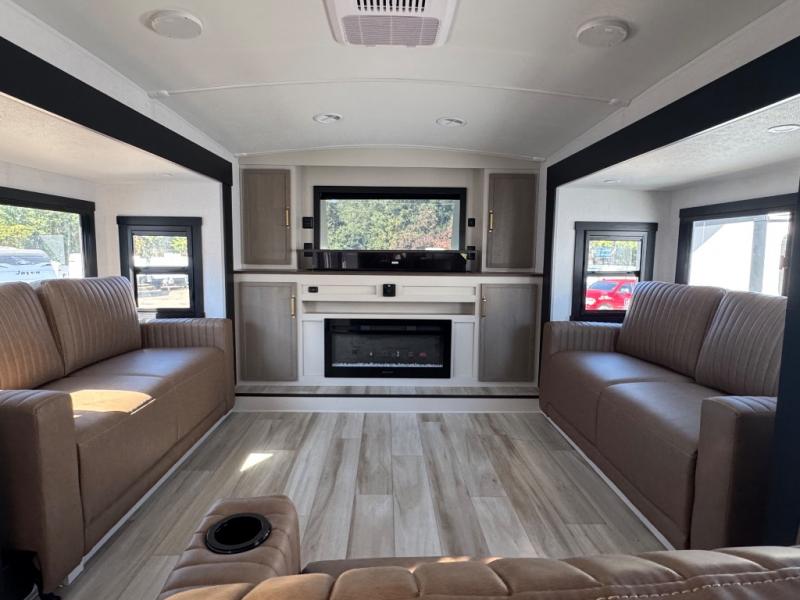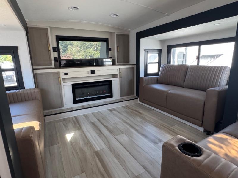 Invite the grandkids or your neighbor friends for your next camping trip in this Wildwood Heritage Glen Elite fifth wheel that features a front entertainment center and living area. Your guests will love the two tri-fold sofas within dual opposing slides to make the room their own. You'll also enjoy theatre seats and a fireplace for an even more at-home feel. The large pantry in the kitchen is very handy as well as the breakfast bar with swivel bar stools. This unit also includes a full and half bath for your convenience, and a king bed with Versa-Tilt on an Elite extra-wide bed slide in the private bedroom. There is abundant storage with multiple pass-through compartments included, so you don't have to leave any of your larger gear behind. Outdoors, you can also enjoy the 20' awning, the strut-assisted steps when entering and exiting, and the Elite outdoor bar and entertainment center which includes a 32" TV, a griddle, and a refrigerator.