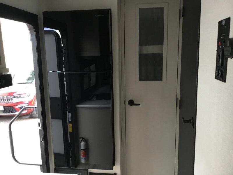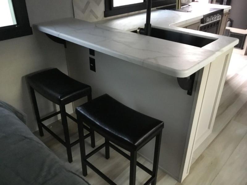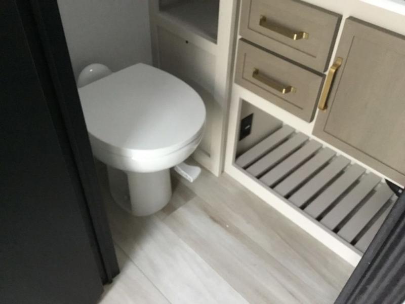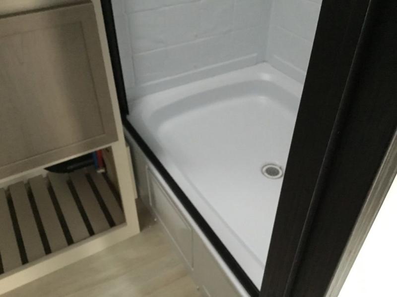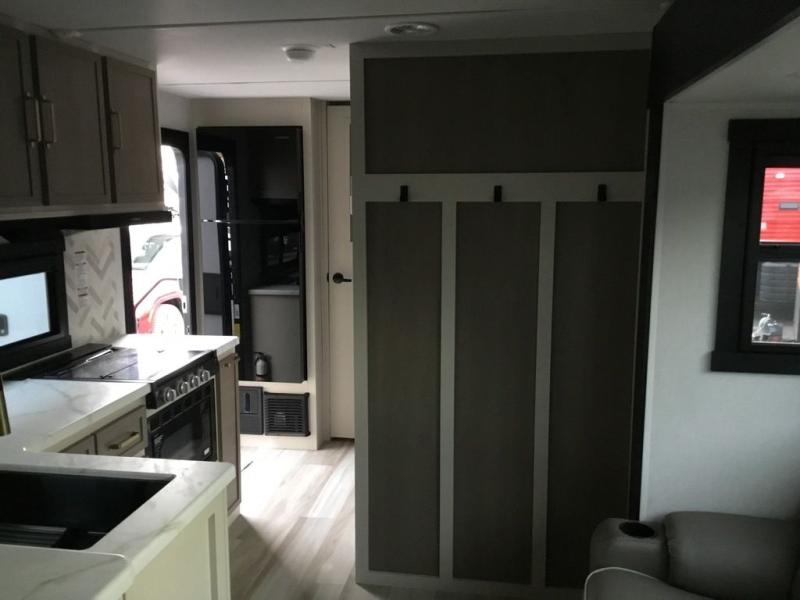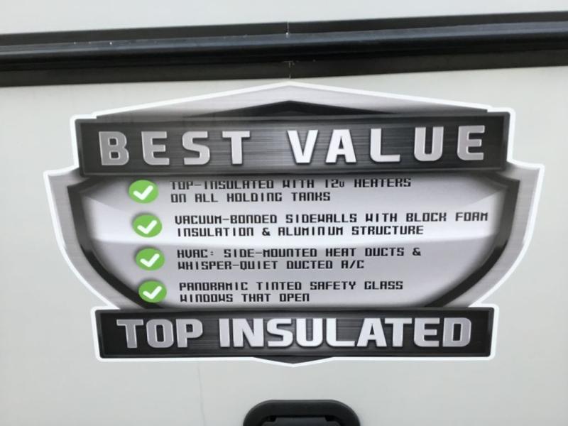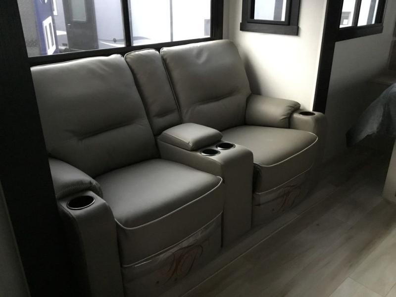 You and your favorite person can enjoy a spacious kitchen and living area thanks to the slide out, once inside leave your jackets on the coat hooks and you can relax on the theater seating slide out. Outside you will find a Texas-sized pass-through storage to grab your camp chairs and games from. Back inside you can take a restroom break in the full bathroom which also includes a shower and storage. The cook will appreciate having a pantry and a 12V refrigerator a few steps away from the microwave and stovetop. When it is time to relax, the front queen bed will be calling your name!