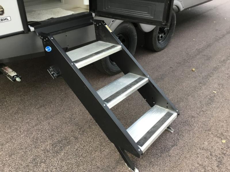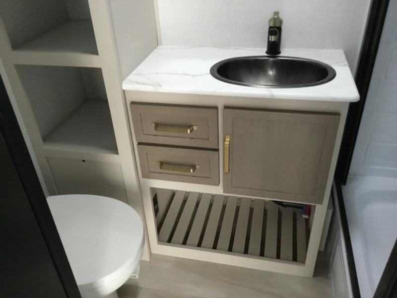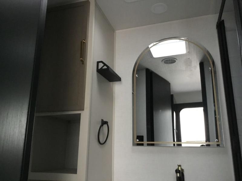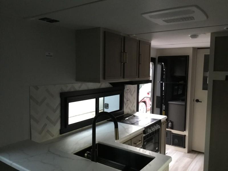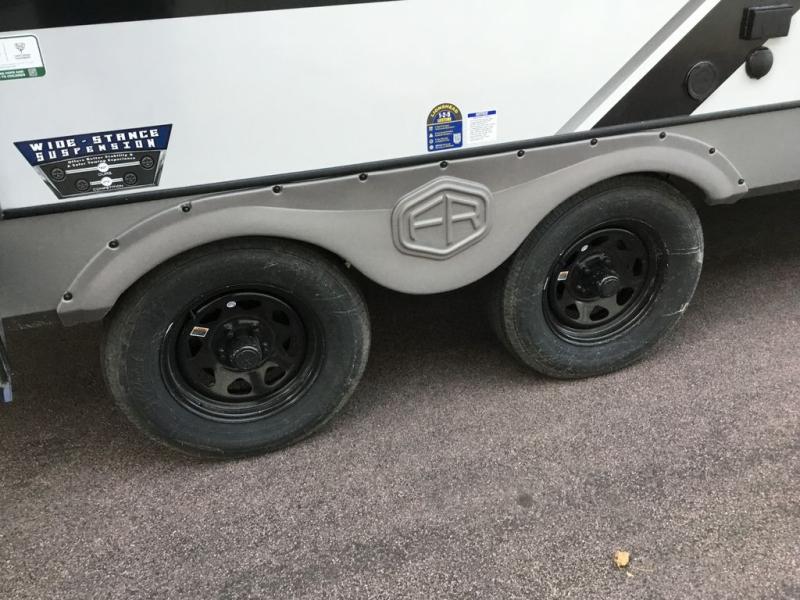 The Wildwood Heritage Glen Hyper-Lyte travel trailer by Forest River offers stability with a wide stance axle system, easy setup with a power tongue jack with an LED docking light, and safe entry with the Step Above aluminum entry steps. The interior includes Temple Cherry cabinetry with matte gold hardware, hidden hinges on the cabinet doors, and a residential single bowl undermount sink. You will also find a back-up camera prep and solar prep, an outdoor shower, and many more exterior conveniences.