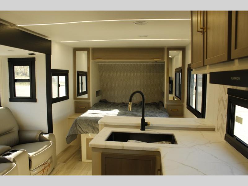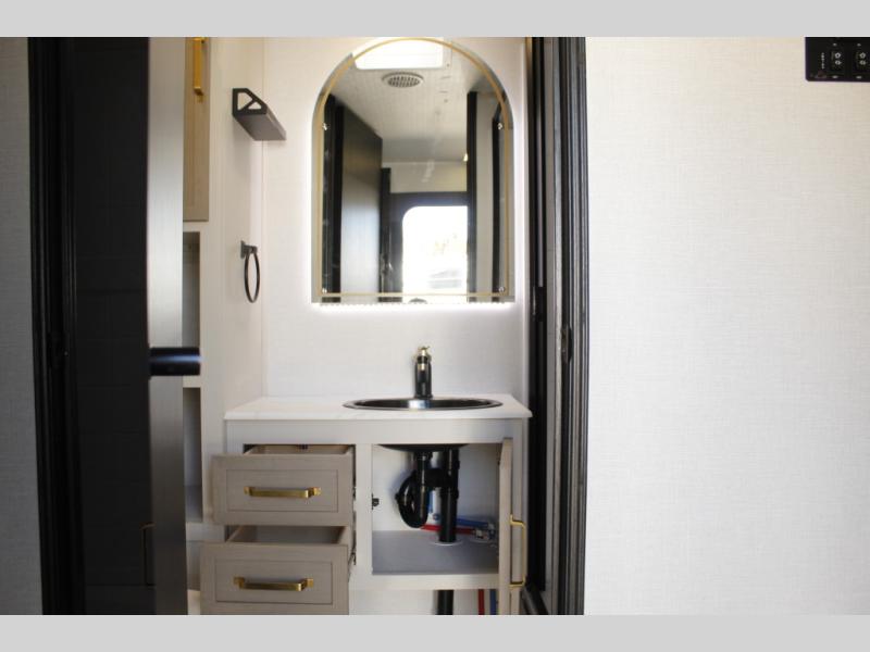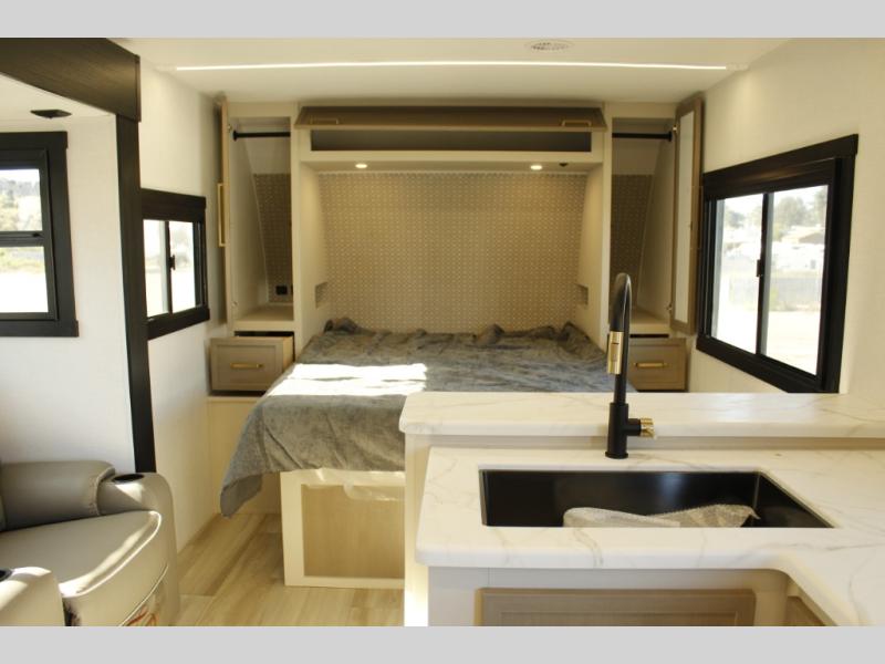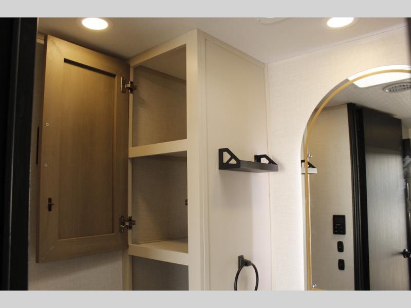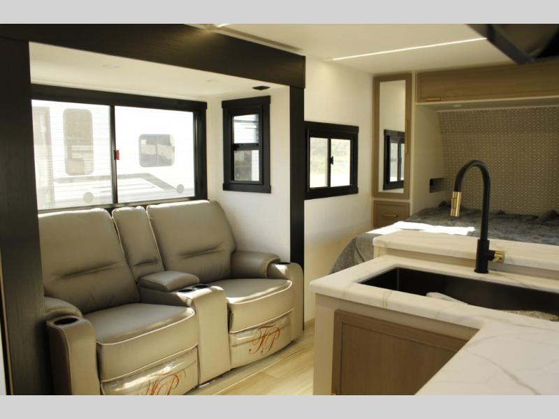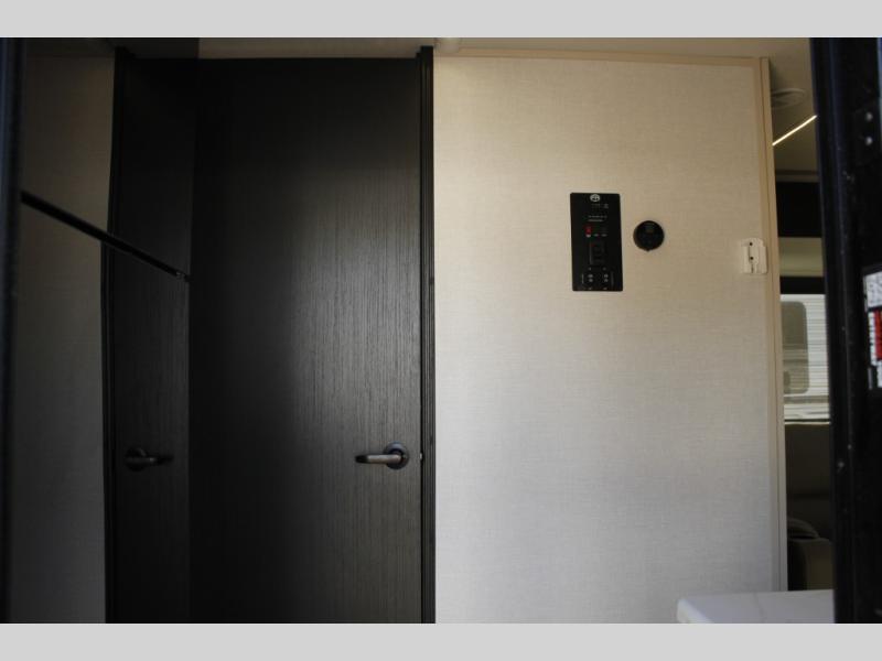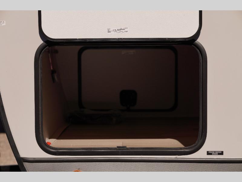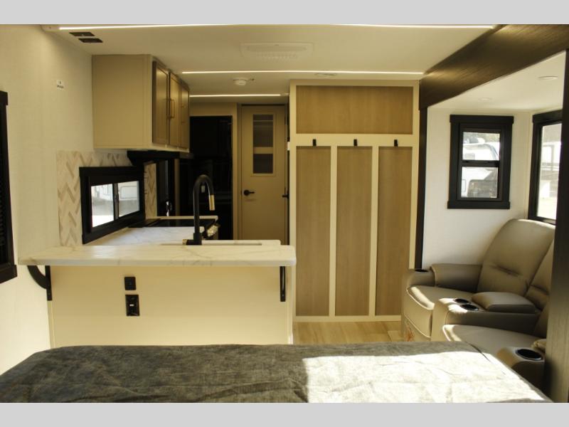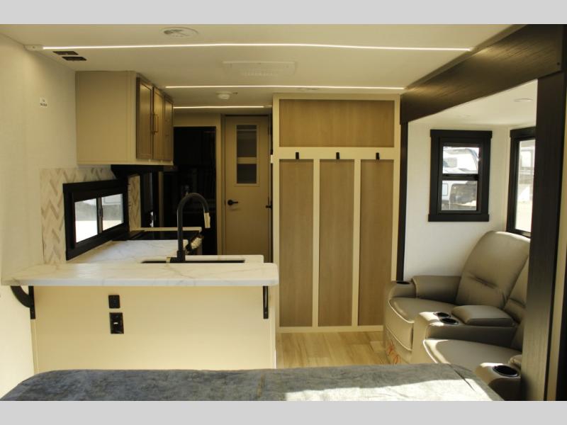 You and your favorite person can enjoy a spacious kitchen and living area thanks to the slide out, once inside leave your jackets on the coat hooks and you can relax on the theater seating slide out. Outside you will find a Texas-sized pass-through storage to grab your camp chairs and games from. Back inside you can take a restroom break in the full bathroom which also includes a shower and storage. The cook will appreciate having a pantry and a 12V refrigerator a few steps away from the microwave and stovetop. When it is time to relax, the front queen bed will be calling your name!
