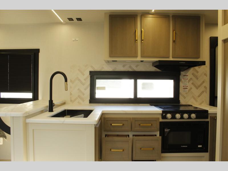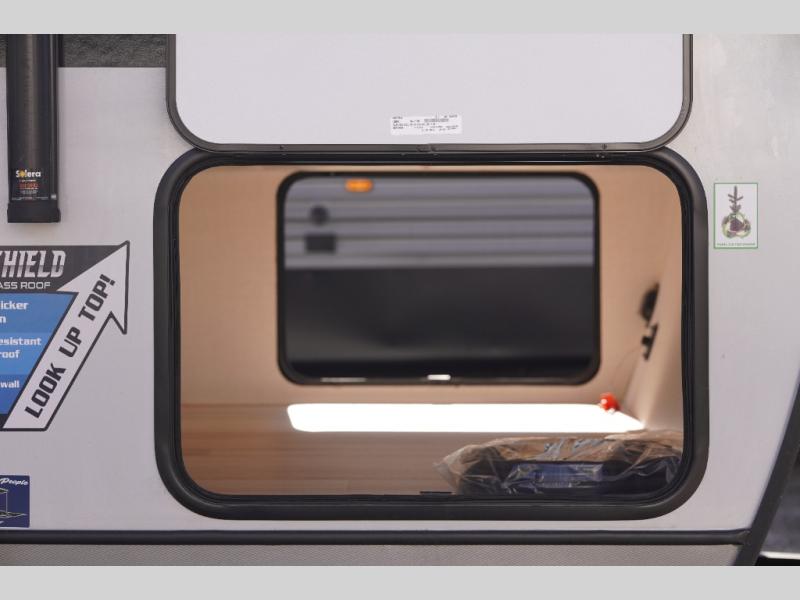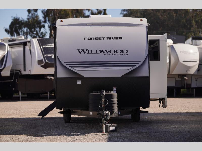 The Wildwood Heritage Glen Hyper-Lyte travel trailer by Forest River offers stability with a wide stance axle system, easy setup with a power tongue jack with an LED docking light, and safe entry with the Step Above aluminum entry steps. The interior includes Temple Cherry cabinetry with matte gold hardware, hidden hinges on the cabinet doors, and a residential single bowl undermount sink. You will also find a back-up camera prep and solar prep, an outdoor shower, and many more exterior conveniences.