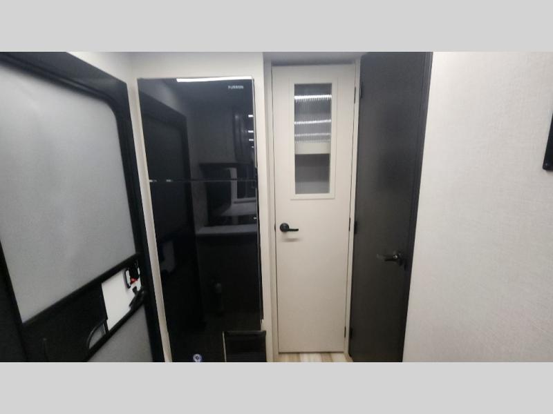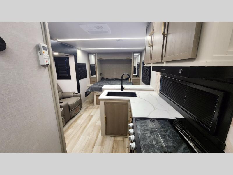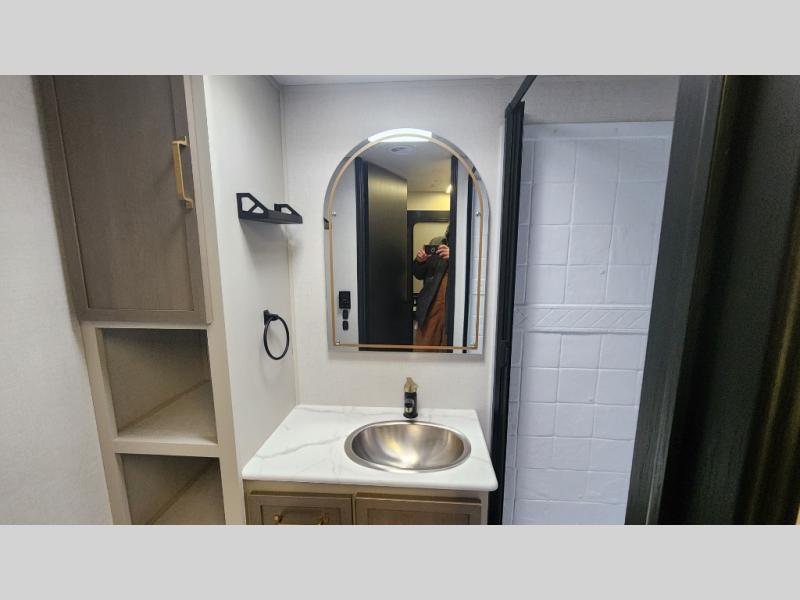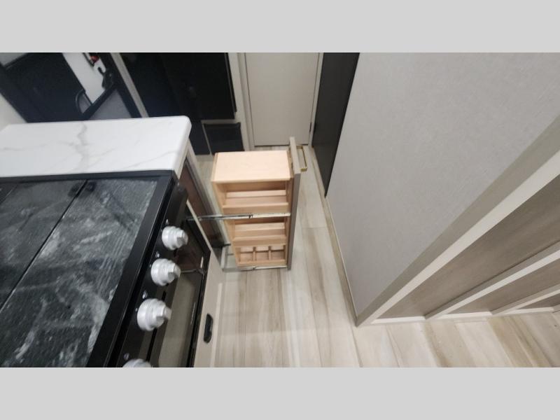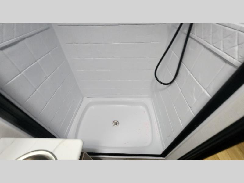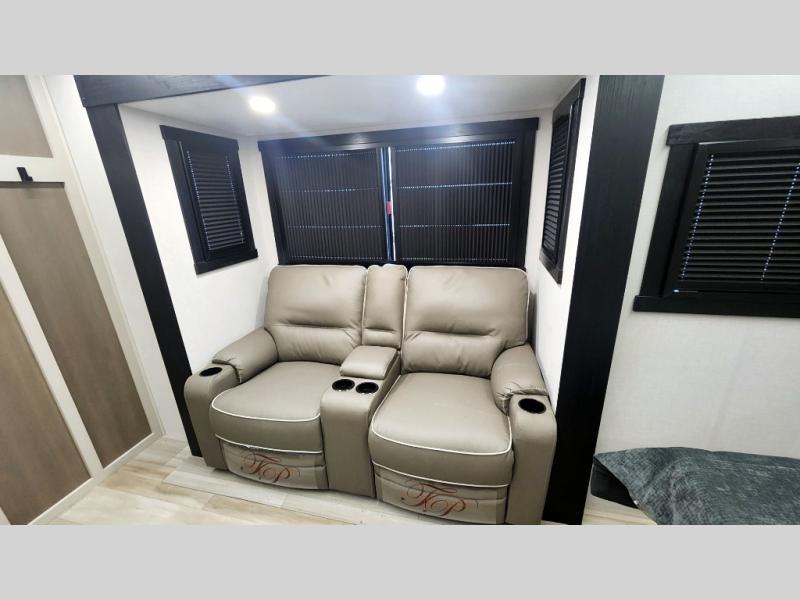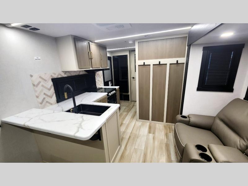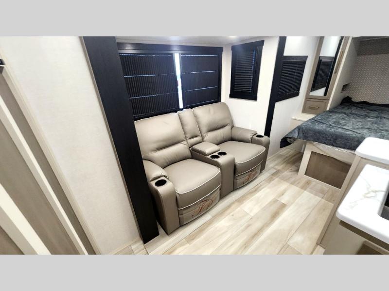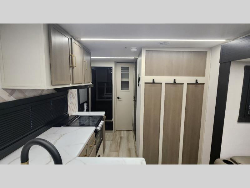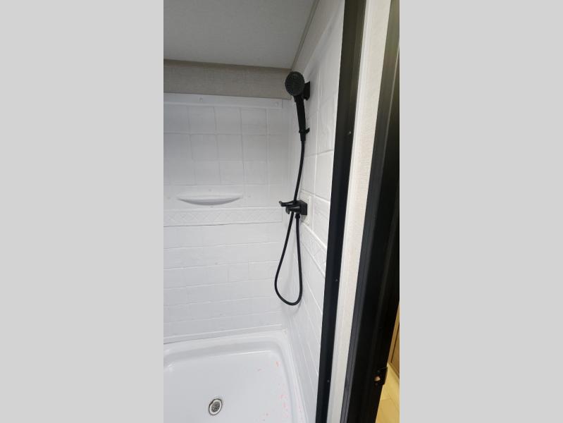 You and your favorite person can enjoy a spacious kitchen and living area thanks to the slide out, once inside leave your jackets on the coat hooks and you can relax on the theater seating slide out. Outside you will find a Texas-sized pass-through storage to grab your camp chairs and games from. Back inside you can take a restroom break in the full bathroom which also includes a shower and storage. The cook will appreciate having a pantry and a 12V refrigerator a few steps away from the microwave and stovetop. When it is time to relax, the front queen bed will be calling your name!