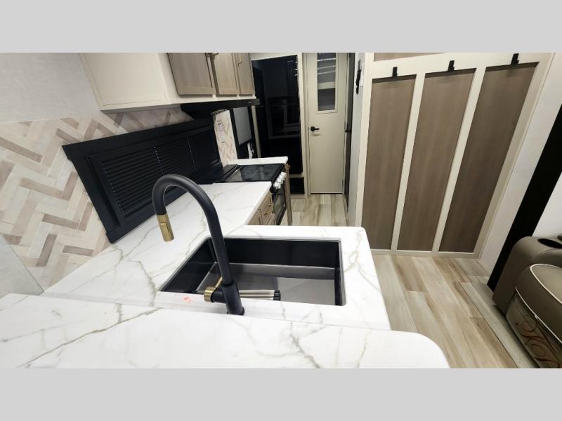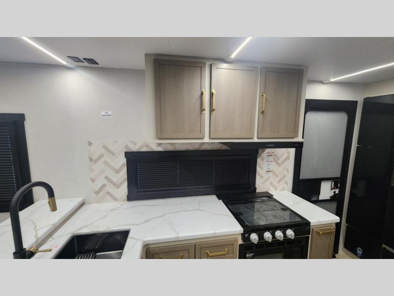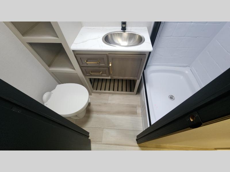The Wildwood Heritage Glen Hyper-Lyte travel trailer by Forest River offers stability with a wide stance axle system, easy setup with a power tongue jack with an LED docking light, and safe entry with the Step Above aluminum entry steps. The interior includes Temple Cherry cabinetry with matte gold hardware, hidden hinges on the cabinet doors, and a residential single bowl undermount sink. You will also find a back-up camera prep and solar prep, an outdoor shower, and many more exterior conveniences.