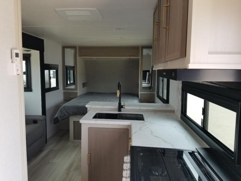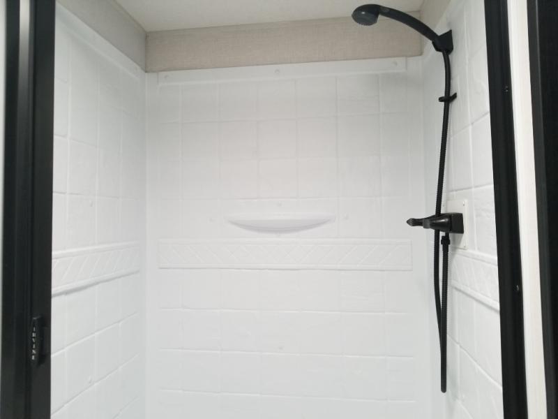 You and your favorite person can enjoy a spacious kitchen and living area thanks to the slide out, once inside leave your jackets on the coat hooks and you can relax on the theater seating slide out. Outside you will find a Texas-sized pass-through storage to grab your camp chairs and games from. Back inside you can take a restroom break in the full bathroom which also includes a shower and storage. The cook will appreciate having a pantry and a 12V refrigerator a few steps away from the microwave and stovetop. When it is time to relax, the front queen bed will be calling your name!