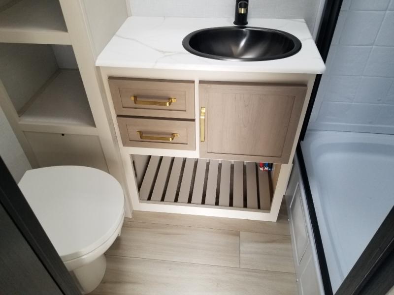 The Wildwood Heritage Glen Hyper-Lyte travel trailer by Forest River offers stability with a wide stance axle system, easy setup with a power tongue jack with an LED docking light, and safe entry with the Step Above aluminum entry steps. The interior includes Temple Cherry cabinetry with matte gold hardware, hidden hinges on the cabinet doors, and a residential single bowl undermount sink. You will also find a back-up camera prep and solar prep, an outdoor shower, and many more exterior conveniences.