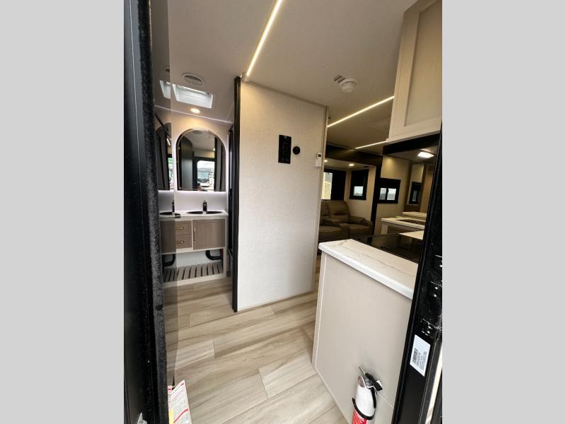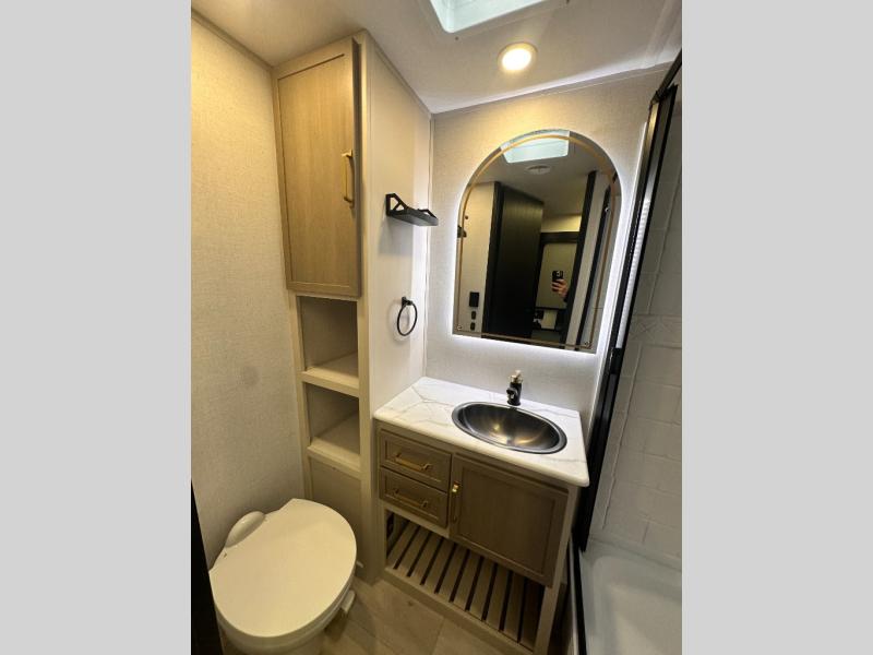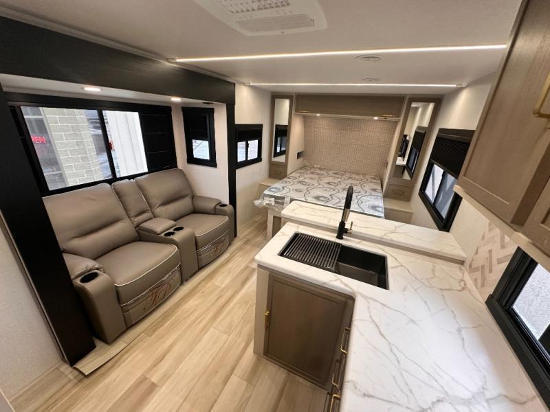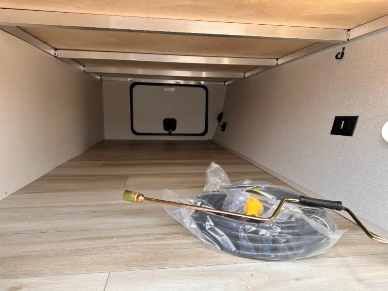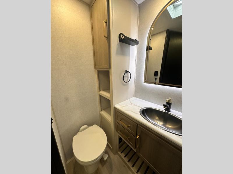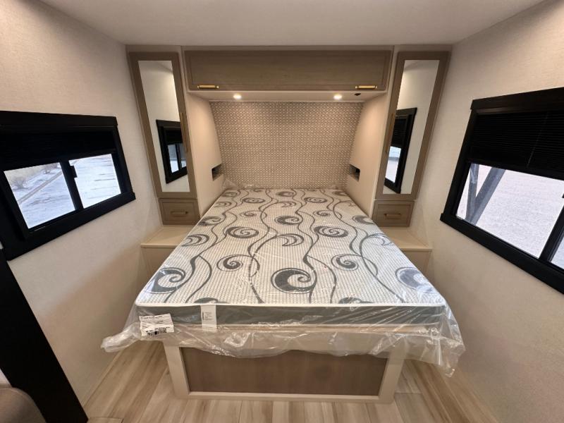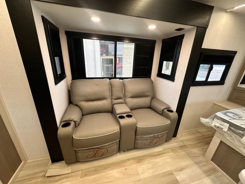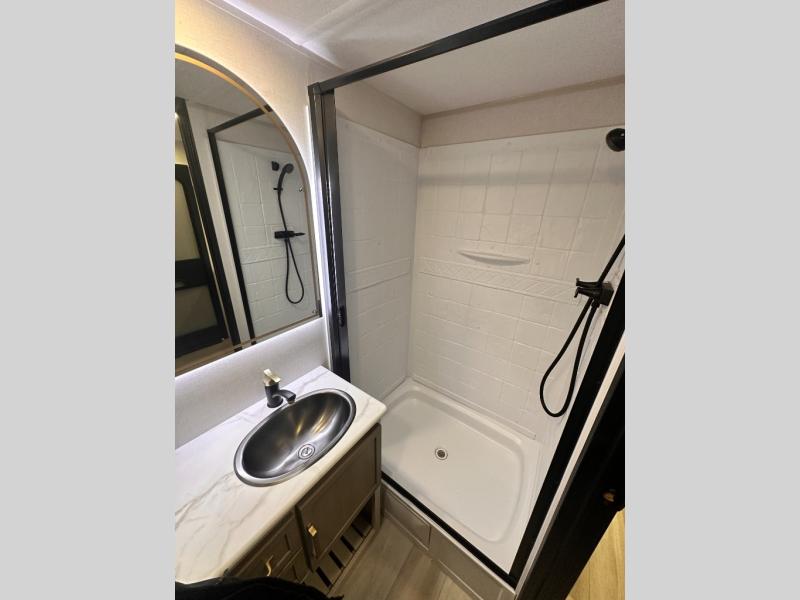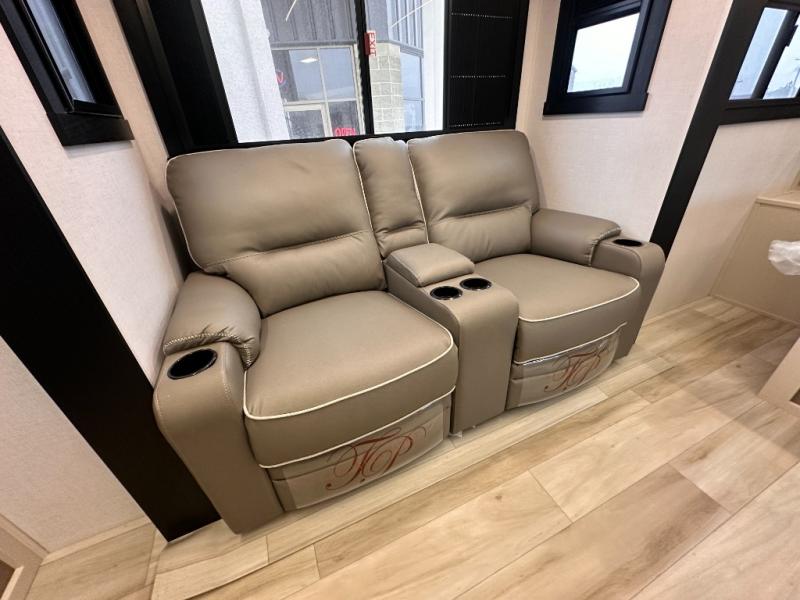 You and your favorite person can enjoy a spacious kitchen and living area thanks to the slide out, once inside leave your jackets on the coat hooks and you can relax on the theater seating slide out. Outside you will find a Texas-sized pass-through storage to grab your camp chairs and games from. Back inside you can take a restroom break in the full bathroom which also includes a shower and storage. The cook will appreciate having a pantry and a 12V refrigerator a few steps away from the microwave and stovetop. When it is time to relax, the front queen bed will be calling your name!