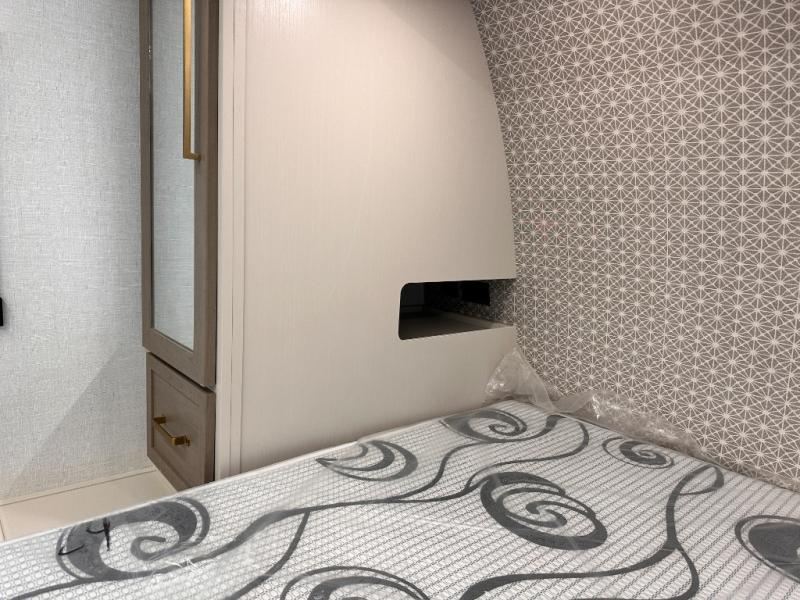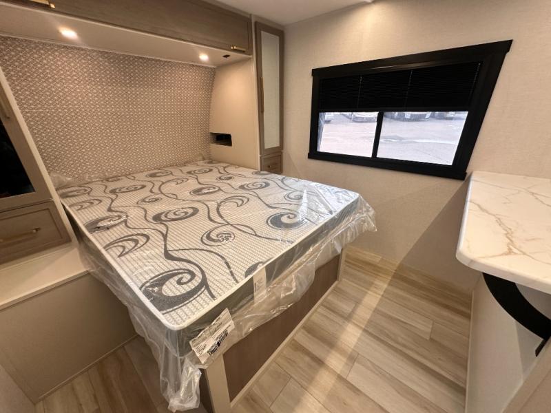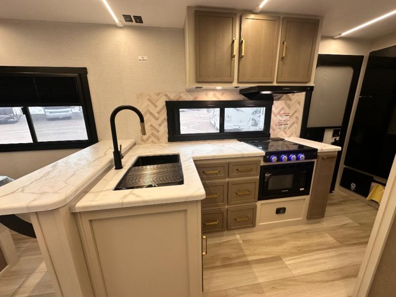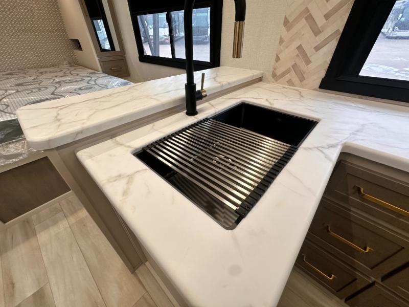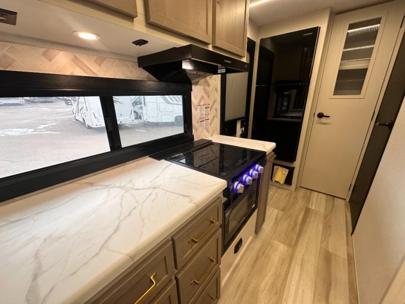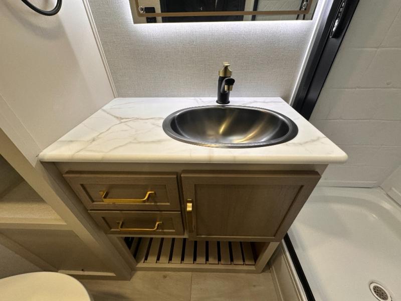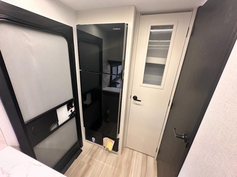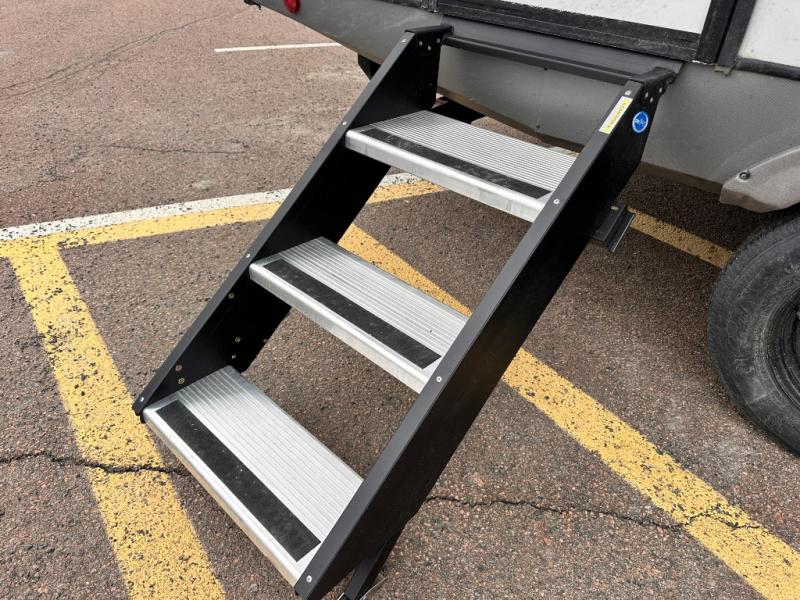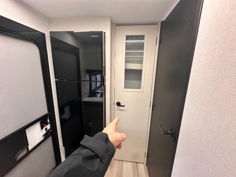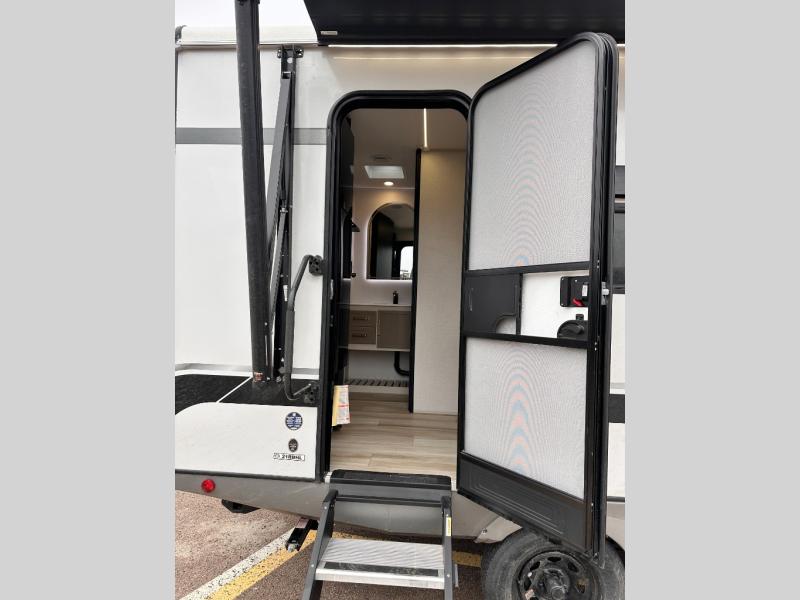 You and your favorite person can enjoy a spacious kitchen and living area thanks to the slide out, once inside leave your jackets on the coat hooks and you can relax on the theater seating slide out. Outside you will find a Texas-sized pass-through storage to grab your camp chairs and games from. Back inside you can take a restroom break in the full bathroom which also includes a shower and storage. The cook will appreciate having a pantry and a 12V refrigerator a few steps away from the microwave and stovetop. When it is time to relax, the front queen bed will be calling your name!