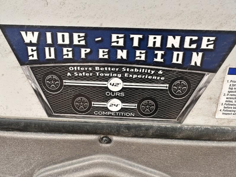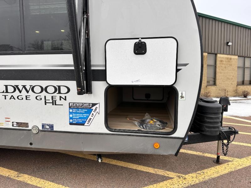 The Wildwood Heritage Glen Hyper-Lyte travel trailer by Forest River offers stability with a wide stance axle system, easy setup with a power tongue jack with an LED docking light, and safe entry with the Step Above aluminum entry steps. The interior includes Temple Cherry cabinetry with matte gold hardware, hidden hinges on the cabinet doors, and a residential single bowl undermount sink. You will also find a back-up camera prep and solar prep, an outdoor shower, and many more exterior conveniences.