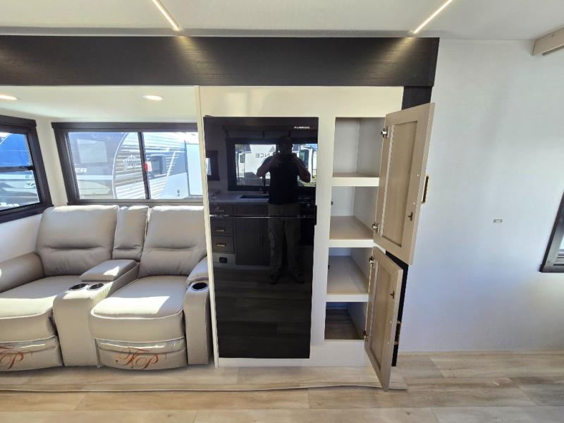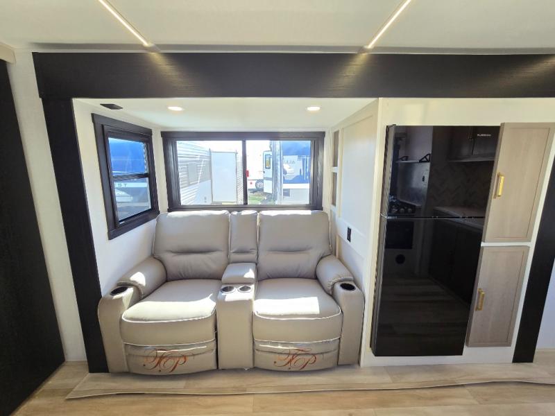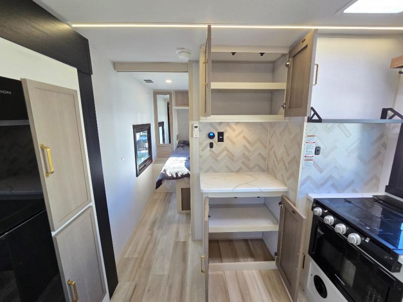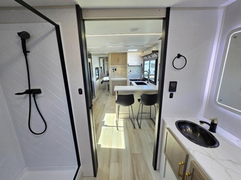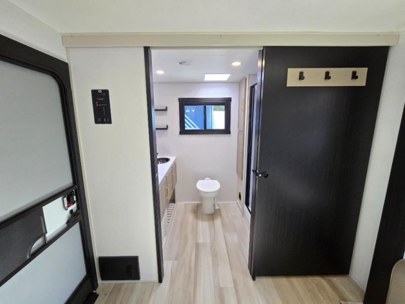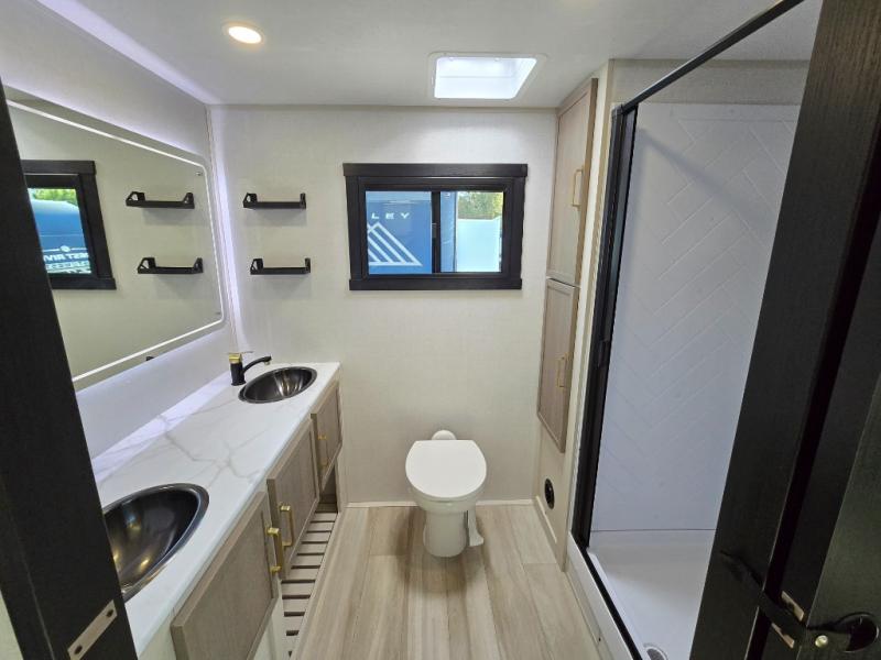 If you like to have travel in complete comfort, this couples trailer offers theater seating so you can relax after a long trip. The kitchen has full amenities including a 12V black refrigerator and a pantry for your goods. The rear bath offers a shower to freshen up, a large dual sink vanity, and everything else you need to stay clean without having to use the public facilities. The front bedroom offers a space saving door, a queen bed and overhead cabinets. You will also find a Texas-sized pass-through compartment outside for the outdoor gear such as camping chairs, charcoal, and such.
