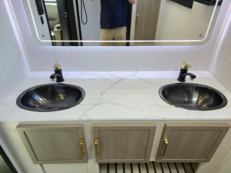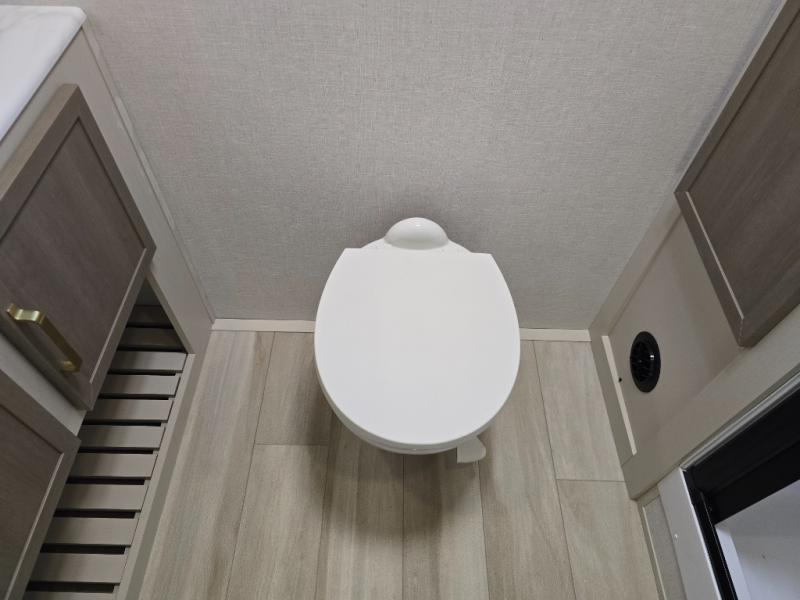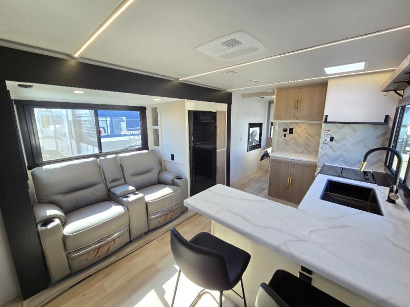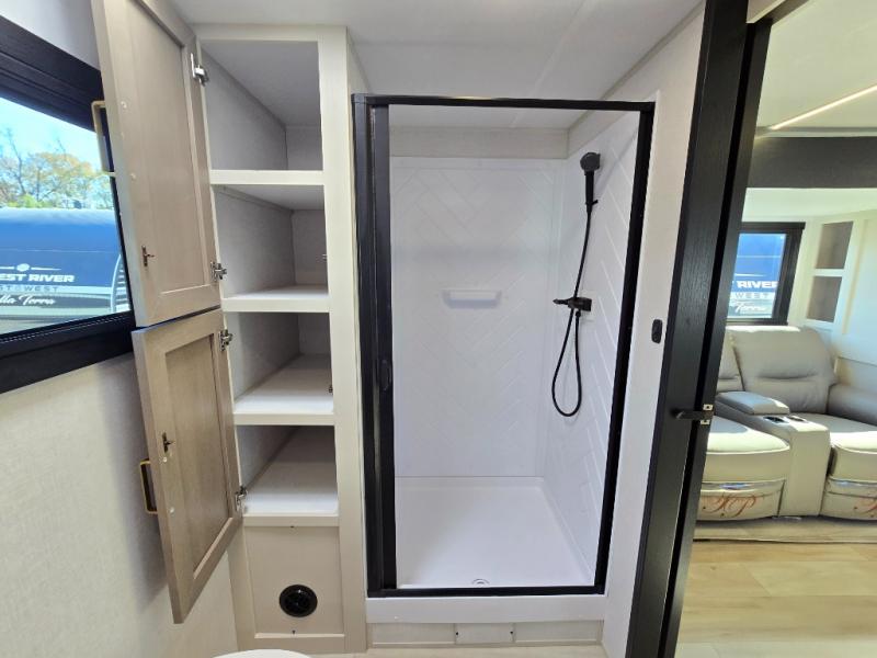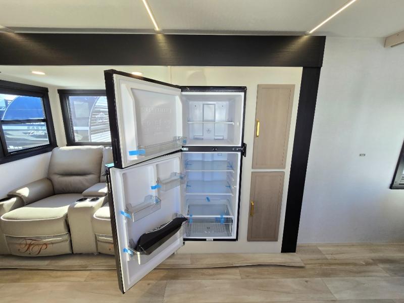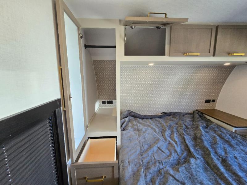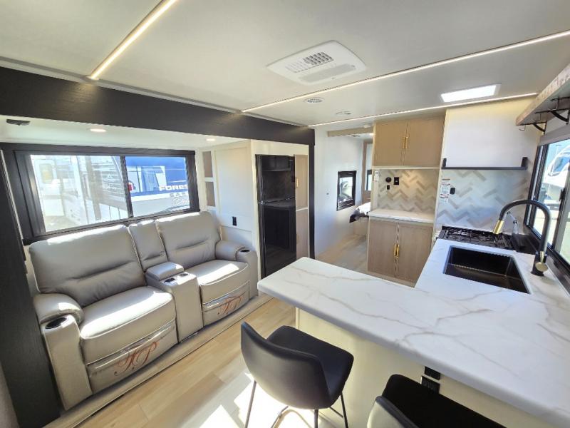 If you like to have travel in complete comfort, this couples trailer offers theater seating so you can relax after a long trip. The kitchen has full amenities including a 12V black refrigerator and a pantry for your goods. The rear bath offers a shower to freshen up, a large dual sink vanity, and everything else you need to stay clean without having to use the public facilities. The front bedroom offers a space saving door, a queen bed and overhead cabinets. You will also find a Texas-sized pass-through compartment outside for the outdoor gear such as camping chairs, charcoal, and such.
