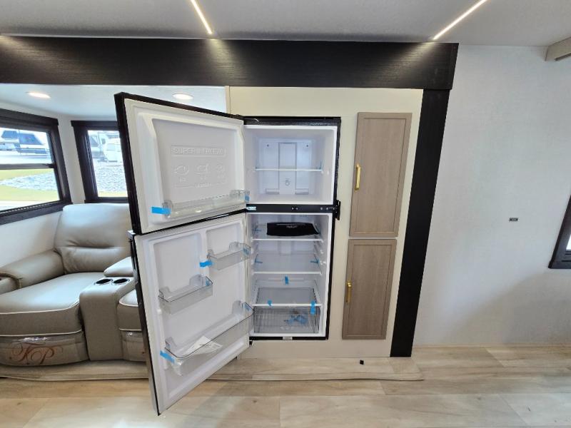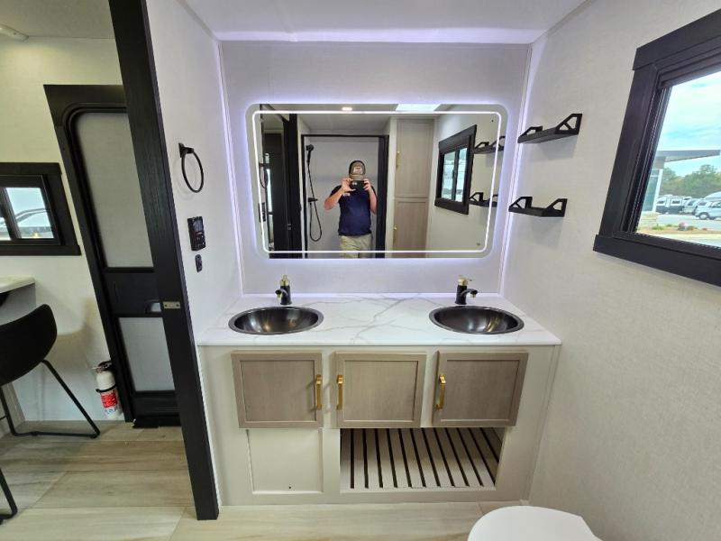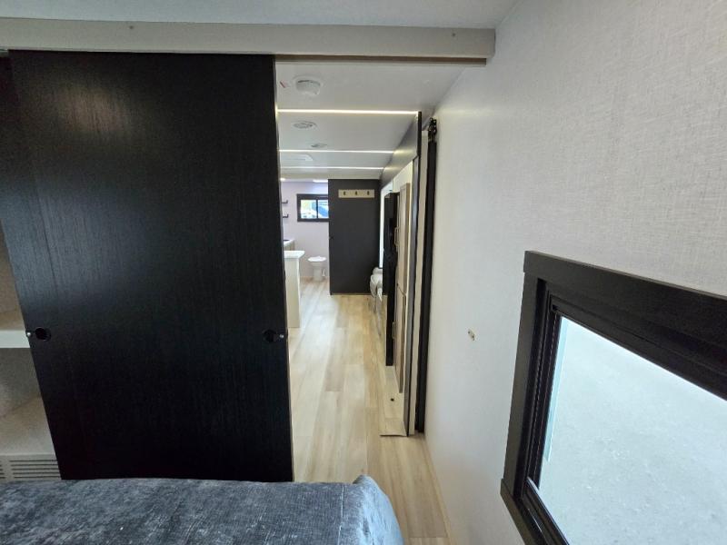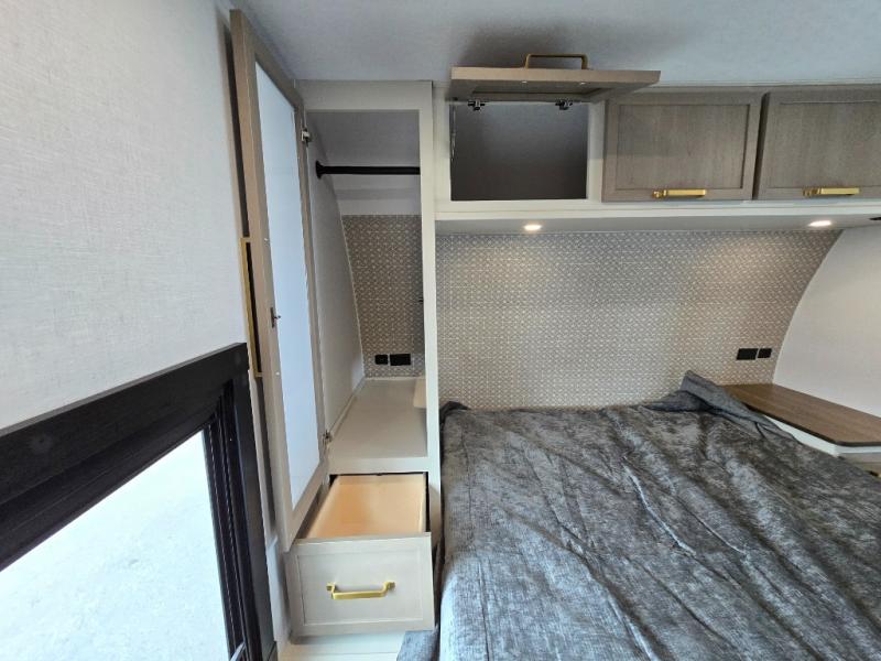 If you like to have travel in complete comfort, this couples trailer offers theater seating so you can relax after a long trip. The kitchen has full amenities including a 12V black refrigerator and a pantry for your goods. The rear bath offers a shower to freshen up, a large dual sink vanity, and everything else you need to stay clean without having to use the public facilities. The front bedroom offers a space saving door, a queen bed and overhead cabinets. You will also find a Texas-sized pass-through compartment outside for the outdoor gear such as camping chairs, charcoal, and such.