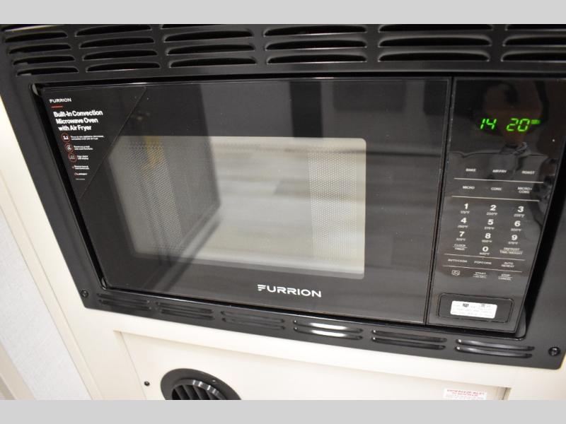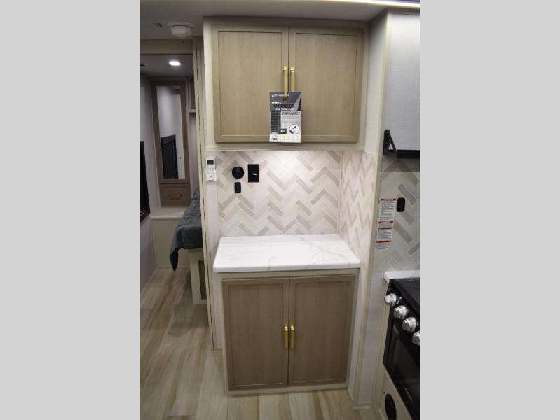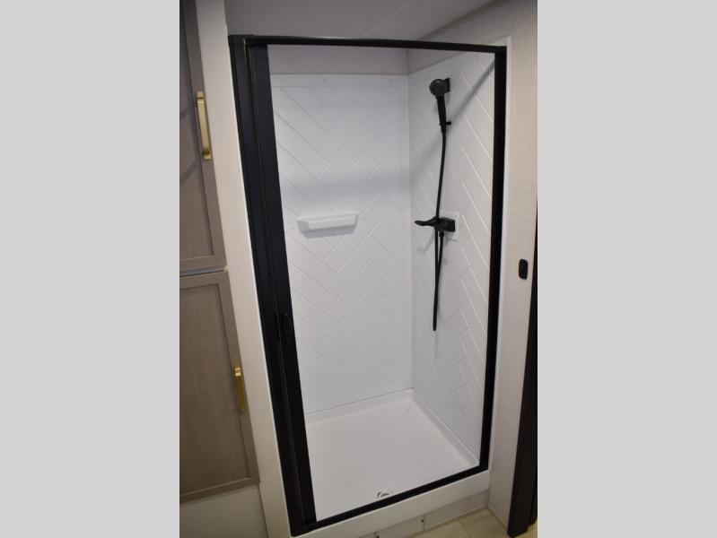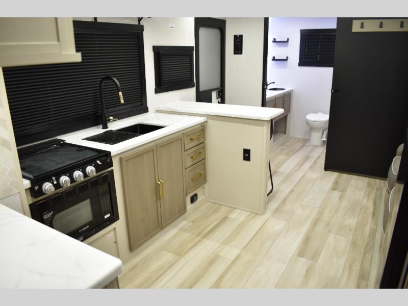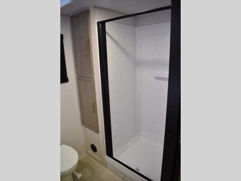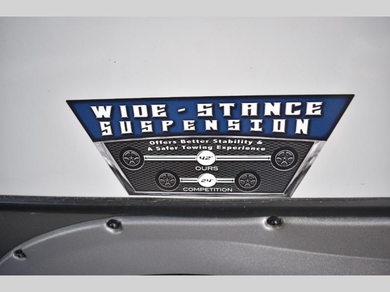 The Wildwood Heritage Glen Hyper-Lyte travel trailer by Forest River offers stability with a wide stance axle system, easy setup with a power tongue jack with an LED docking light, and safe entry with the Step Above aluminum entry steps. The interior includes Temple Cherry cabinetry with matte gold hardware, hidden hinges on the cabinet doors, and a residential single bowl undermount sink. You will also find a back-up camera prep and solar prep, an outdoor shower, and many more exterior conveniences.