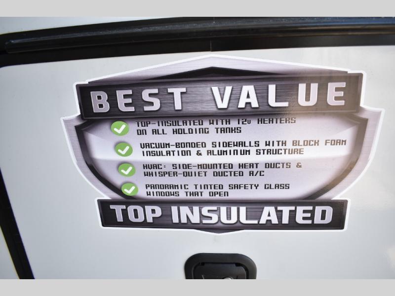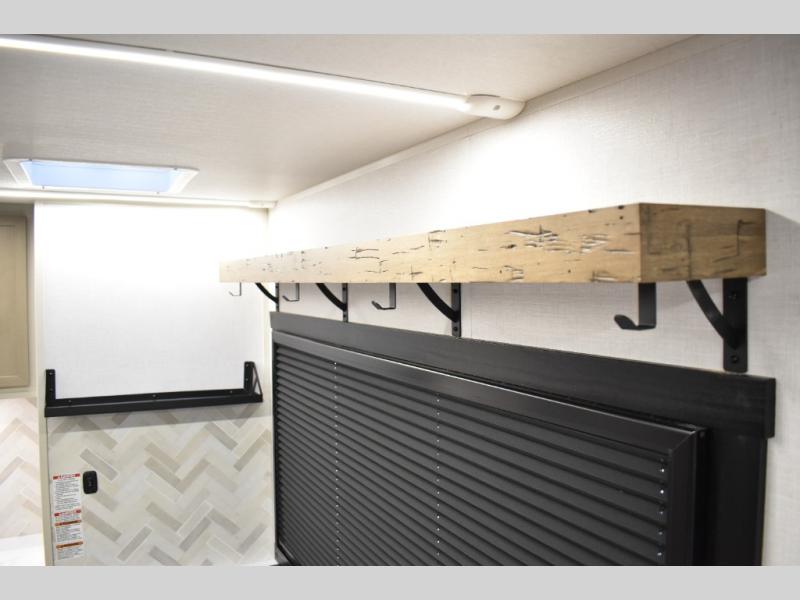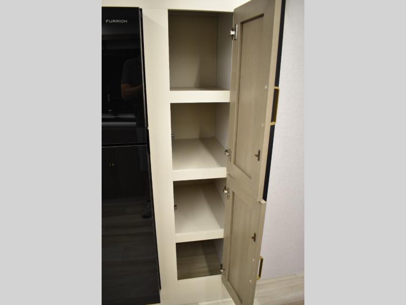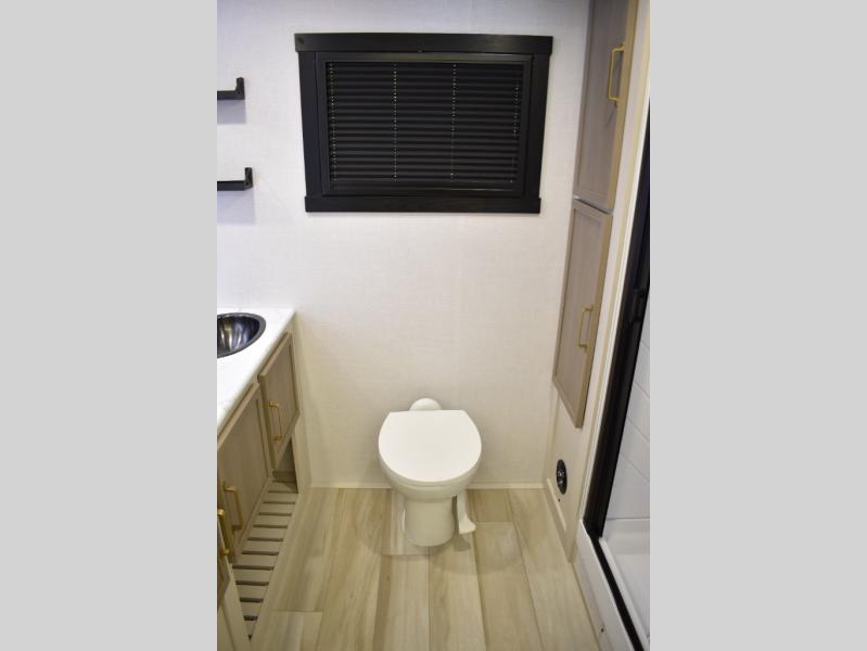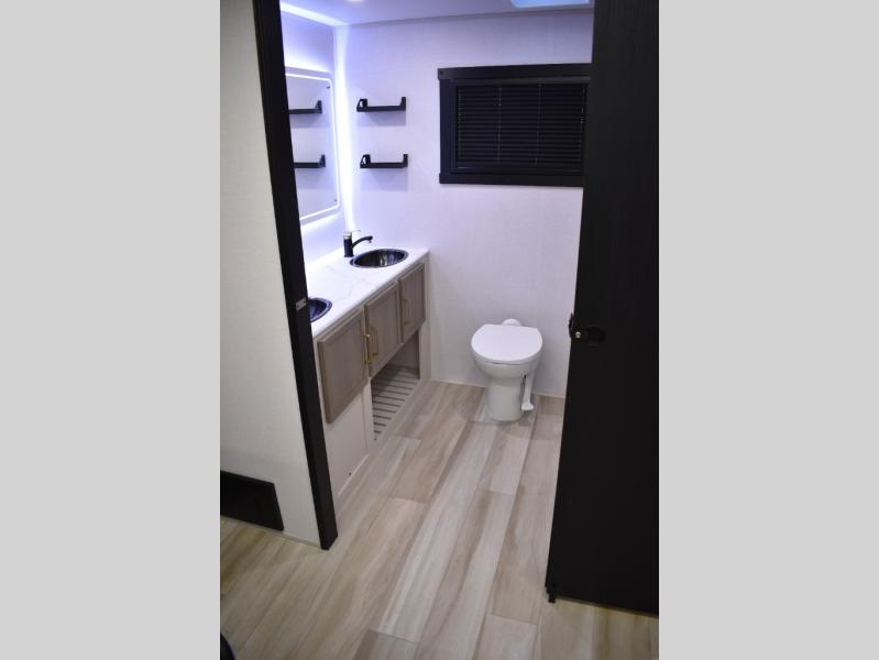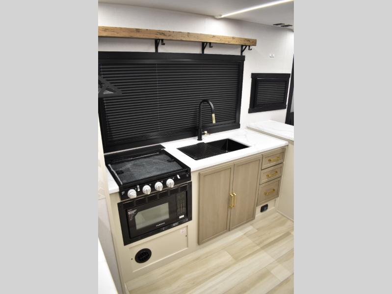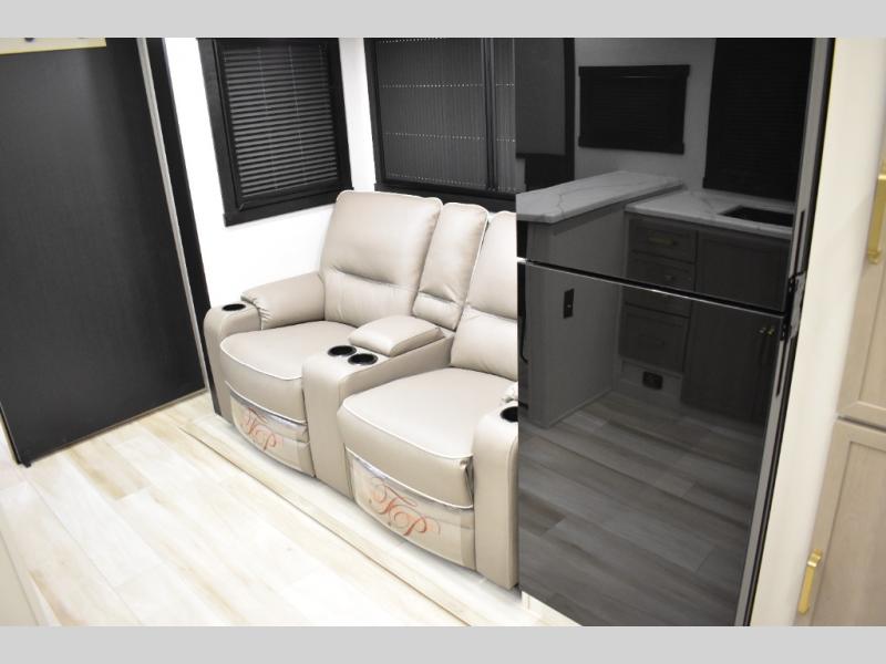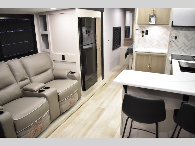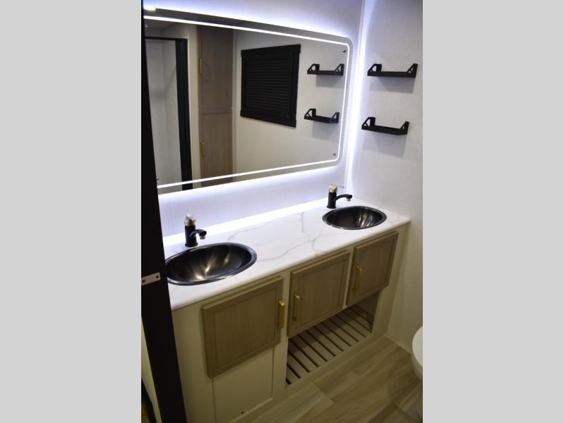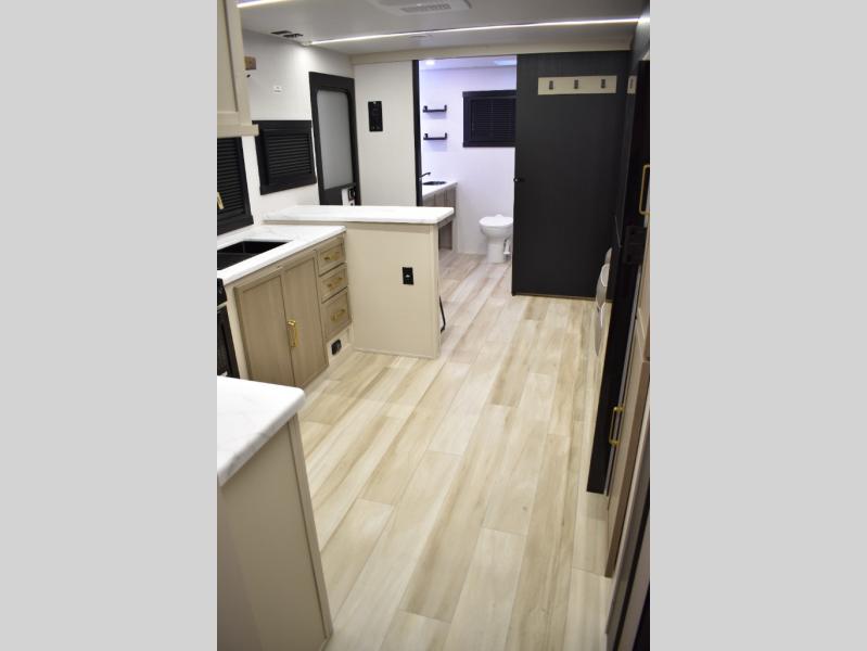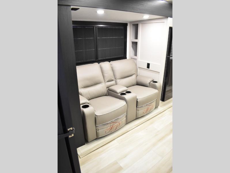 If you like to have travel in complete comfort, this couples trailer offers theater seating so you can relax after a long trip. The kitchen has full amenities including a 12V black refrigerator and a pantry for your goods. The rear bath offers a shower to freshen up, a large dual sink vanity, and everything else you need to stay clean without having to use the public facilities. The front bedroom offers a space saving door, a queen bed and overhead cabinets. You will also find a Texas-sized pass-through compartment outside for the outdoor gear such as camping chairs, charcoal, and such.