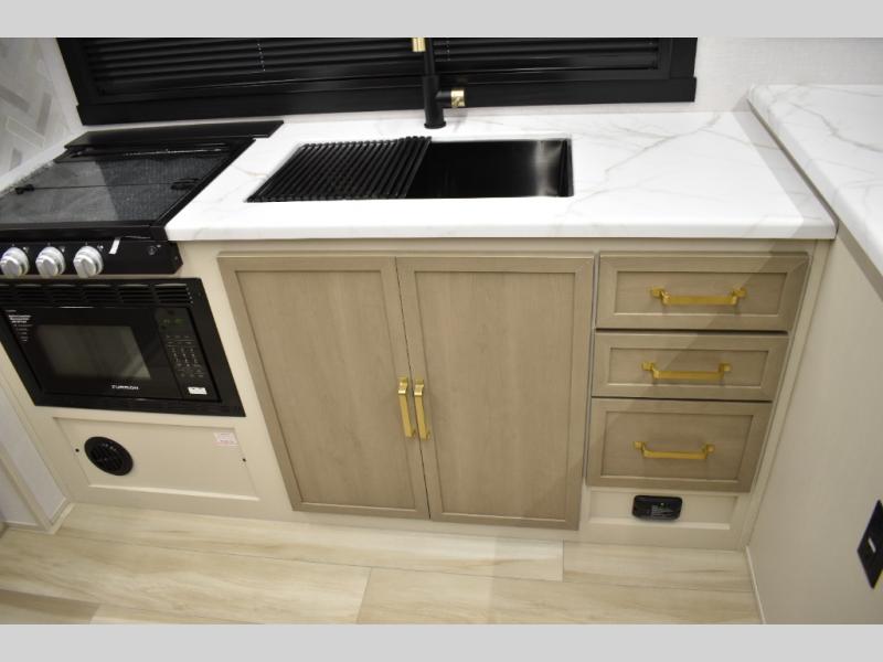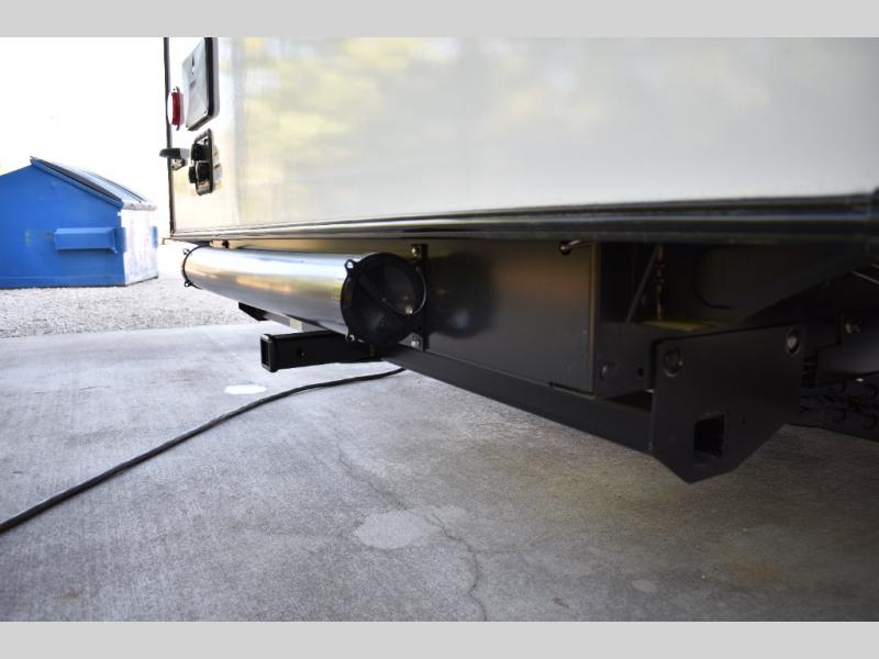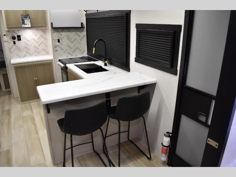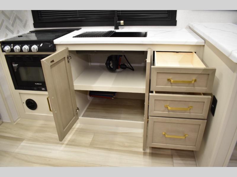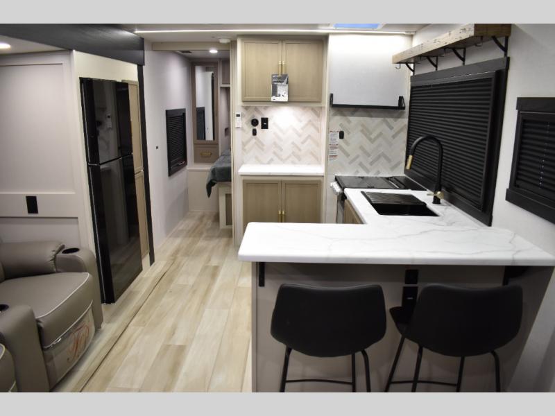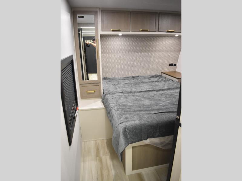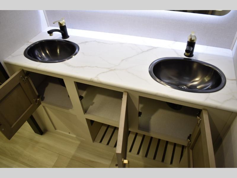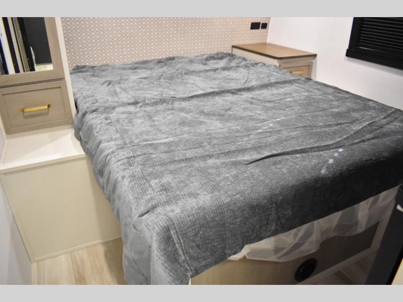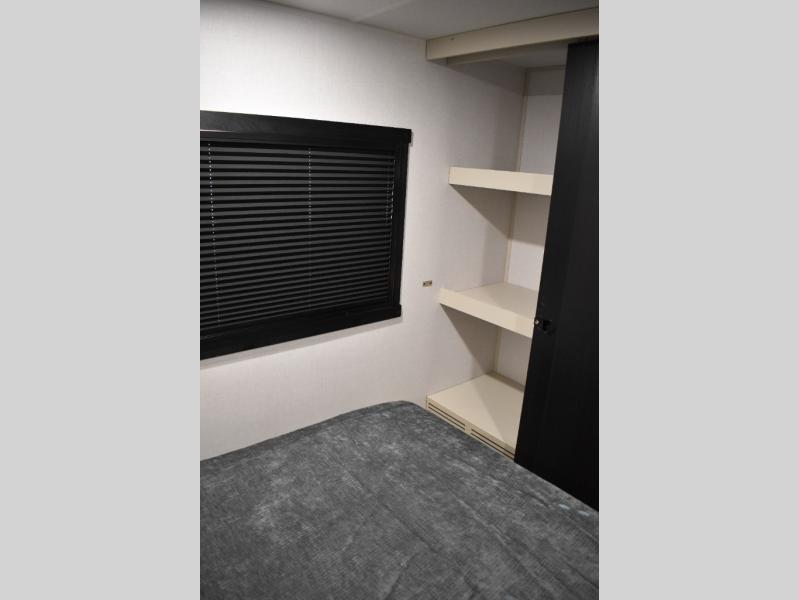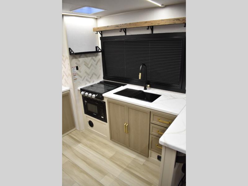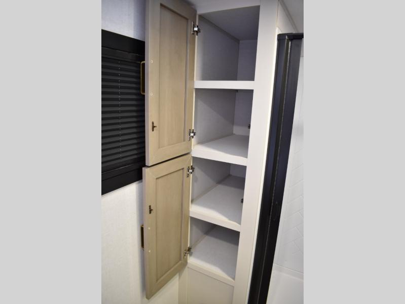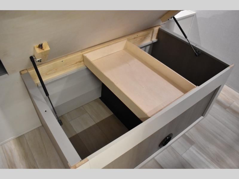 If you like to have travel in complete comfort, this couples trailer offers theater seating so you can relax after a long trip. The kitchen has full amenities including a 12V black refrigerator and a pantry for your goods. The rear bath offers a shower to freshen up, a large dual sink vanity, and everything else you need to stay clean without having to use the public facilities. The front bedroom offers a space saving door, a queen bed and overhead cabinets. You will also find a Texas-sized pass-through compartment outside for the outdoor gear such as camping chairs, charcoal, and such.