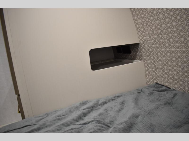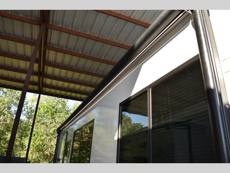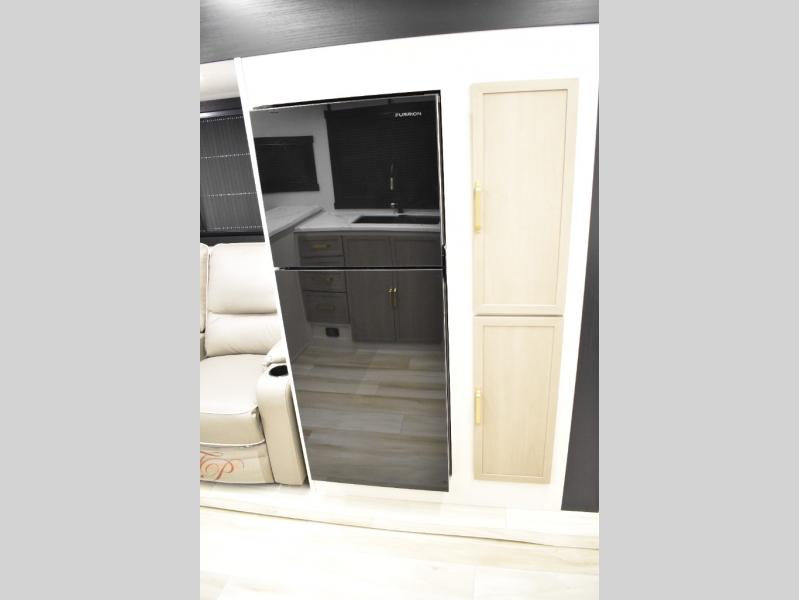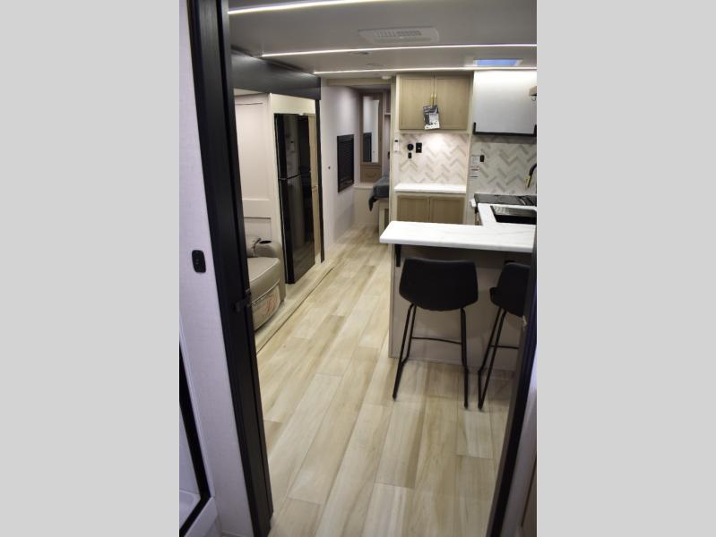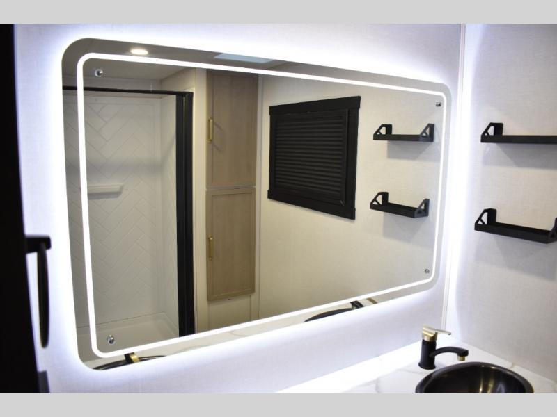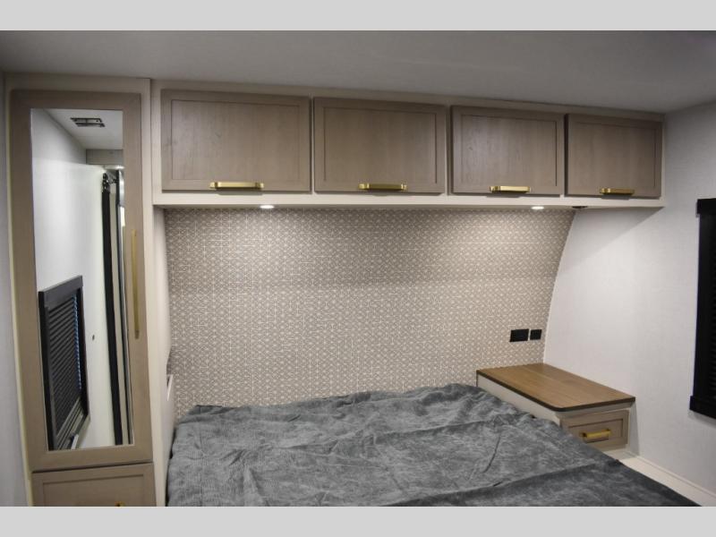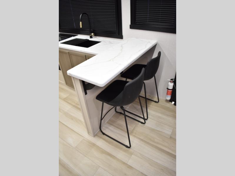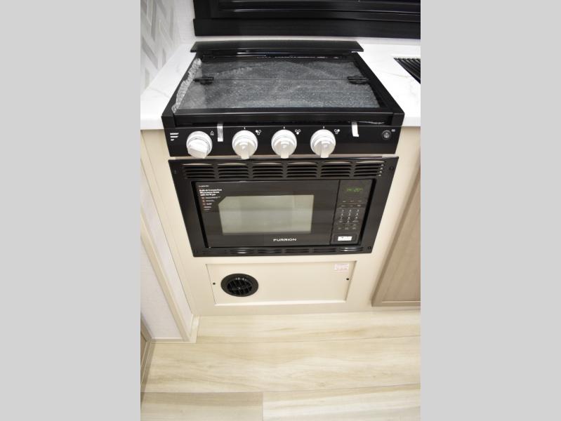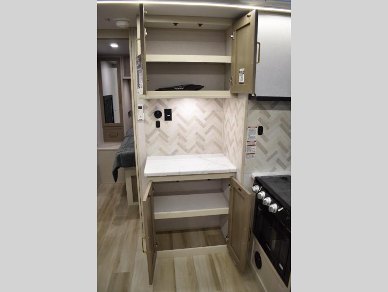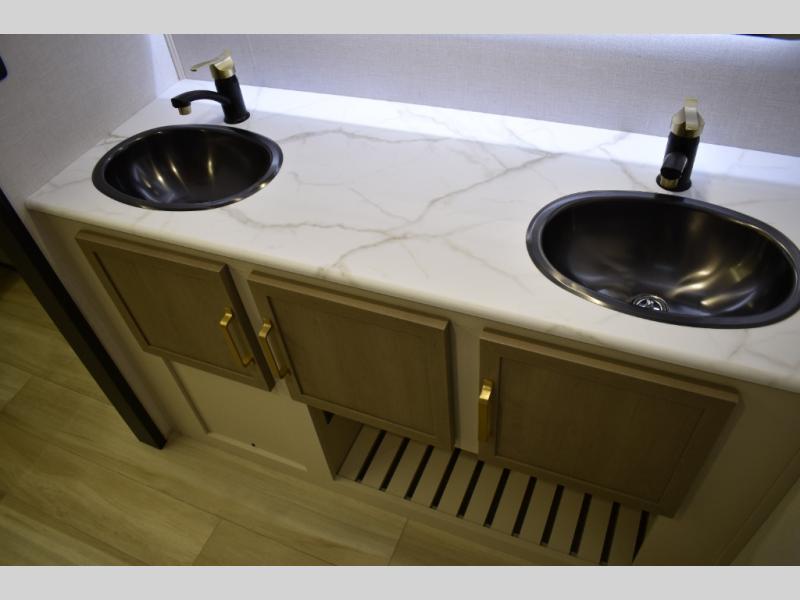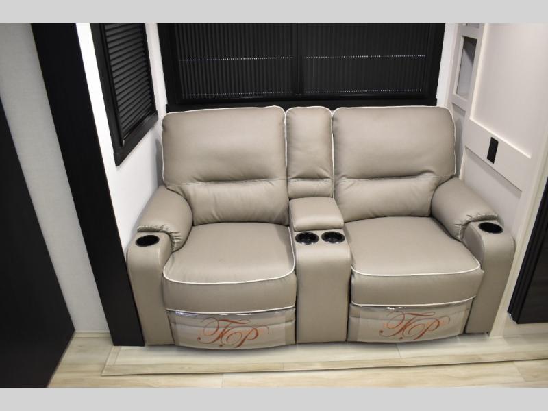 If you like to have travel in complete comfort, this couples trailer offers theater seating so you can relax after a long trip. The kitchen has full amenities including a 12V black refrigerator and a pantry for your goods. The rear bath offers a shower to freshen up, a large dual sink vanity, and everything else you need to stay clean without having to use the public facilities. The front bedroom offers a space saving door, a queen bed and overhead cabinets. You will also find a Texas-sized pass-through compartment outside for the outdoor gear such as camping chairs, charcoal, and such.