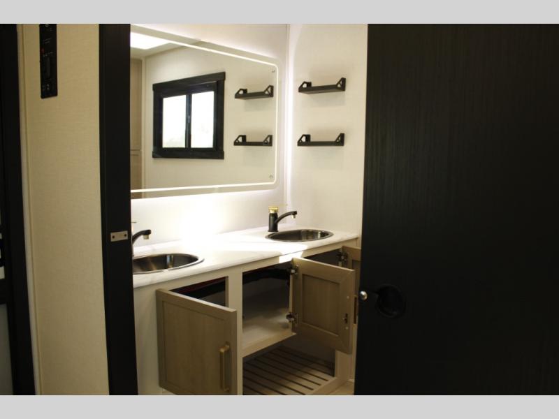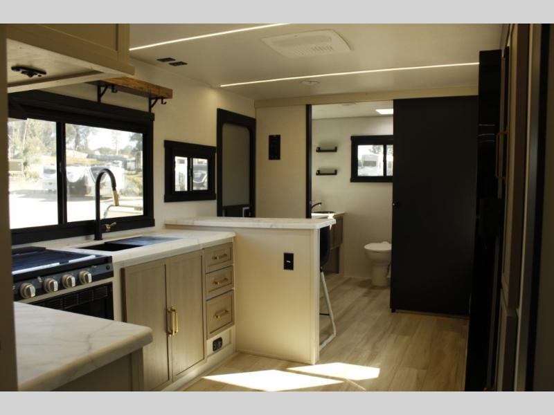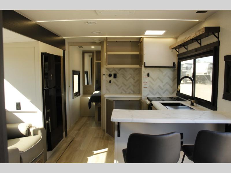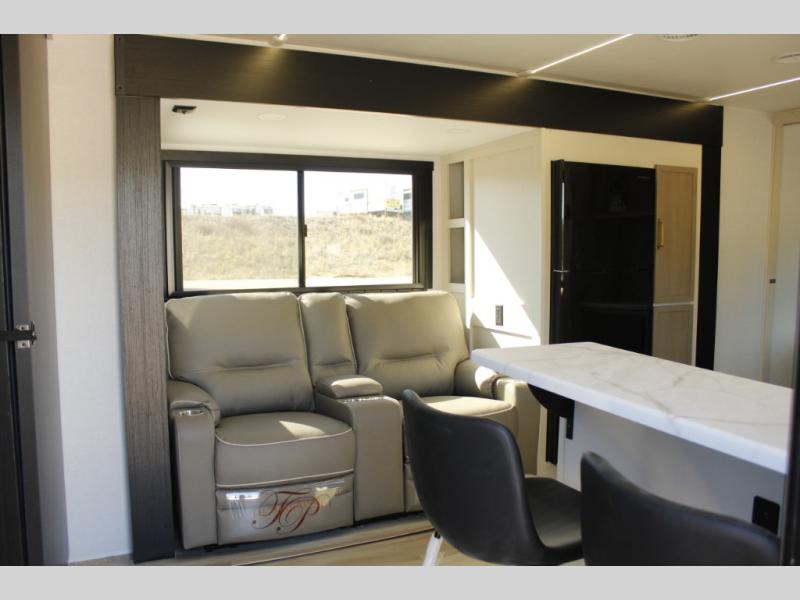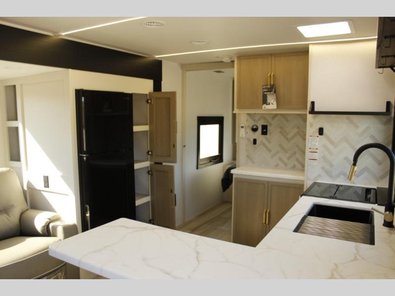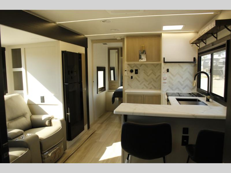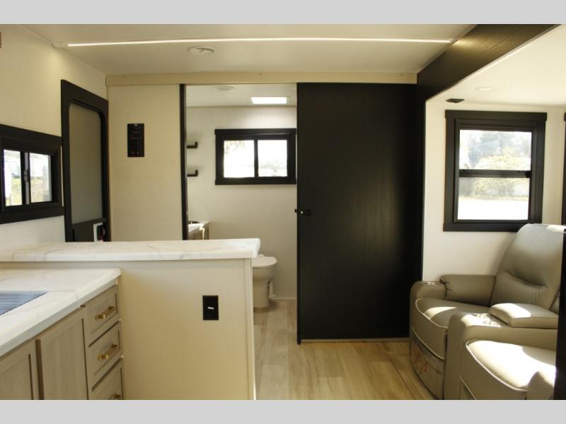 If you've been looking to upgrade your RV, the time is now and the this travel trailer is the one! You will love being able to cook indoors on the three burner cooktop or outdoors on the exterior griddle, plus there is a 19' awning with LED lights for an inviting space. Inside, you can dine around the U-shaped dinette, and this area can become sleeping space for one to two guests. Kick up your feet on the theater seating across from the 40" LED TV and fireplace, then clean up in the walk-through bath before bed. Speaking of bed, you'll love the walk-around queen bed with Versa-Tilt in the master bedroom, and you'll find the second entry door here as well for convenience!