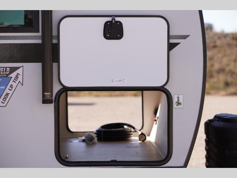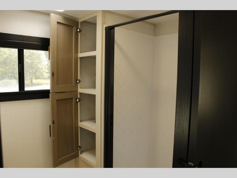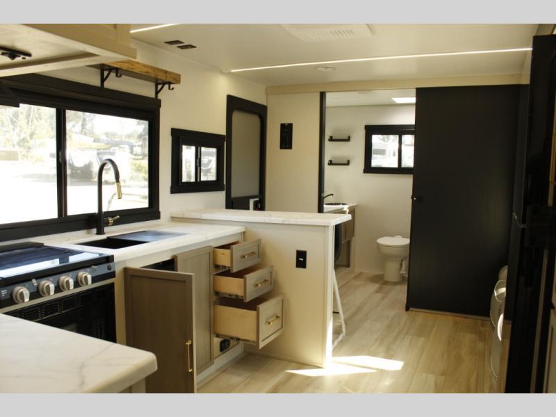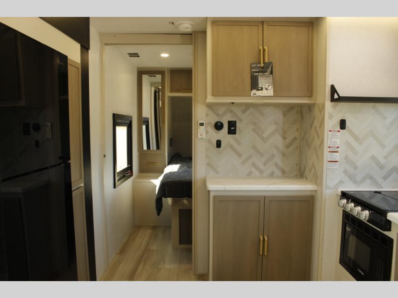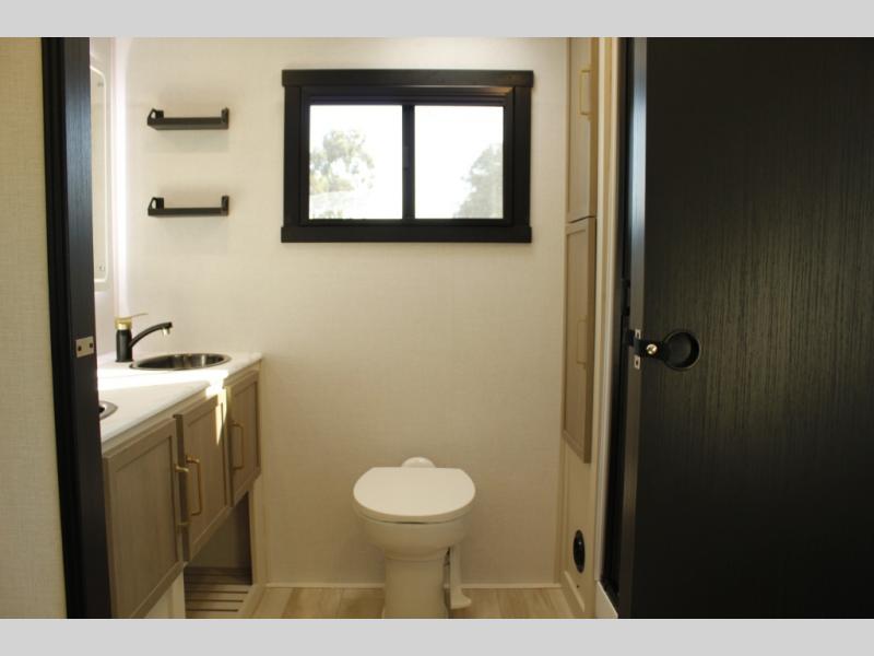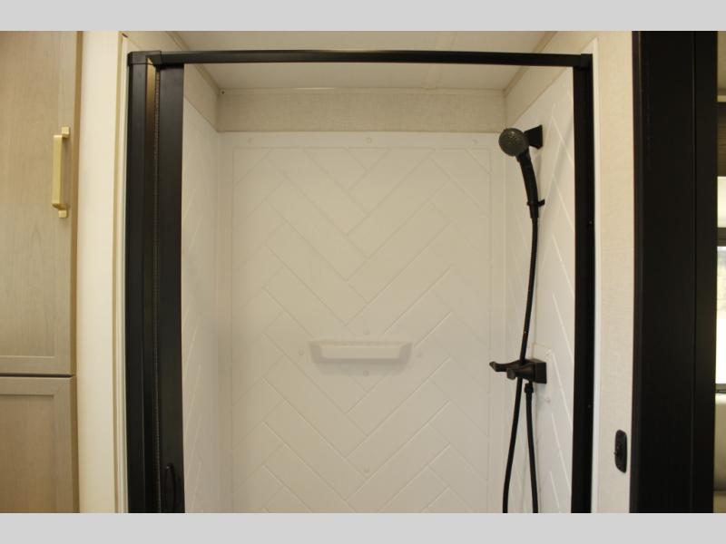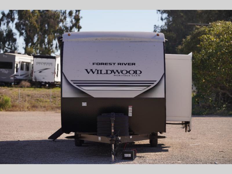 The Wildwood Heritage Glen Hyper-Lyte travel trailer by Forest River offers stability with a wide stance axle system, easy setup with a power tongue jack with an LED docking light, and safe entry with the Step Above aluminum entry steps. The interior includes Temple Cherry cabinetry with matte gold hardware, hidden hinges on the cabinet doors, and a residential single bowl undermount sink. You will also find a back-up camera prep and solar prep, an outdoor shower, Maxxis radial tires, and many more exterior conveniences.
