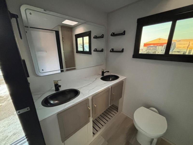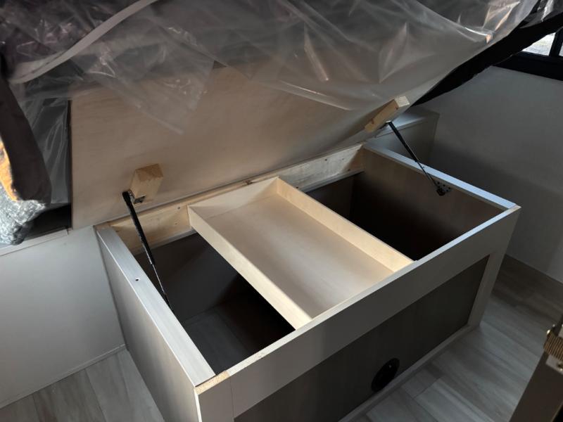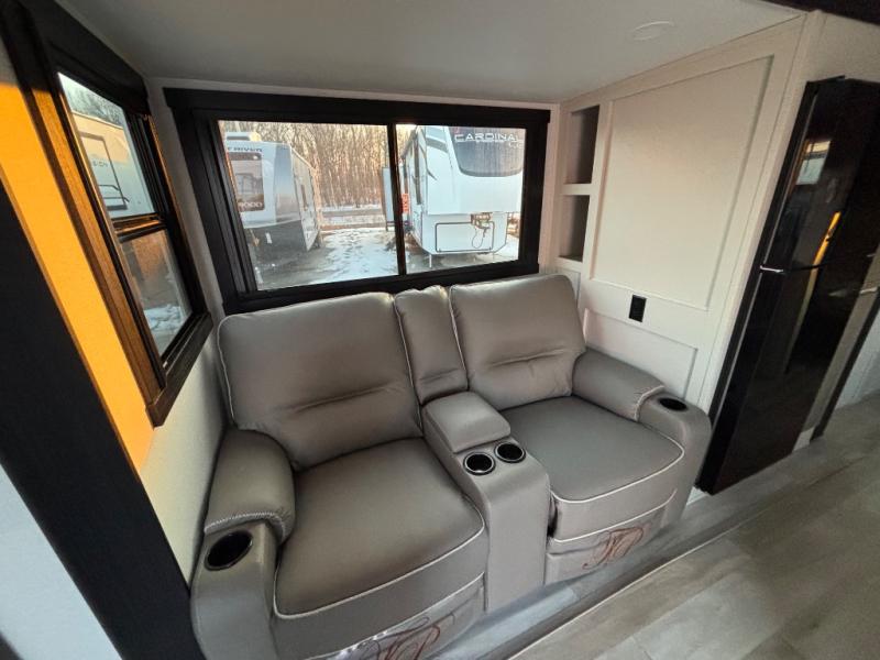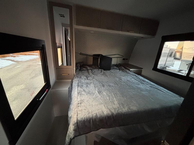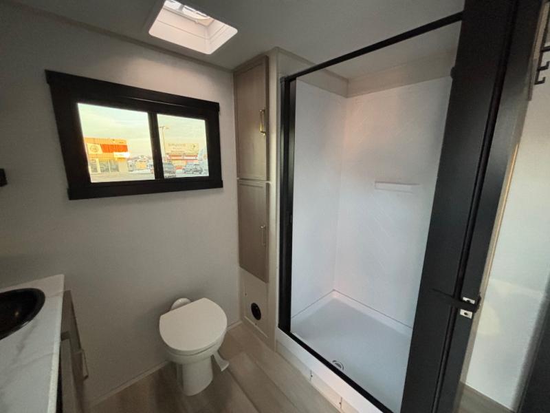 If you like to have travel in complete comfort, this couples trailer offers theater seating so you can relax after a long trip. The kitchen has full amenities including a 12V black refrigerator and a pantry for your goods. The rear bath offers a shower to freshen up, a large dual sink vanity, and everything else you need to stay clean without having to use the public facilities. The front bedroom offers a space saving door, a queen bed and overhead cabinets. You will also find a Texas-sized pass-through compartment outside for the outdoor gear such as camping chairs, charcoal, and such.