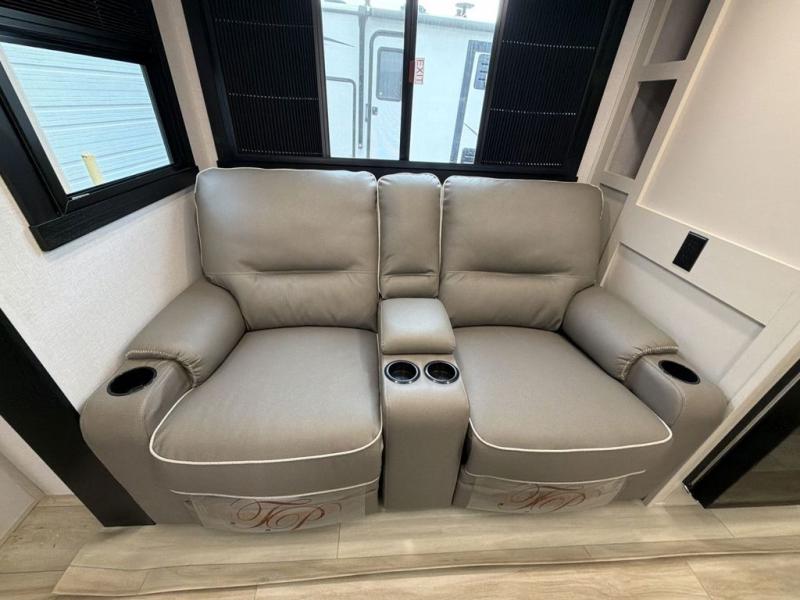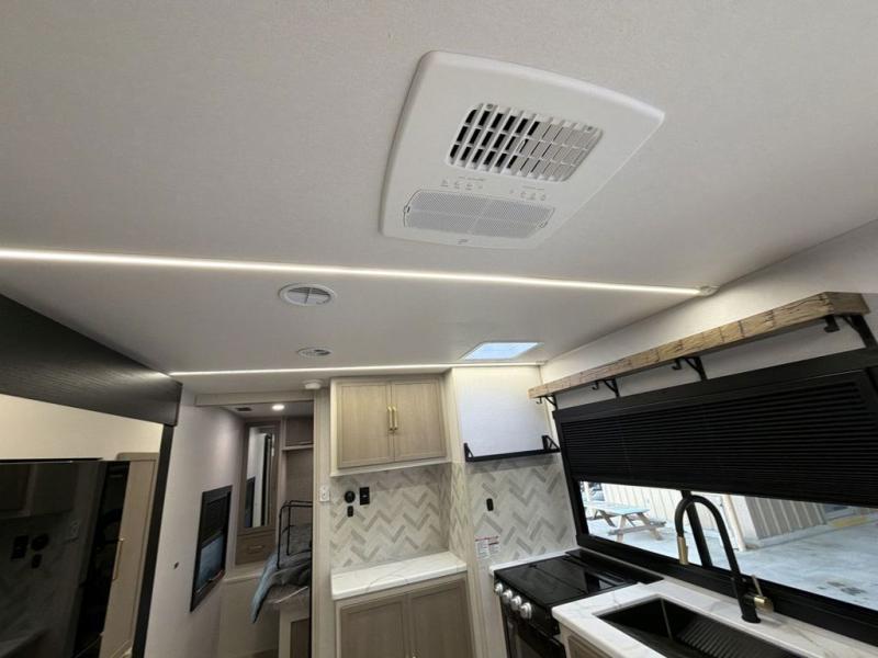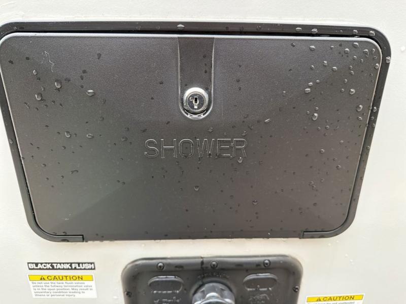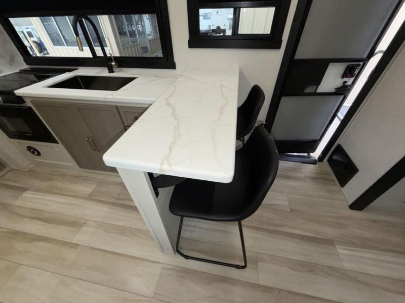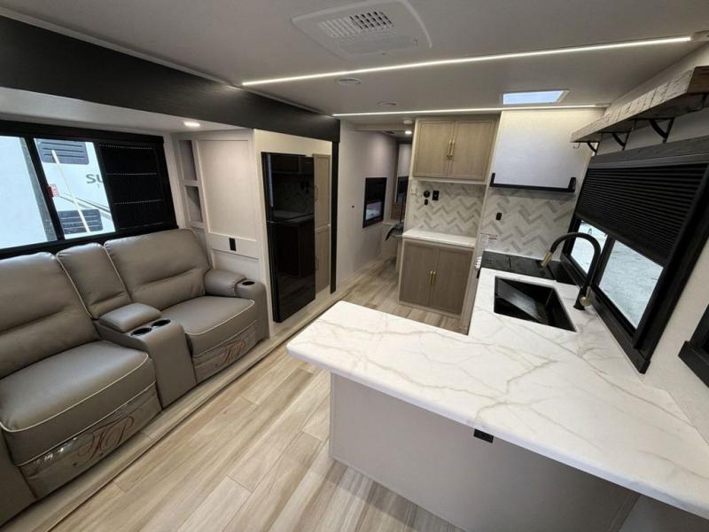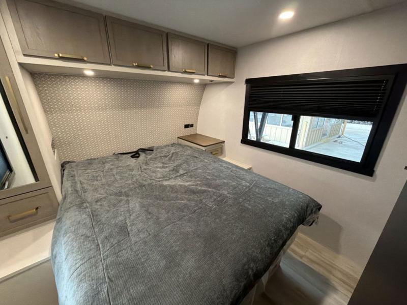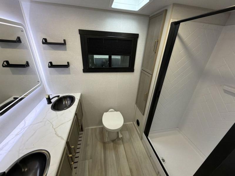 If you like to have travel in complete comfort, this couples trailer offers theater seating so you can relax after a long trip. The kitchen has full amenities including a 12V black refrigerator and a pantry for your goods. The rear bath offers a shower to freshen up, a large dual sink vanity, and everything else you need to stay clean without having to use the public facilities. The front bedroom offers a space saving door, a queen bed and overhead cabinets. You will also find a Texas-sized pass-through compartment outside for the outdoor gear such as camping chairs, charcoal, and such.