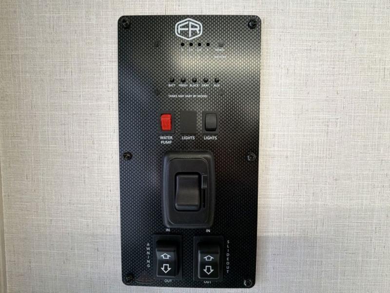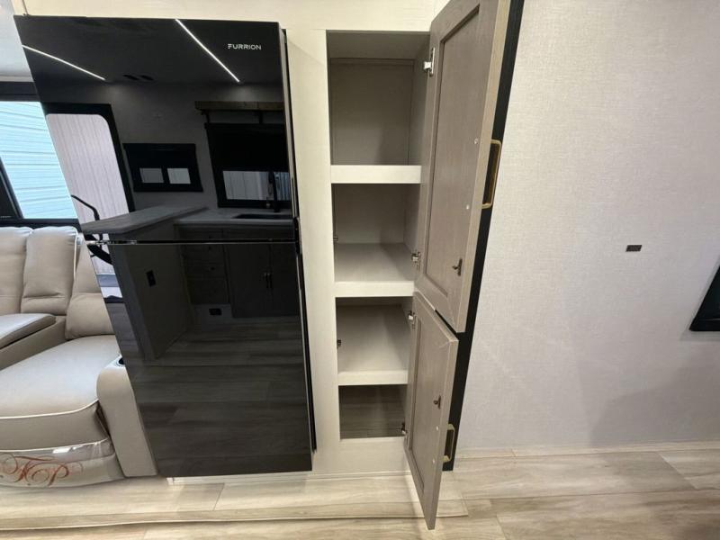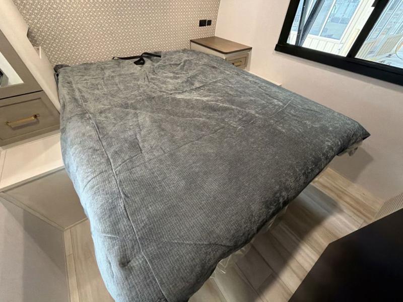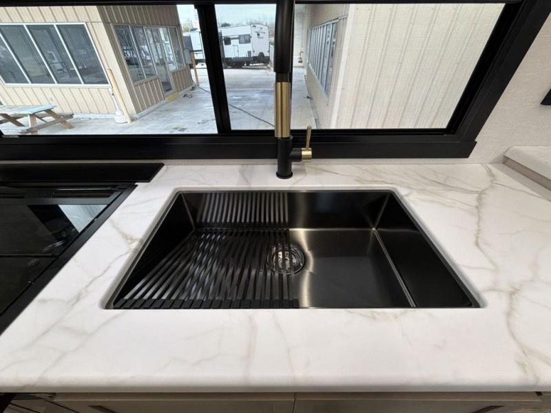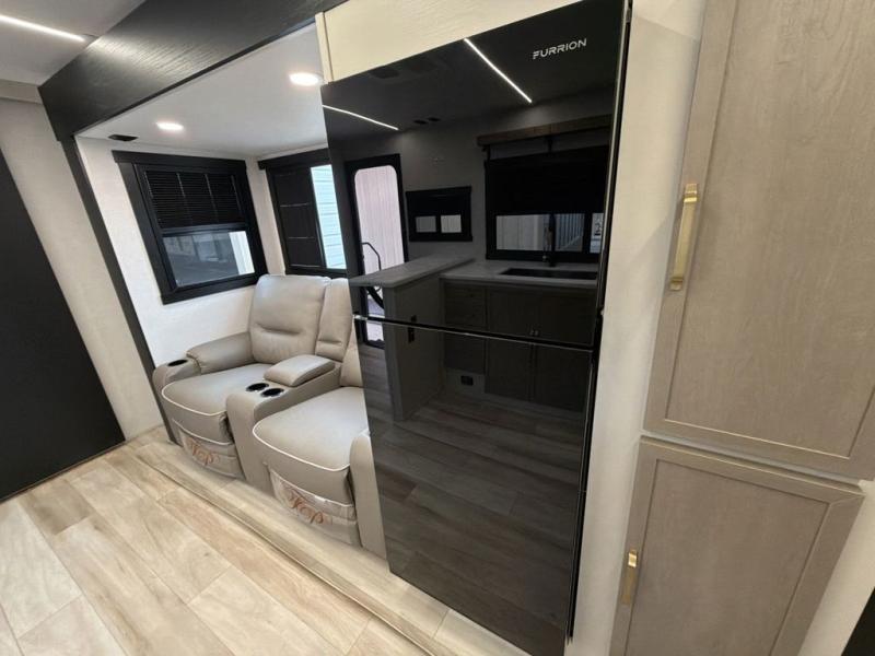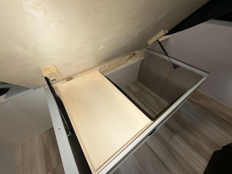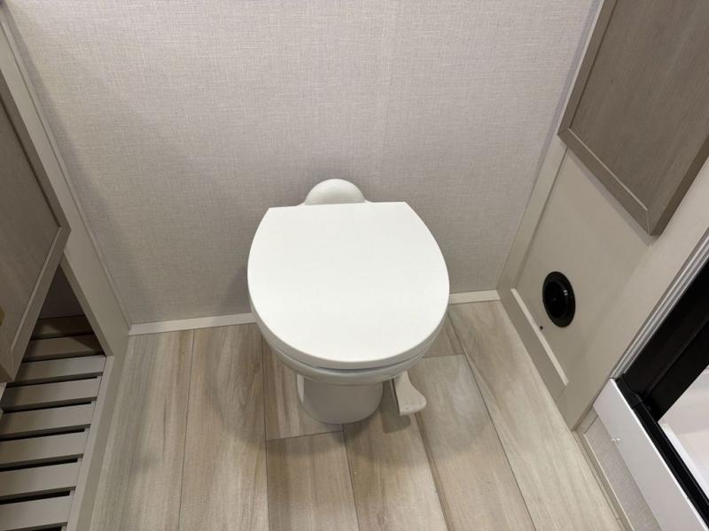 If you like to have travel in complete comfort, this couples trailer offers theater seating so you can relax after a long trip. The kitchen has full amenities including a 12V black refrigerator and a pantry for your goods. The rear bath offers a shower to freshen up, a large dual sink vanity, and everything else you need to stay clean without having to use the public facilities. The front bedroom offers a space saving door, a queen bed and overhead cabinets. You will also find a Texas-sized pass-through compartment outside for the outdoor gear such as camping chairs, charcoal, and such.