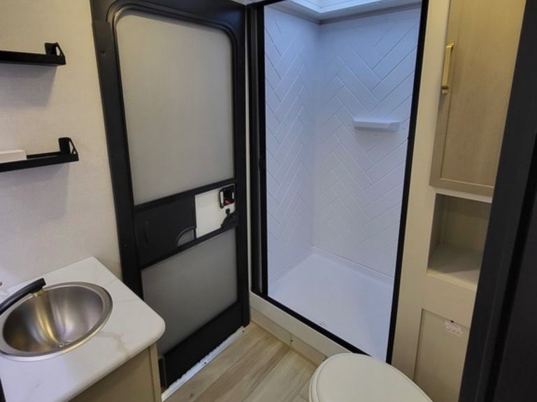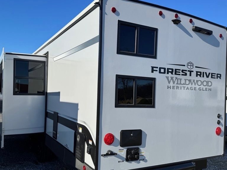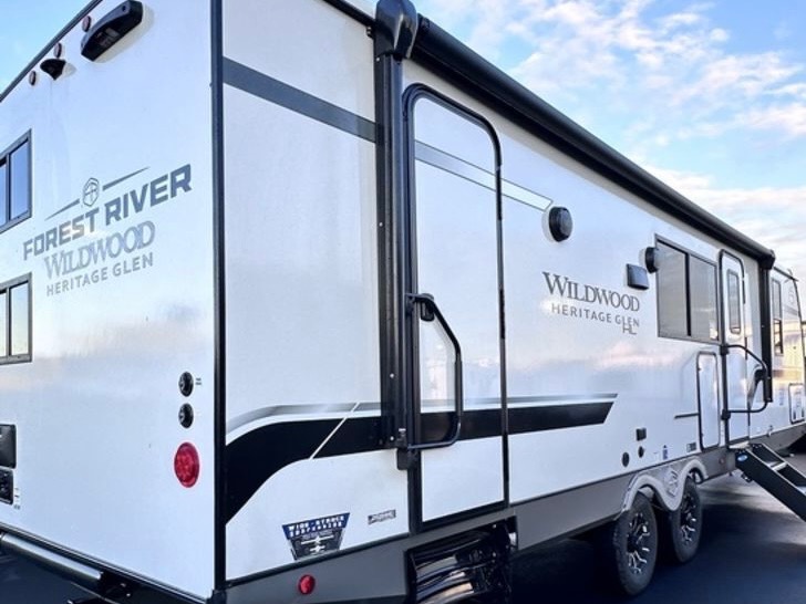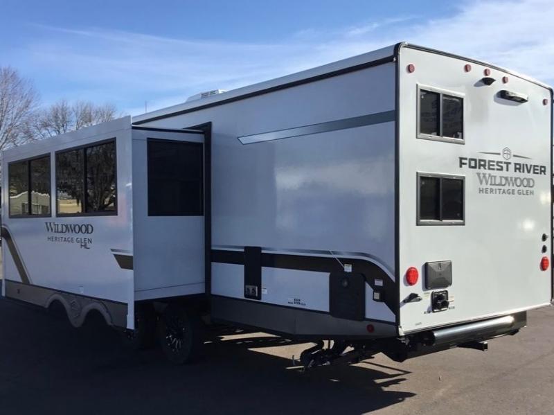 The Wildwood Heritage Glen Hyper-Lyte travel trailer by Forest River offers stability with a wide stance axle system, easy setup with a power tongue jack with an LED docking light, and safe entry with the Step Above aluminum entry steps. The interior includes Temple Cherry cabinetry with matte gold hardware, hidden hinges on the cabinet doors, and a residential single bowl undermount sink. You will also find a back-up camera prep and solar prep, an outdoor shower, Maxxis radial tires, and many more exterior conveniences.