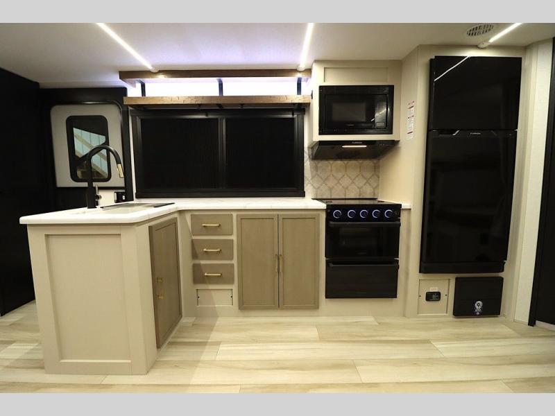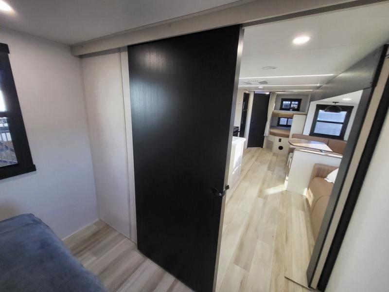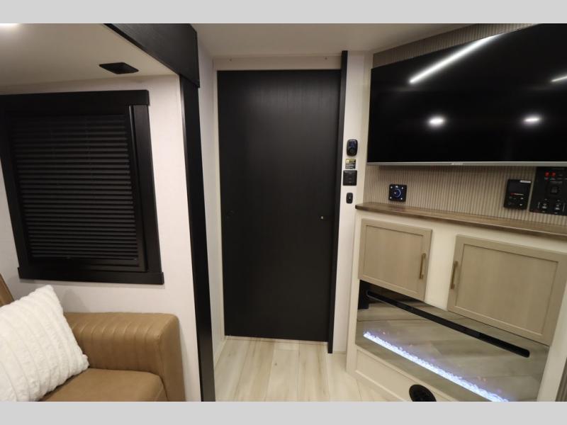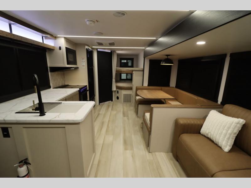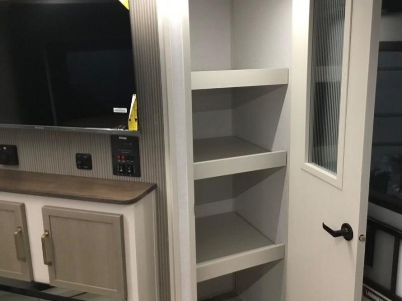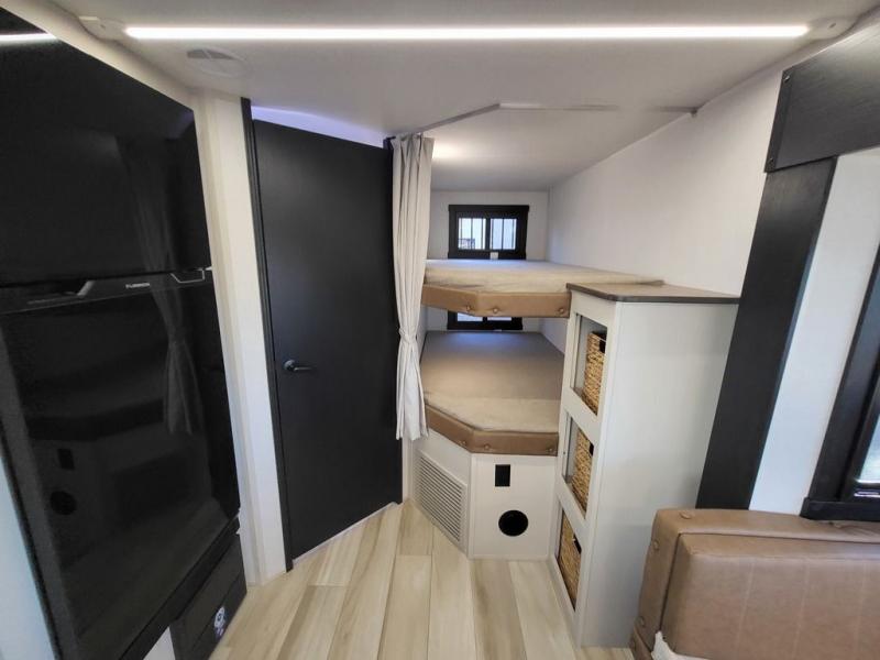 This dual entry travel trailer is the perfect unit to travel with a larger group since there is sleeping for ten! There are double-size bunks in the rear corner, a queen bed with Versa Tilt in the front private bedroom, plus a U-shaped dinette and tri-fold sofa in the main living area. The rear corner bath includes a walk-in shower with a skylight, a spacious linen closet, and one of the dual entry doors for added convenience. The chef of your group will love the camp kitchen window with shelves above for spices, and there is an exterior griddle and mount if they enjoy cooking outdoors. This unit also includes an entertainment center with a 40" LED Smart TV and a fireplace for a cozy evening indoors, and the entry pantry will be perfect to keep snacks stocked!