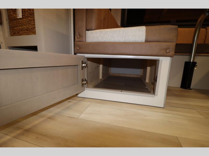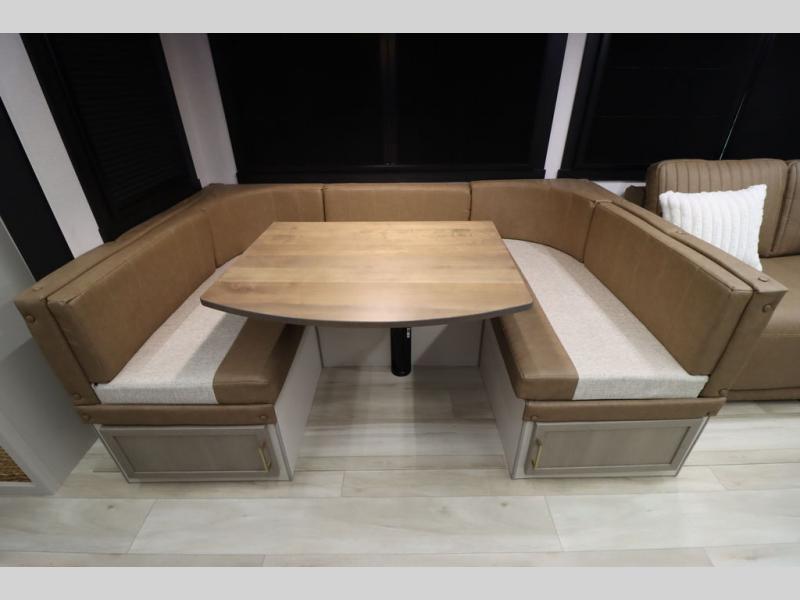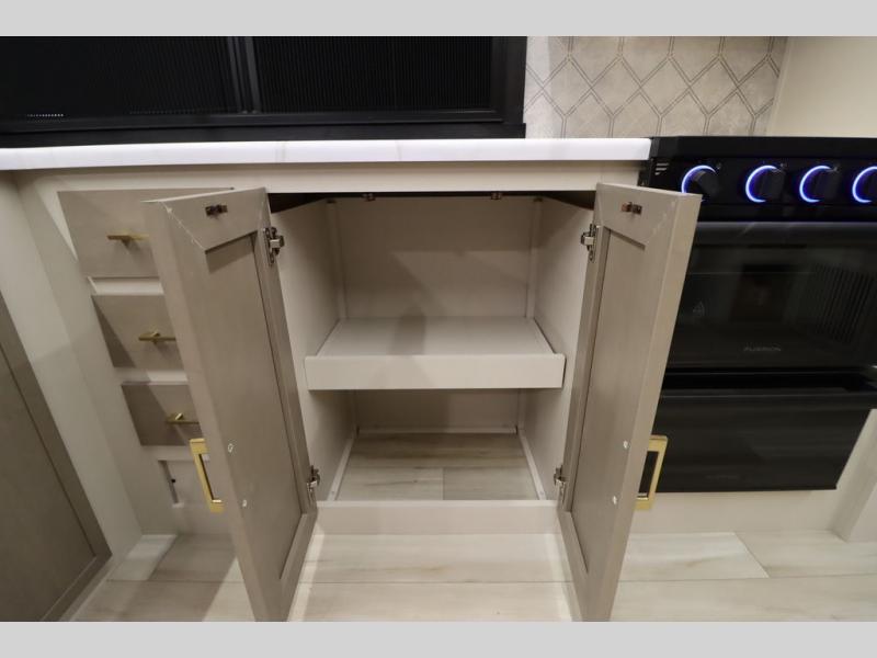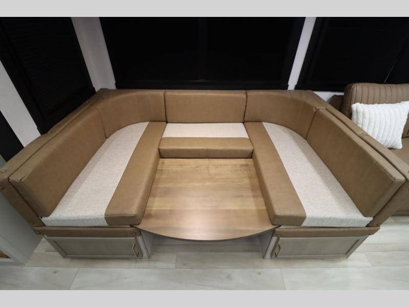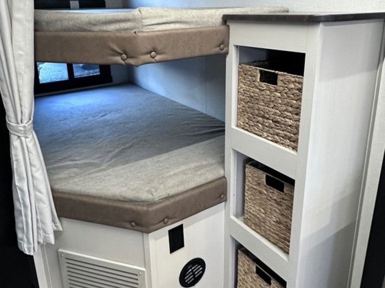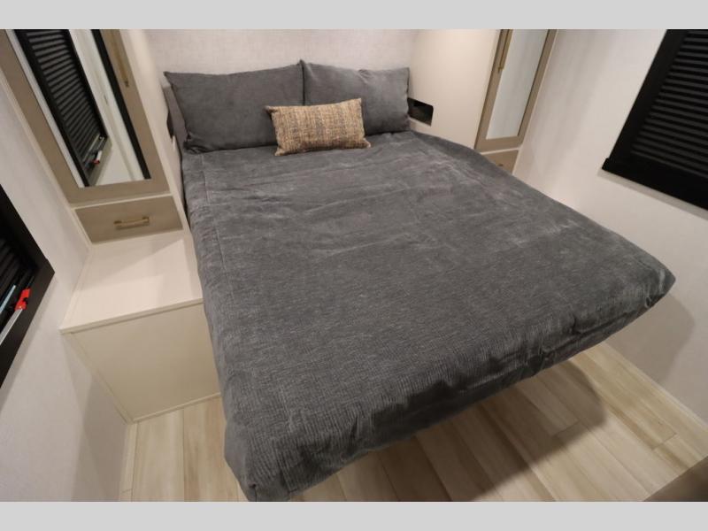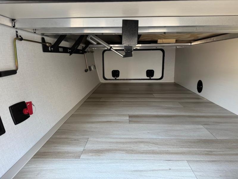This dual entry travel trailer is the perfect unit to travel with a larger group since there is sleeping for ten! There are double-size bunks in the rear corner, a queen bed with Versa Tilt in the front private bedroom, plus a U-shaped dinette and tri-fold sofa in the main living area. The rear corner bath includes a walk-in shower with a skylight, a spacious linen closet, and one of the dual entry doors for added convenience. The chef of your group will love the camp kitchen window with shelves above for spices, and there is an exterior griddle and mount if they enjoy cooking outdoors. This unit also includes an entertainment center with a 40" LED Smart TV and a fireplace for a cozy evening indoors, and the entry pantry will be perfect to keep snacks stocked!