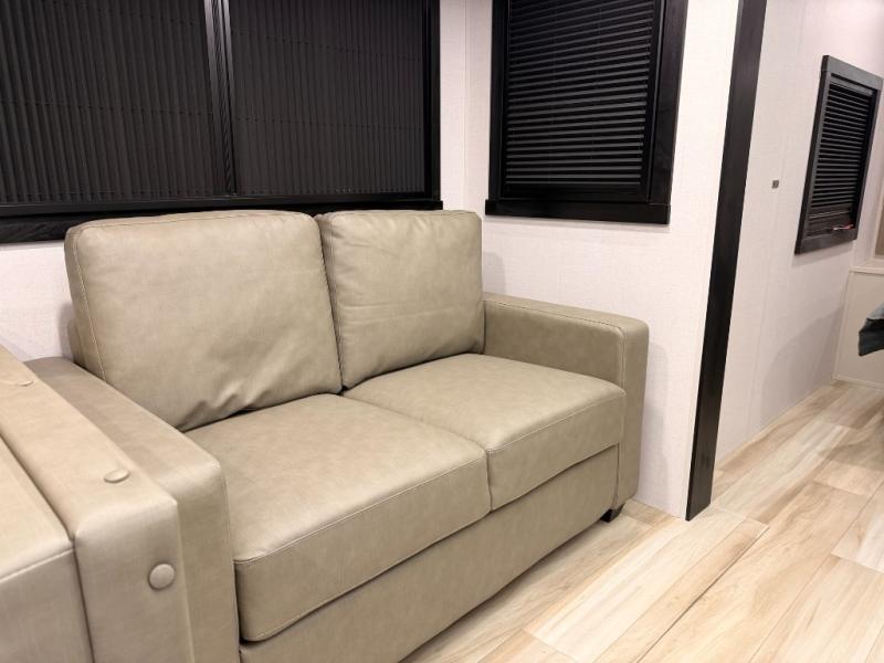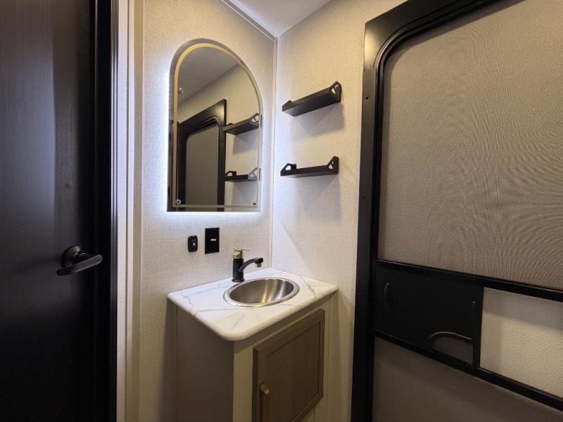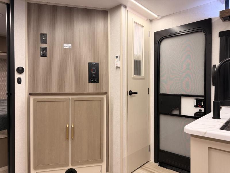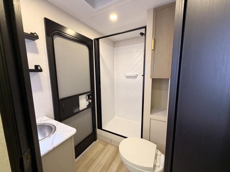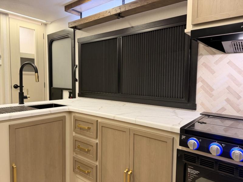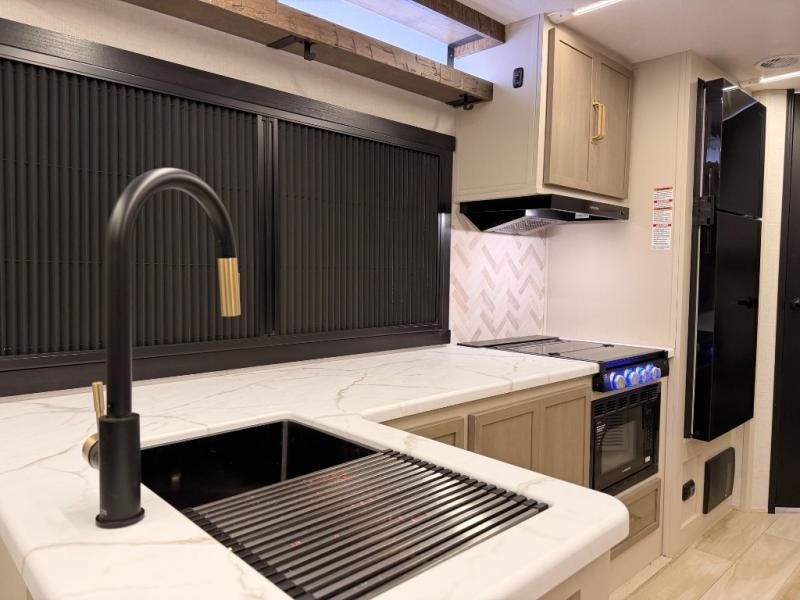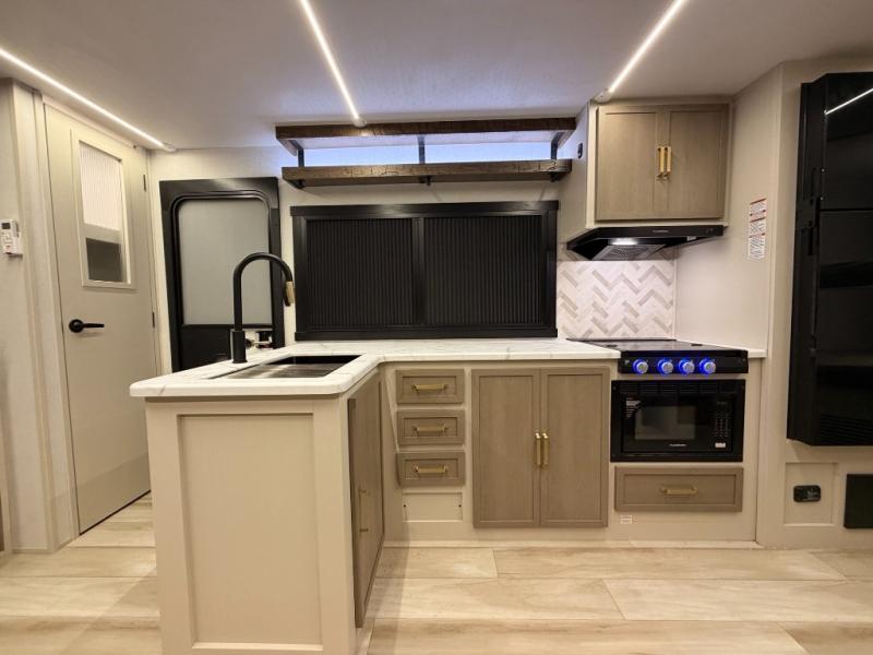 The Wildwood Heritage Glen Hyper-Lyte travel trailer by Forest River offers stability with a wide stance axle system, easy setup with a power tongue jack with an LED docking light, and safe entry with the Step Above aluminum entry steps. The interior includes Temple Cherry cabinetry with matte gold hardware, hidden hinges on the cabinet doors, and a residential single bowl undermount sink. You will also find a back-up camera prep and solar prep, an outdoor shower, and many more exterior conveniences.
