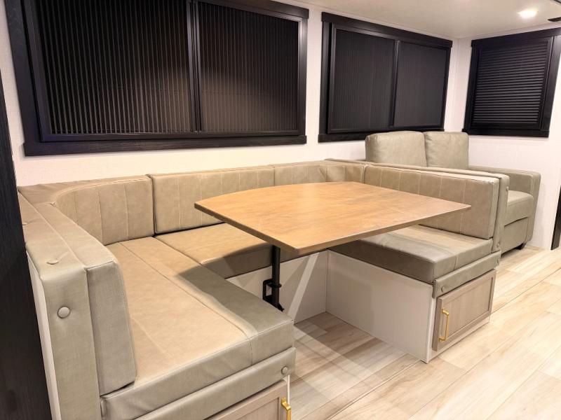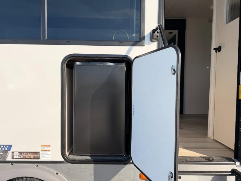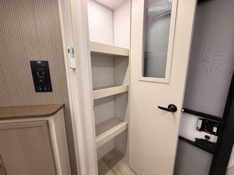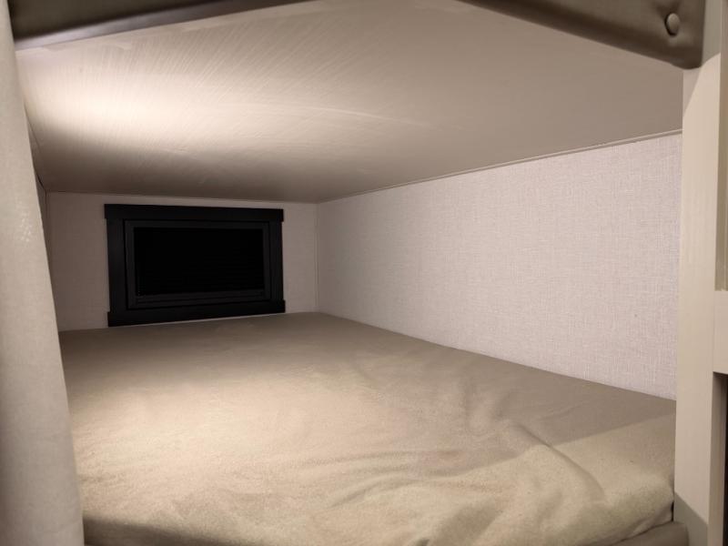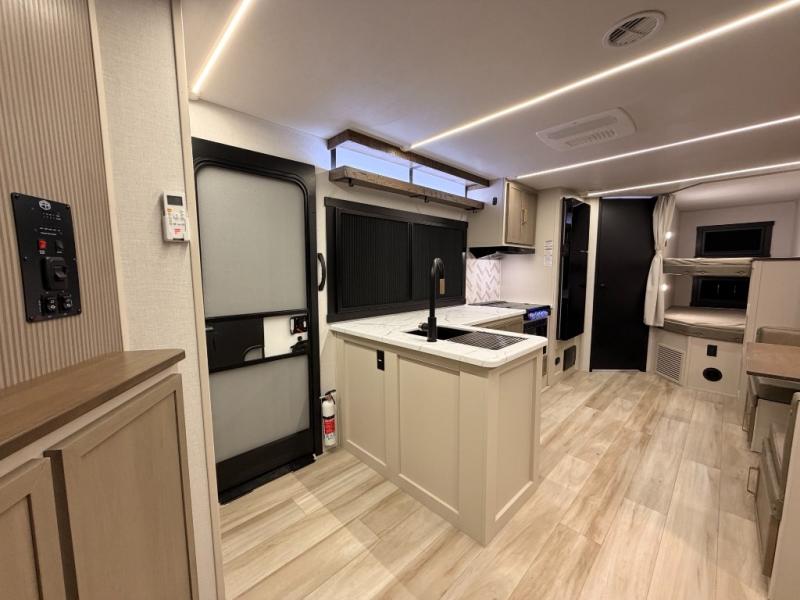 This dual entry travel trailer is the perfect unit to travel with a larger group since there is sleeping for ten! There are double-size bunks in the rear corner, a queen bed in the front private bedroom, plus a U-shaped dinette and tri-fold sofa in the main living area. The rear corner bath includes a shower, a spacious linen closet, and one of the dual entry doors for added convenience. Admire the scenery while cooking thanks to the camp kitchen window with shelf above. This unit also includes an entertainment center with storage below, and the entry pantry will be perfect to keep snacks stocked!