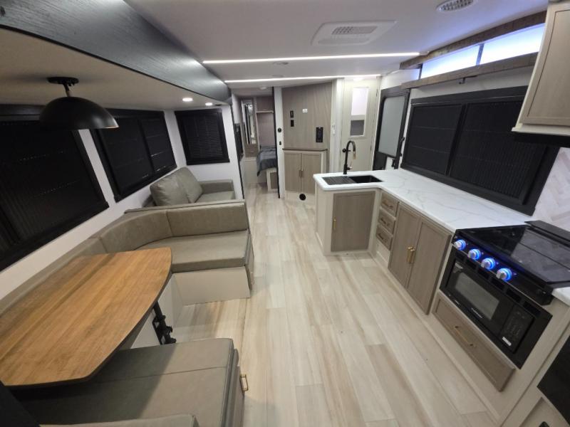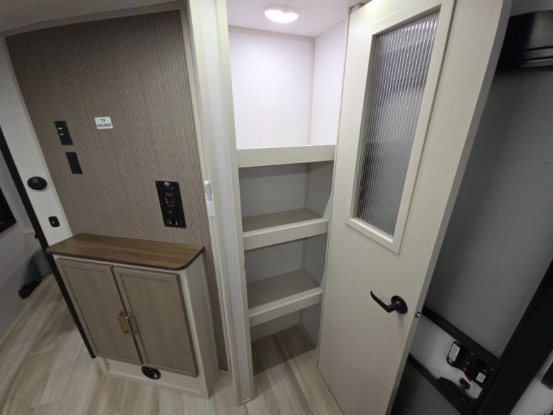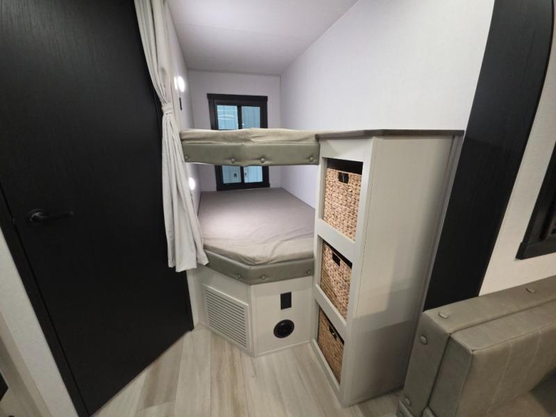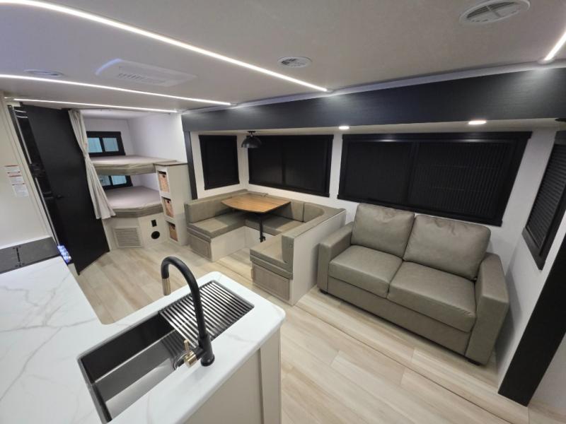 This dual entry travel trailer is the perfect unit to travel with a larger group since there is sleeping for ten! There are double-size bunks in the rear corner, a queen bed in the front private bedroom, plus a U-shaped dinette and tri-fold sofa in the main living area. The rear corner bath includes a shower, a spacious linen closet, and one of the dual entry doors for added convenience. Admire the scenery while cooking thanks to the camp kitchen window with shelf above. This unit also includes an entertainment center with storage below, and the entry pantry will be perfect to keep snacks stocked!