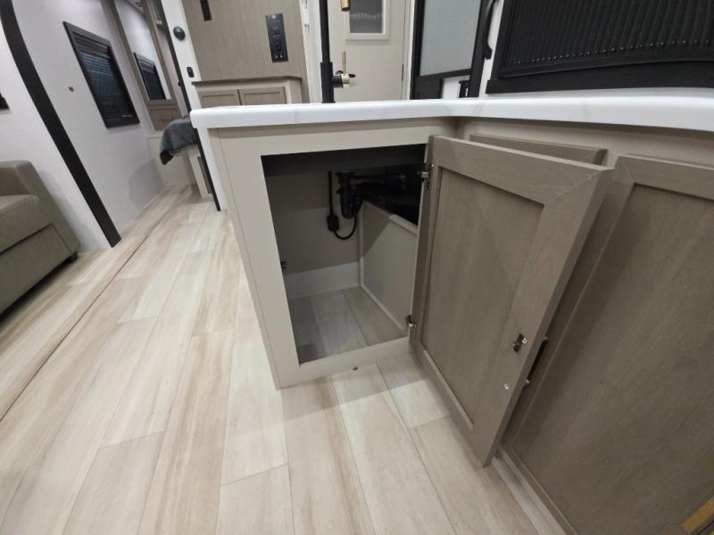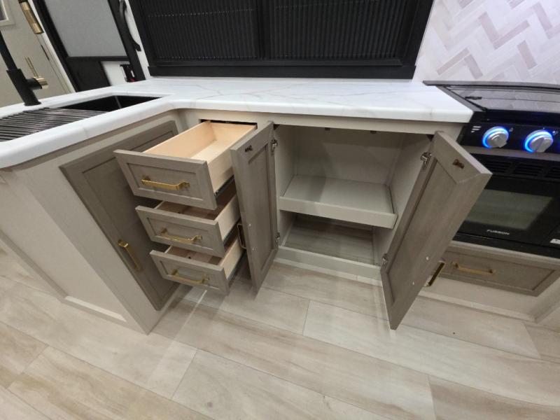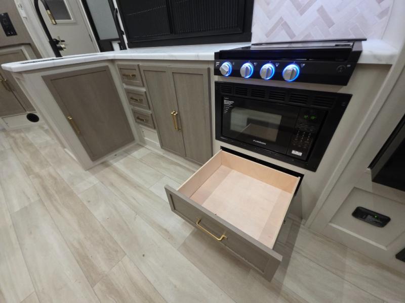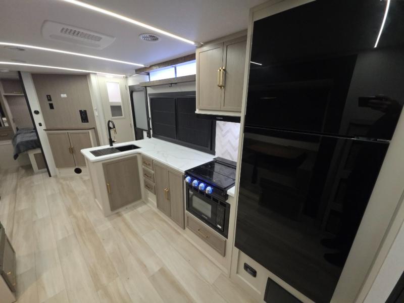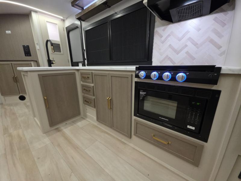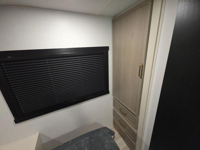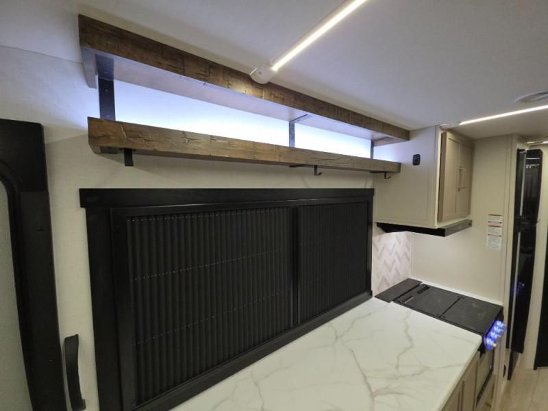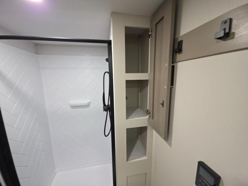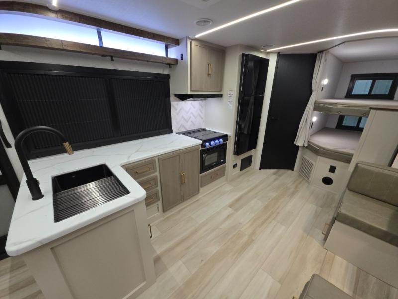 The Wildwood Heritage Glen Hyper-Lyte travel trailer by Forest River offers stability with a wide stance axle system, easy setup with a power tongue jack with an LED docking light, and safe entry with the Step Above aluminum entry steps. The interior includes Temple Cherry cabinetry with matte gold hardware, hidden hinges on the cabinet doors, and a residential single bowl undermount sink. You will also find a back-up camera prep and solar prep, an outdoor shower, and many more exterior conveniences.