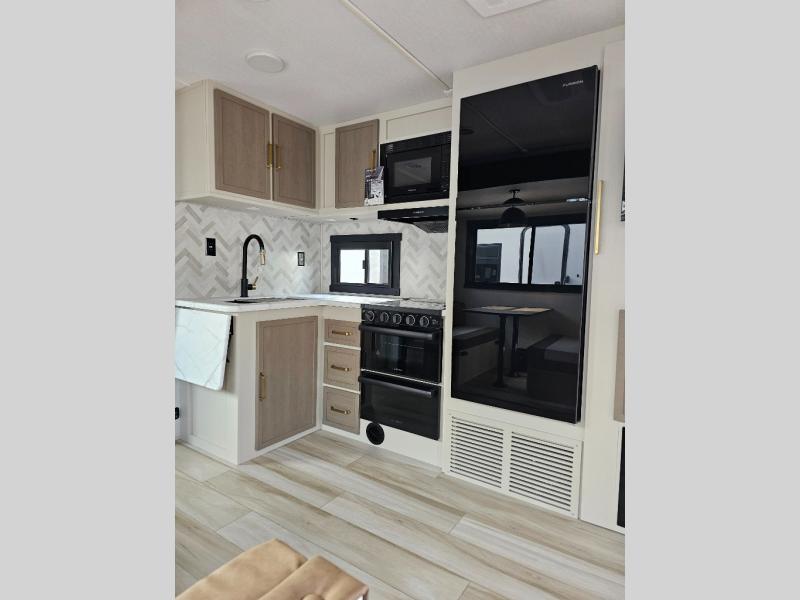 The Wildwood Heritage Glen Hyper-Lyte travel trailer by Forest River offers stability with a wide stance axle system, easy setup with a power tongue jack with an LED docking light, and safe entry with the Step Above aluminum entry steps. The interior includes Temple Cherry cabinetry with matte gold hardware, hidden hinges on the cabinet doors, and a residential single bowl undermount sink. You will also find a back-up camera prep and solar prep, an outdoor shower, Maxxis radial tires, and many more exterior conveniences.