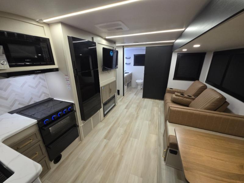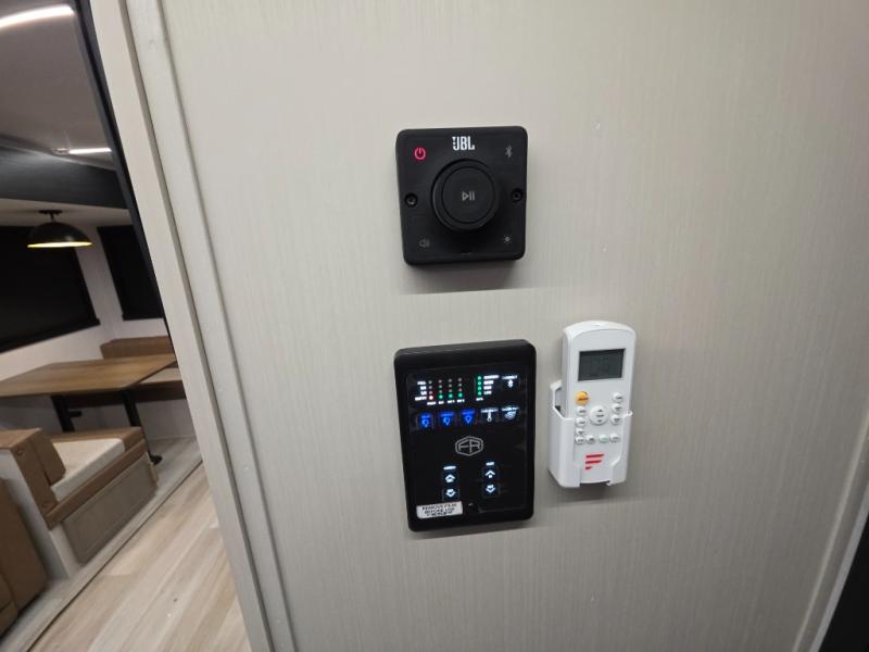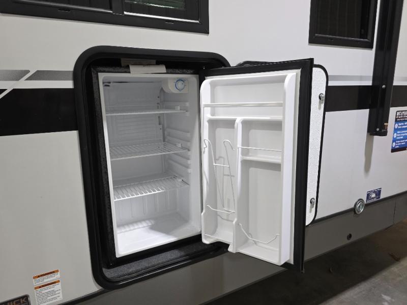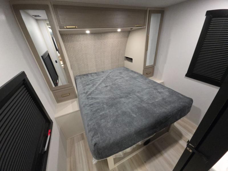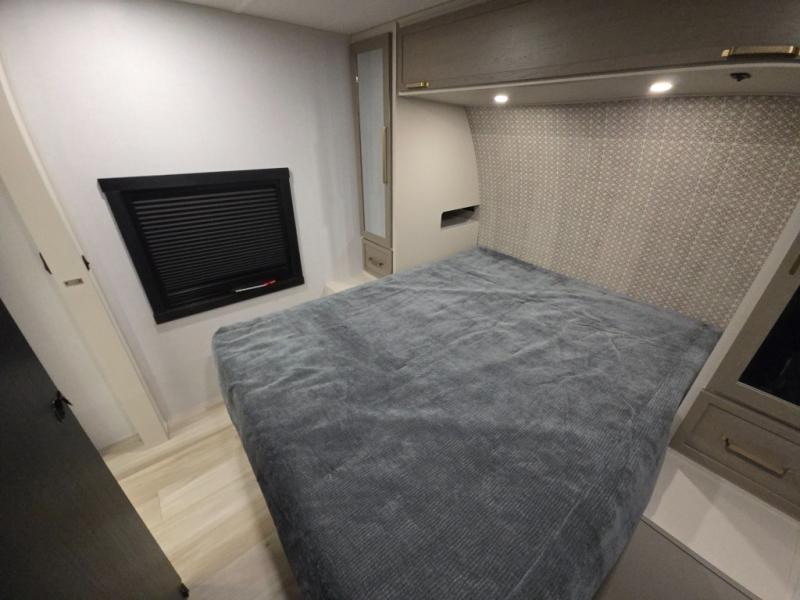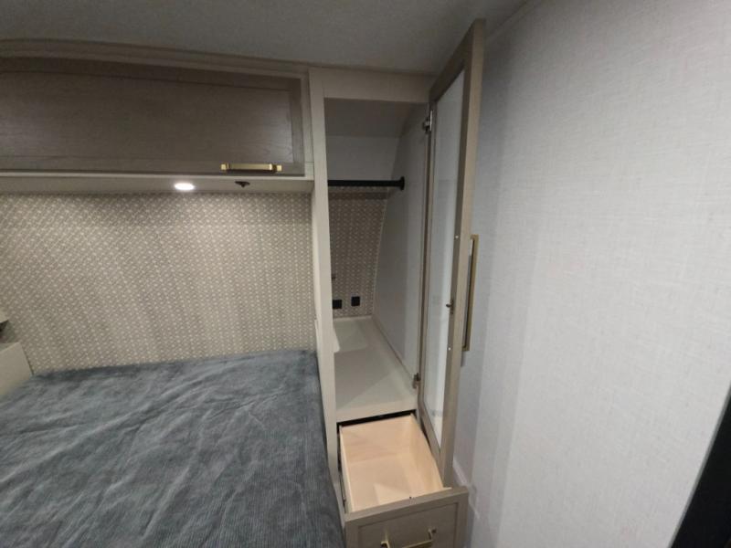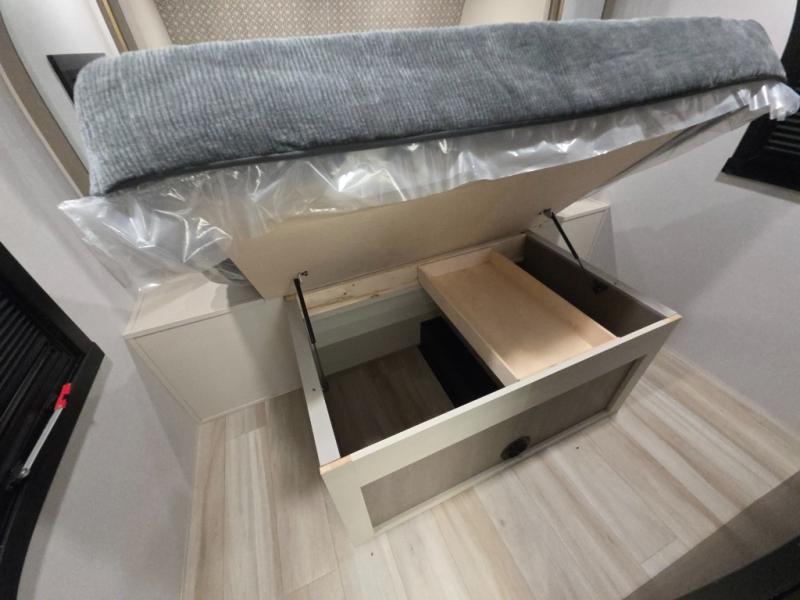 Whether it's a couples night or family night, you can enjoy the spacious living and kitchen area thanks to the large slide out. Grab your favorite snacks from the hidden storage behind the swing-open entertainment center and head to the booth dinette and/or the theater seats with cupholders. You will be able to easily whip up your best meals and clean up even easier with the L-shaped countertop with an extension. The front private bedroom features a queen bed with Versa Tilt to get a good night's rest with wardrobes on either side to keep the room tidy, and the rear bathroom is spacious with a sliding door and two linen closets!