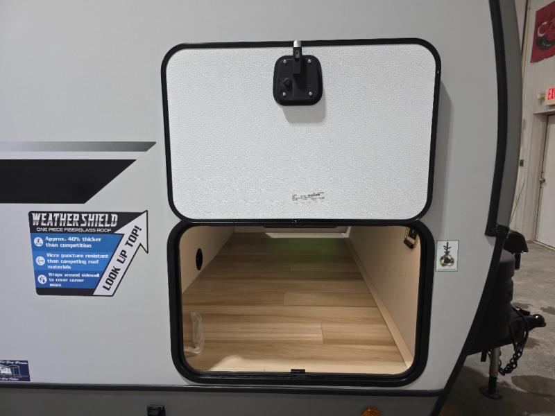 The Wildwood Heritage Glen Hyper-Lyte travel trailer by Forest River offers stability with a wide stance axle system, easy setup with a power tongue jack with an LED docking light, and safe entry with the Step Above aluminum entry steps. The interior includes Temple Cherry cabinetry with matte gold hardware, hidden hinges on the cabinet doors, and a residential single bowl undermount sink. You will also find a back-up camera prep and solar prep, an outdoor shower, Maxxis radial tires, and many more exterior conveniences.