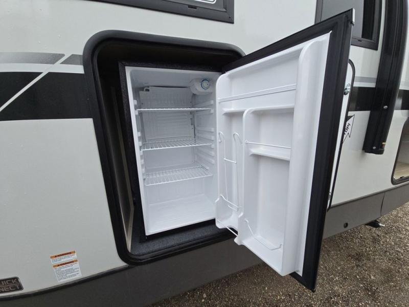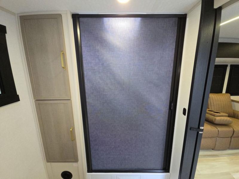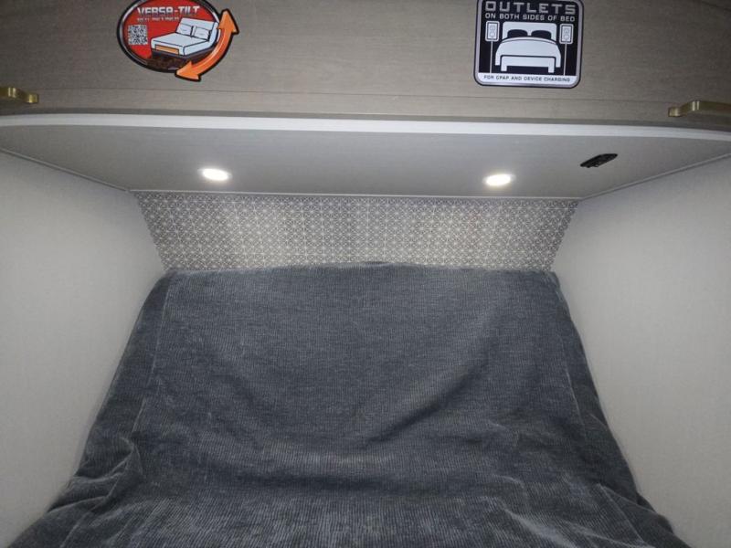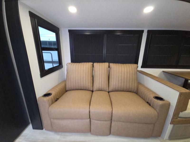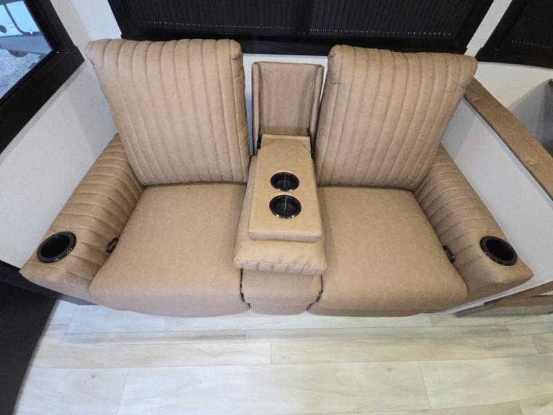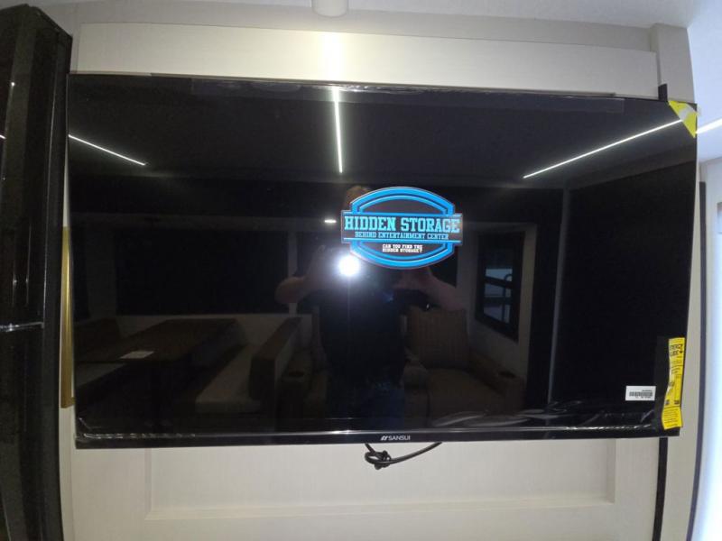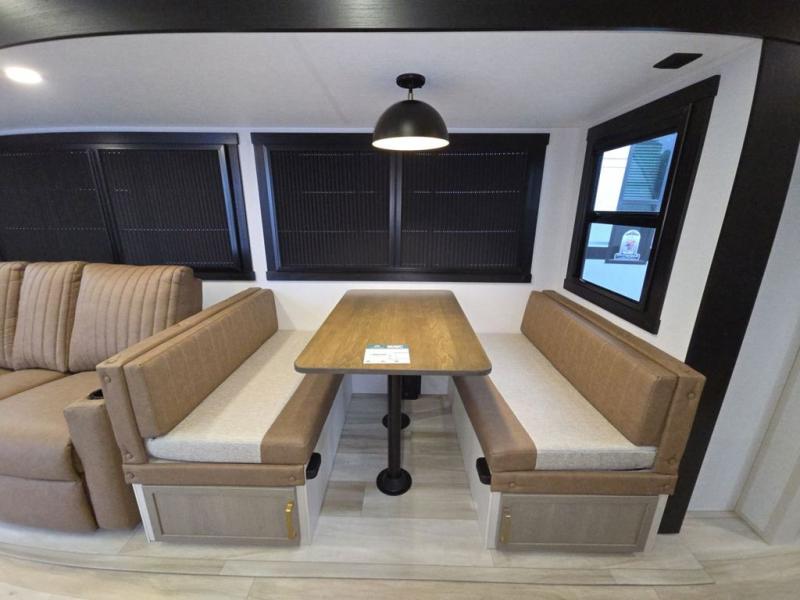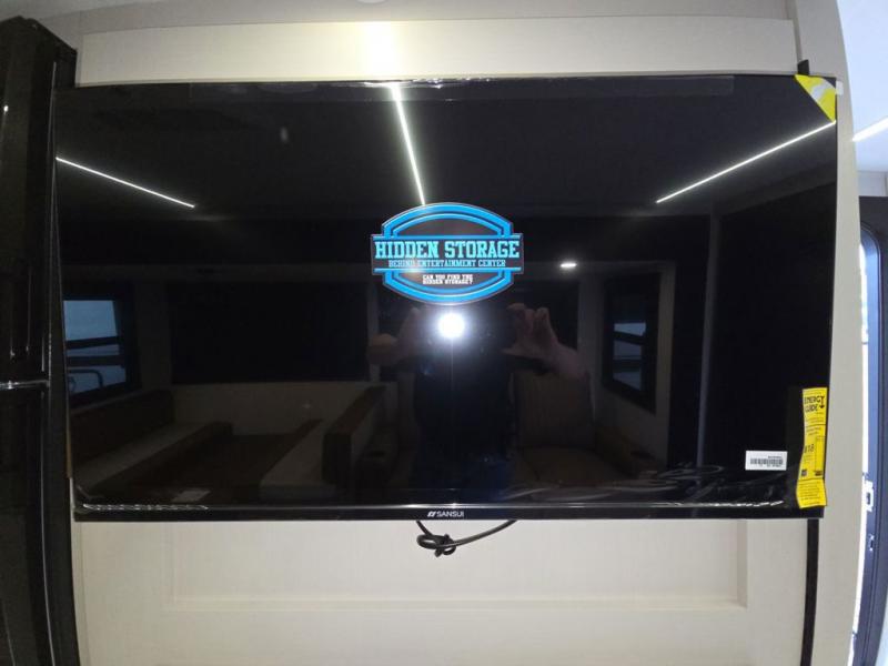 Whether it's a couples night or family night, you can enjoy the spacious living and kitchen area thanks to the large slide out. Grab your favorite snacks from the hidden storage behind the swing-open entertainment center and head to the booth dinette and/or the theater seats with cupholders. You will be able to easily whip up your best meals and clean up even easier with the L-shaped countertop with an extension. The front private bedroom features a queen bed with Versa Tilt to get a good night's rest with wardrobes on either side to keep the room tidy, and the rear bathroom is spacious with a sliding door and two linen closets!