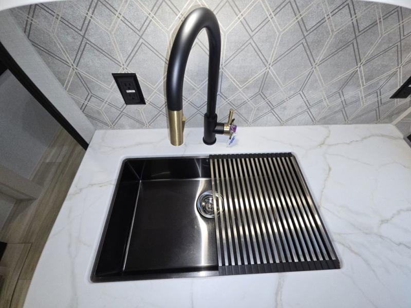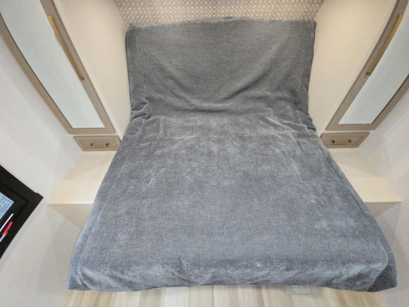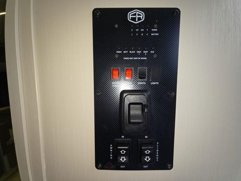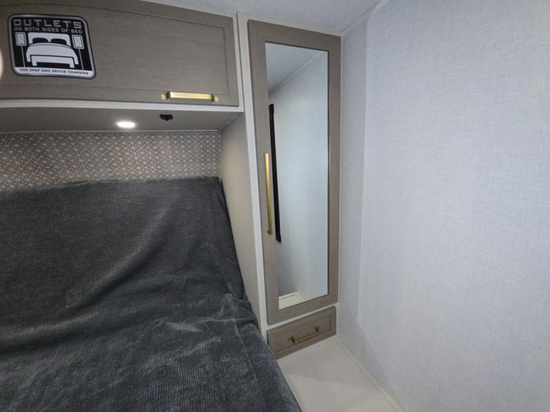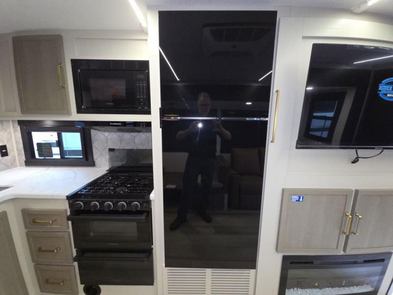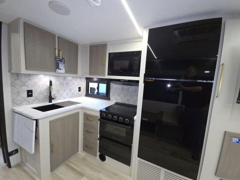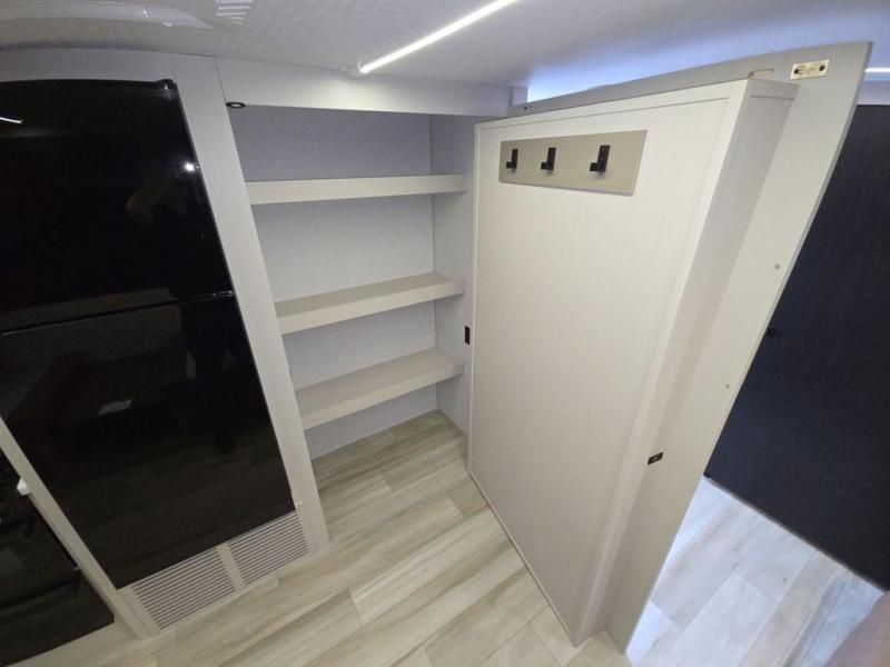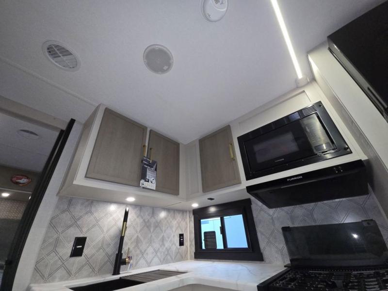 Whether it's a couples night or family night, you can enjoy the spacious living and kitchen area thanks to the large slide out. Grab your favorite snacks from the hidden storage behind the swing-open entertainment center and head to the booth dinette and/or the theater seats with cupholders. You will be able to easily whip up your best meals and clean up even easier with the L-shaped countertop with an extension. The front private bedroom features a queen bed with Versa Tilt to get a good night's rest with wardrobes on either side to keep the room tidy, and the rear bathroom is spacious with a sliding door and two linen closets!