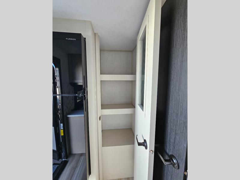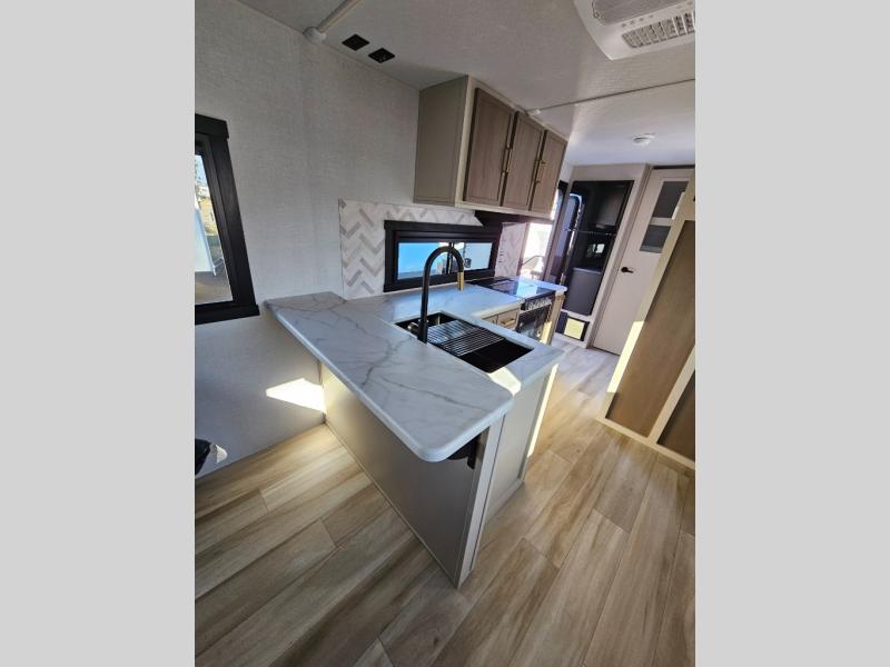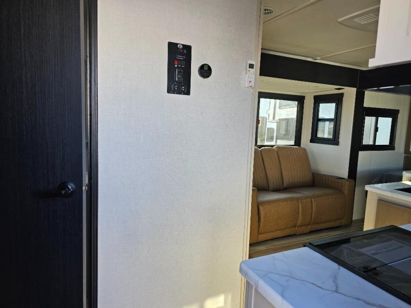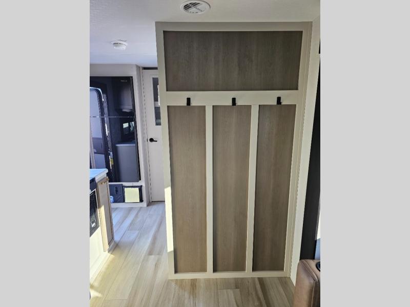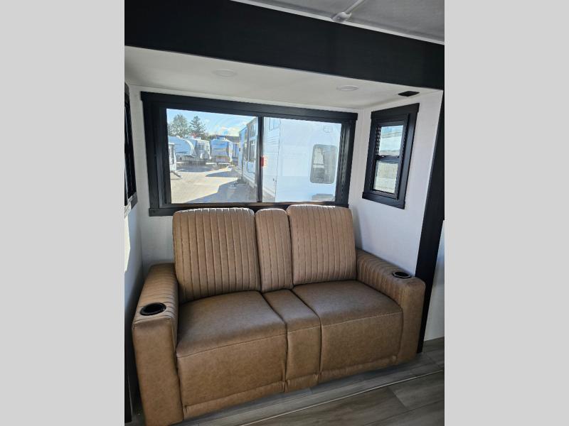 Whether it's a couples night or family night, you can enjoy the spacious living and kitchen area thanks to the large slide out. Grab your favorite snacks from the hidden storage behind the swing-open entertainment center and head to the booth dinette and/or the theater seats with cupholders. You will be able to easily whip up your best meals and clean up even easier with the L-shaped countertop with an extension. The front private bedroom features a queen bed with Versa Tilt to get a good night's rest with wardrobes on either side to keep the room tidy, and the rear bathroom is spacious with a sliding door and two linen closets!