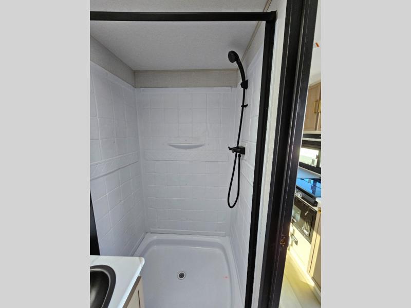 The Wildwood Heritage Glen Hyper-Lyte travel trailer by Forest River offers stability with a wide stance axle system, easy setup with a power tongue jack with an LED docking light, and safe entry with the Step Above aluminum entry steps. The interior includes Temple Cherry cabinetry with matte gold hardware, hidden hinges on the cabinet doors, and a residential single bowl undermount sink. You will also find a back-up camera prep and solar prep, an outdoor shower, Maxxis radial tires, and many more exterior conveniences.