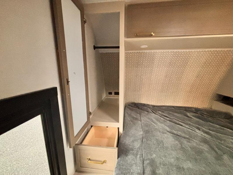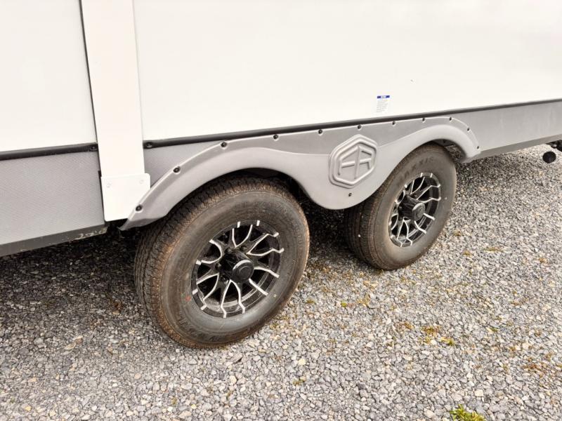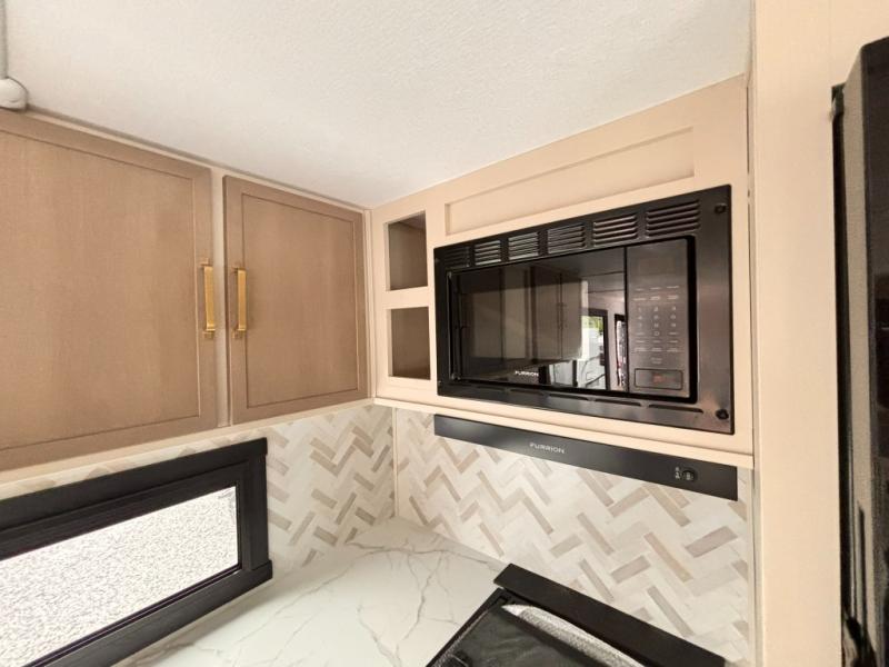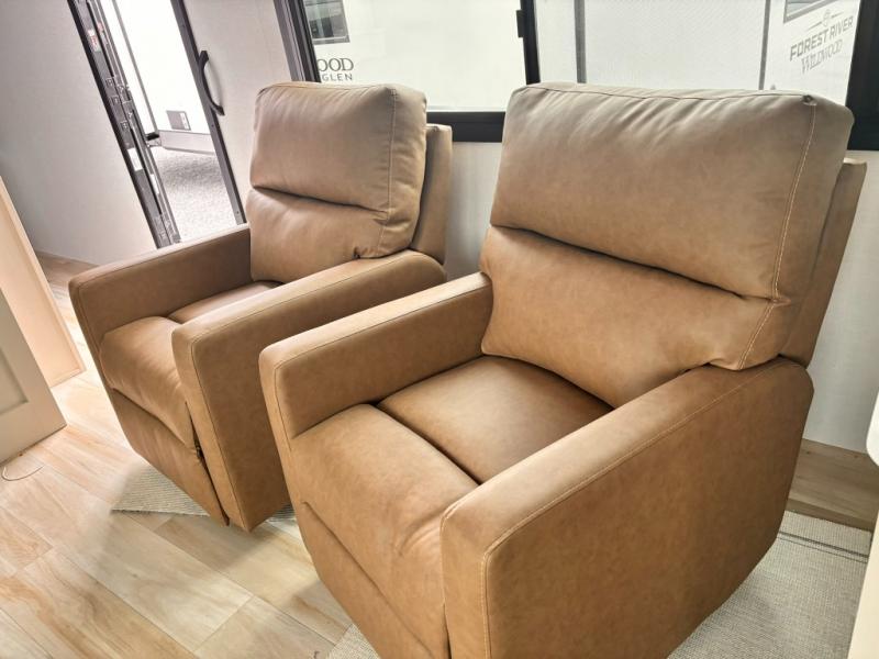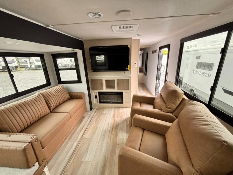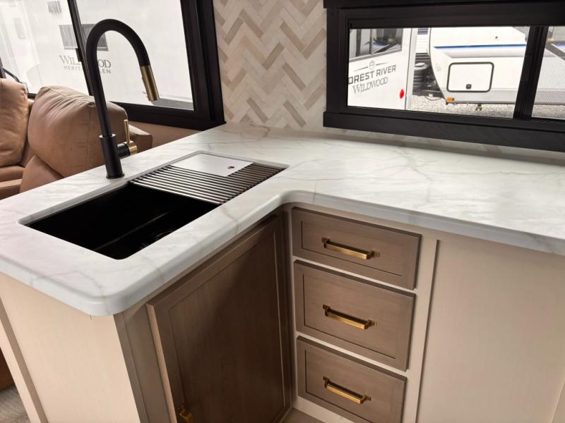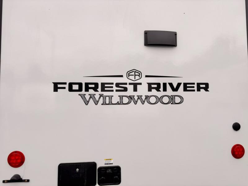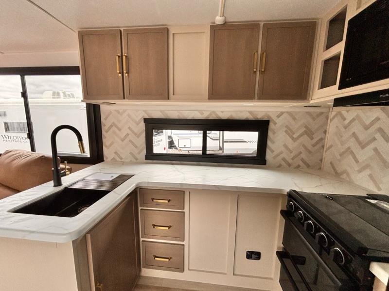The Wildwood Heritage Glen Hyper-Lyte travel trailer by Forest River offers stability with a wide stance axle system, easy setup with a power tongue jack with an LED docking light, and safe entry with the Step Above aluminum entry steps. The interior includes Temple Cherry cabinetry with matte gold hardware, hidden hinges on the cabinet doors, and a residential single bowl undermount sink. You will also find a back-up camera prep and solar prep, an outdoor shower, Maxxis radial tires, and many more exterior conveniences.