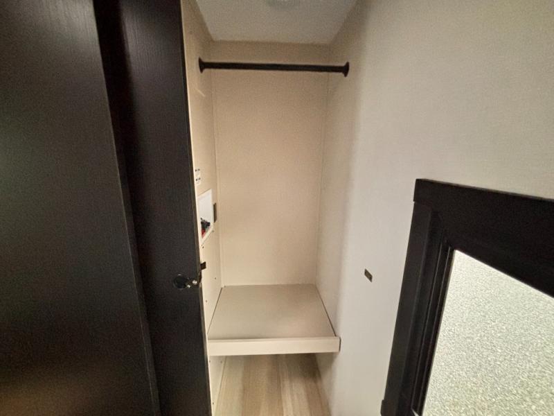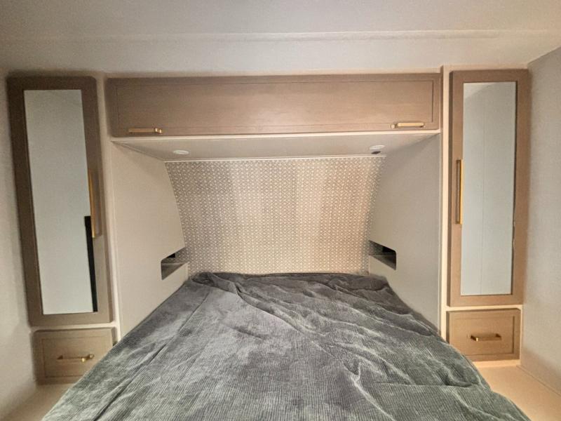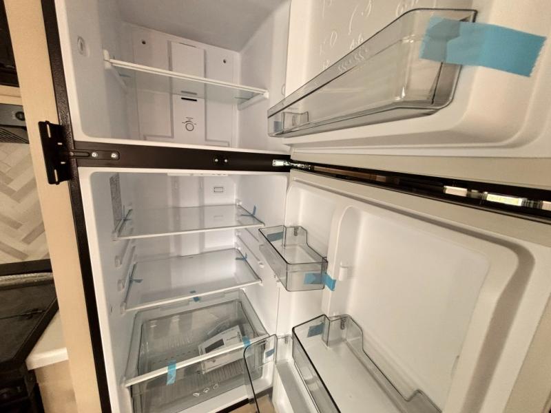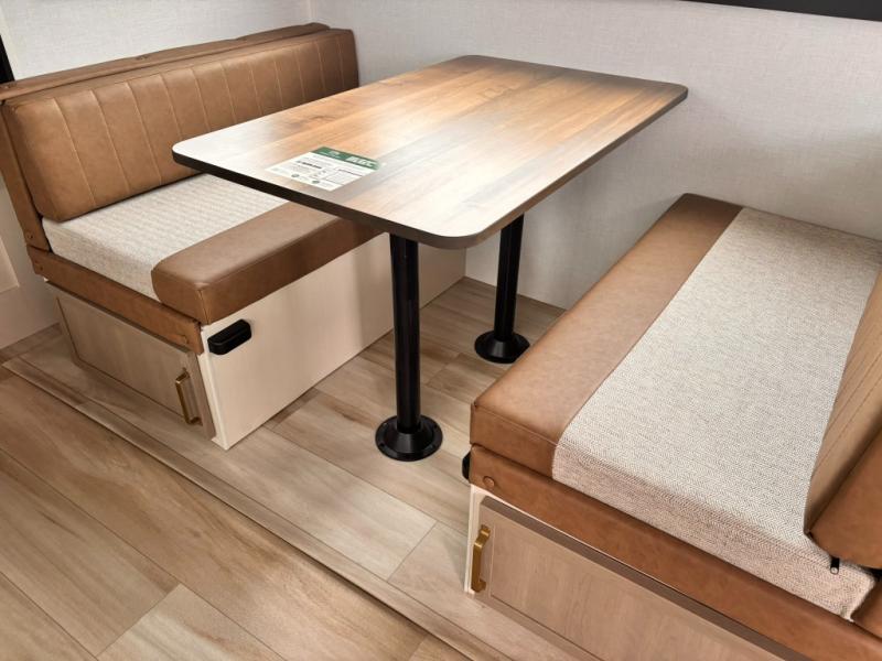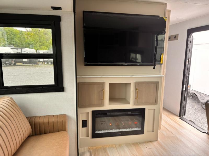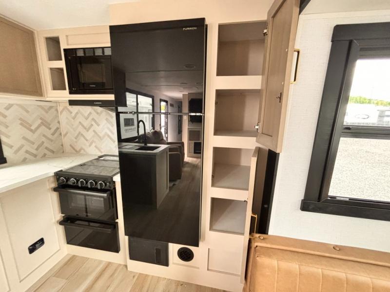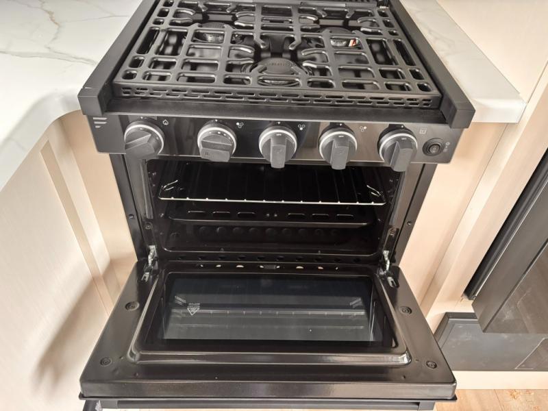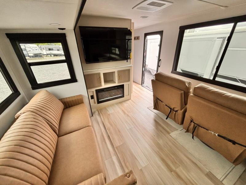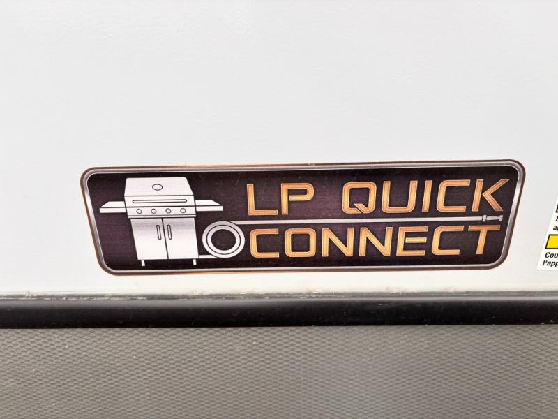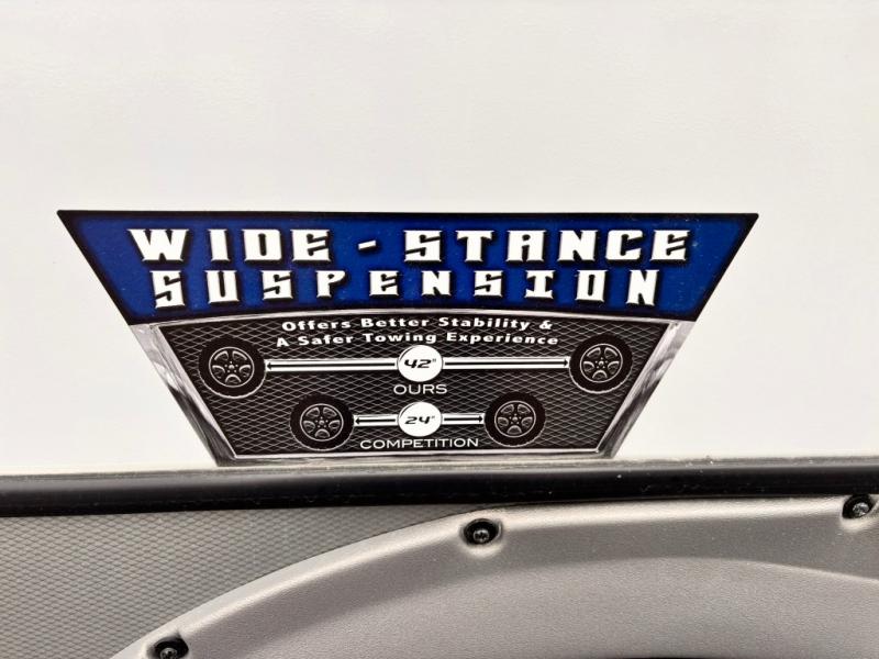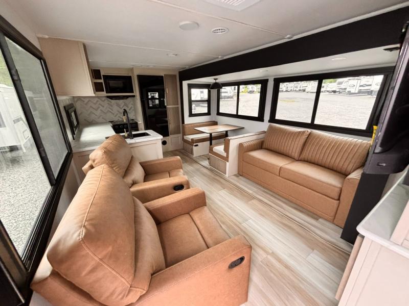 Camping trips just got better with this travel trailer in tow! You can cook in the rear kitchen with a three burner range, microwave oven, and a 10 cu. ft. 12V refrigerator. There is also a U-shaped counter to prep all your meals and a pantry to keep snacks close by. Your crew can relax on the tri-fold sofa or booth dinette within the large slide out, and there is an entertainment center with a 40" TV for movie night. Clean up each day in the spacious full bath, then head to the front private bedroom with a walk-around queen bed with Versa-Tilt. There are also dual wardrobes and a closet with washer and dryer prep. Head outdoors to find the 20' power awning, XL Texas size pass-through storage, and exterior griddle!