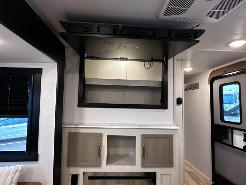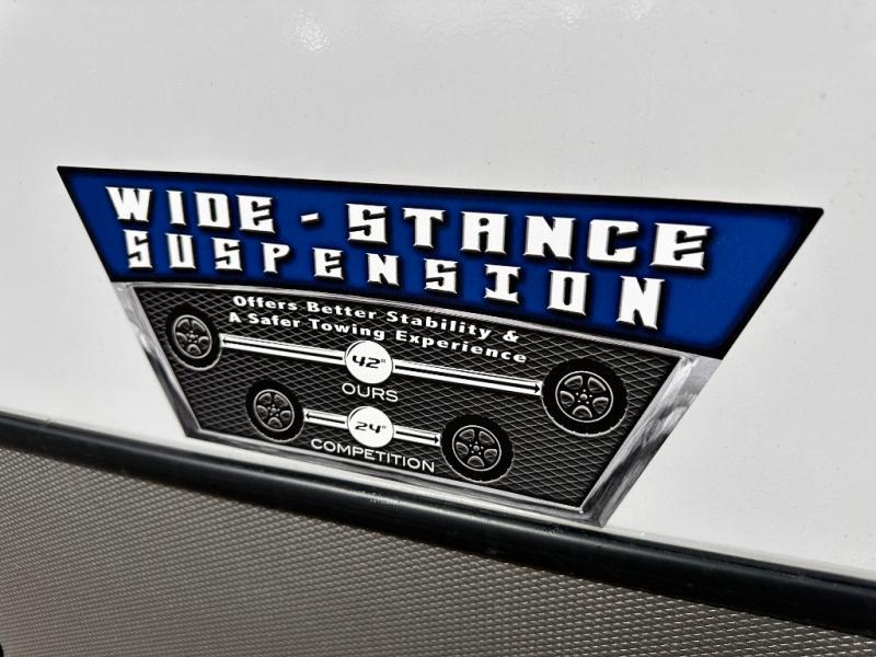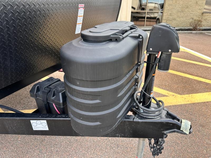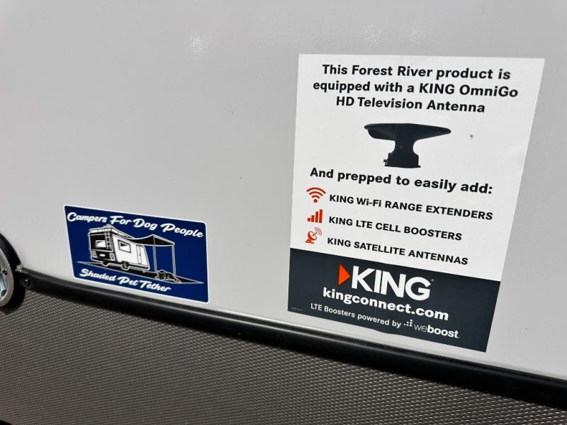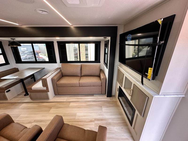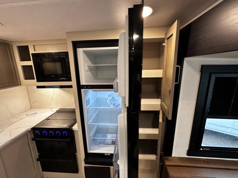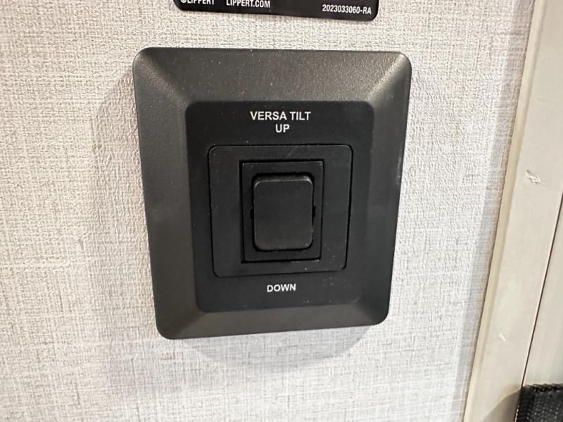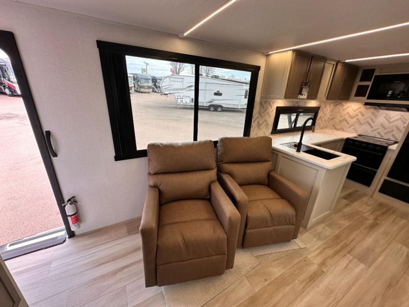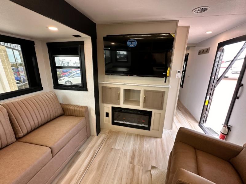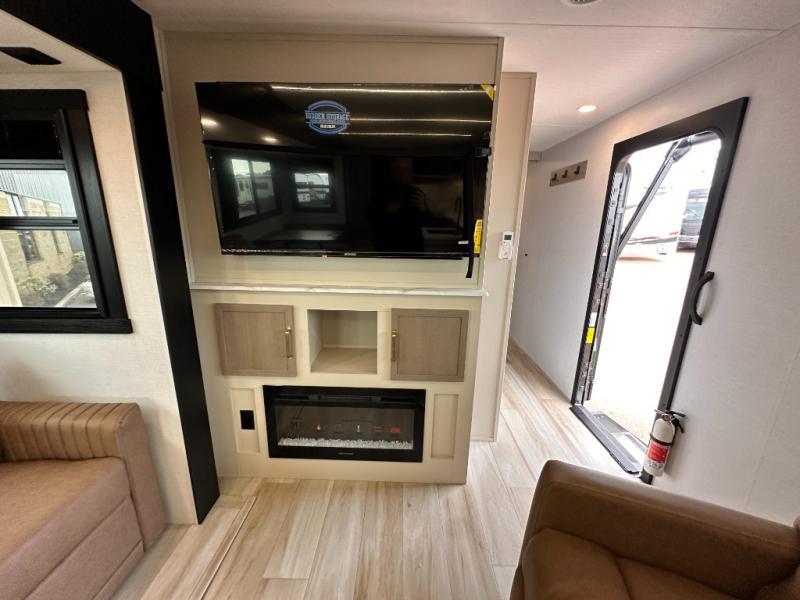 Camping trips just got better with this travel trailer in tow! You can cook in the rear kitchen with a three burner range, microwave oven, and a 10 cu. ft. 12V refrigerator. There is also a U-shaped counter to prep all your meals and a pantry to keep snacks close by. Your crew can relax on the tri-fold sofa or booth dinette within the large slide out, and there is an entertainment center with a 40" TV for movie night. Clean up each day in the spacious full bath, then head to the front private bedroom with a walk-around queen bed with Versa-Tilt. There are also dual wardrobes and a closet with washer and dryer prep. Head outdoors to find the 20' power awning, XL Texas size pass-through storage, and exterior griddle!