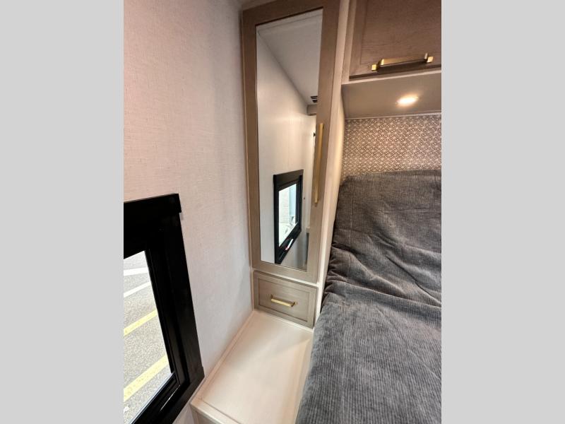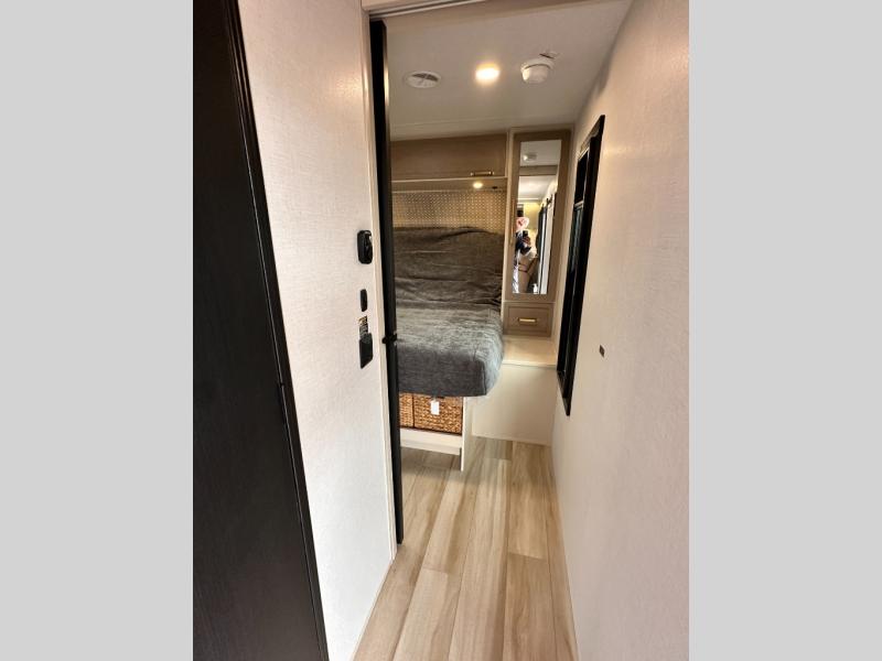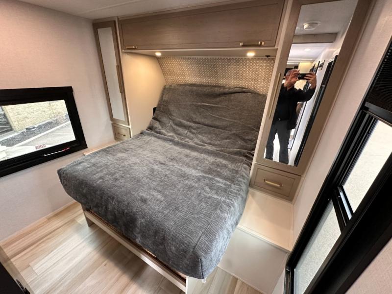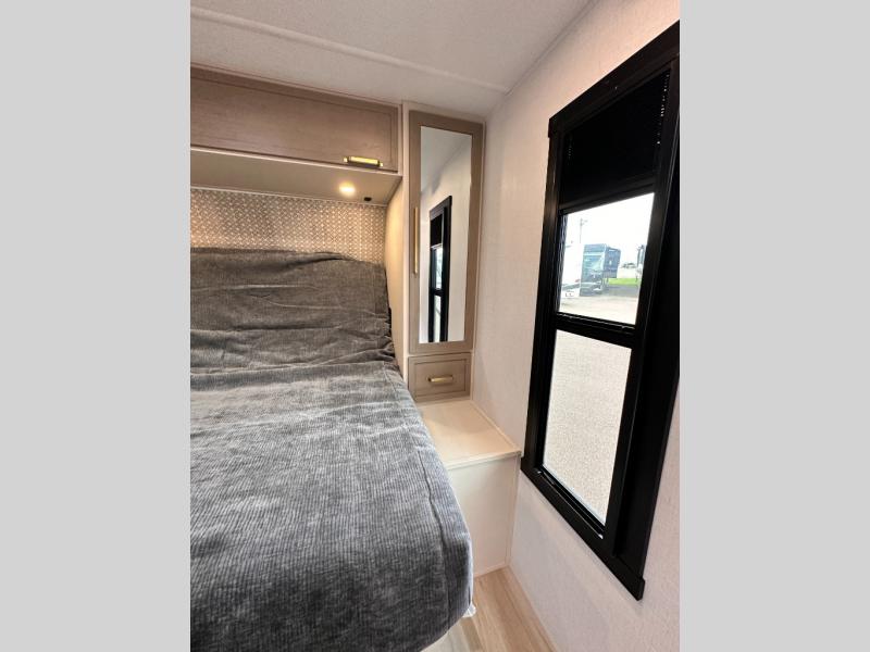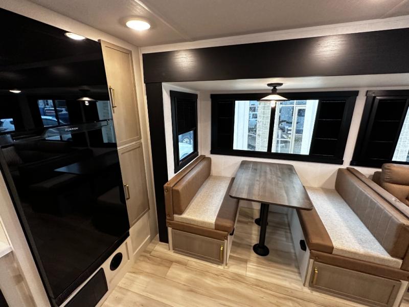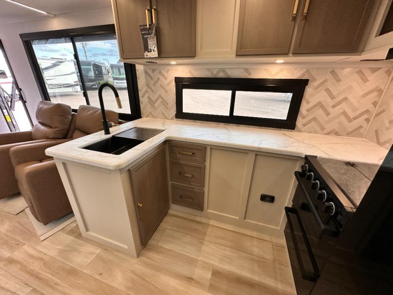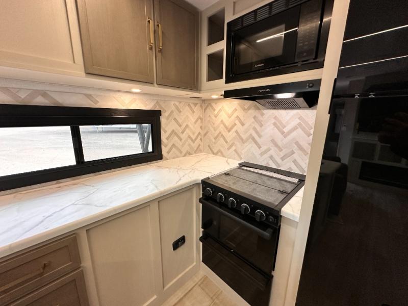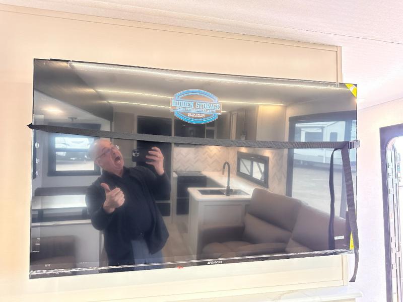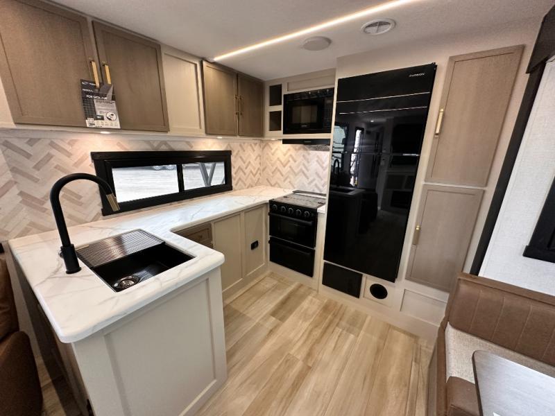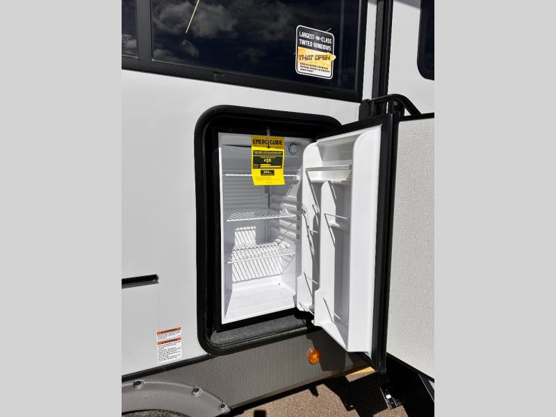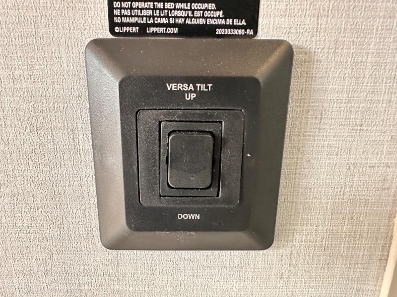 Camping trips just got better with this travel trailer in tow! You can cook in the rear kitchen with a three burner range, microwave oven, and a 10 cu. ft. 12V refrigerator. There is also a U-shaped counter to prep all your meals and a pantry to keep snacks close by. Your crew can relax on the tri-fold sofa or booth dinette within the large slide out, and there is an entertainment center with a 40" TV for movie night. Clean up each day in the spacious full bath, then head to the front private bedroom with a walk-around queen bed with Versa-Tilt. There are also dual wardrobes and a closet with washer and dryer prep. Head outdoors to find the 20' power awning, XL Texas size pass-through storage, and exterior griddle!